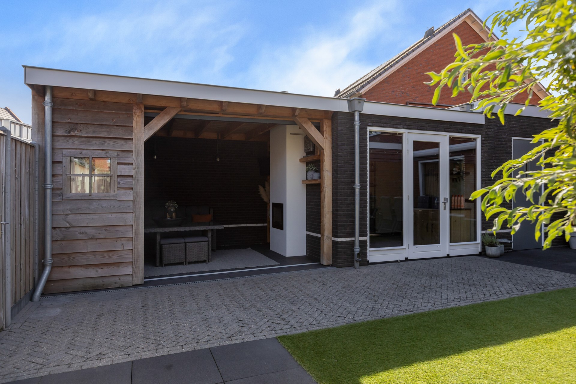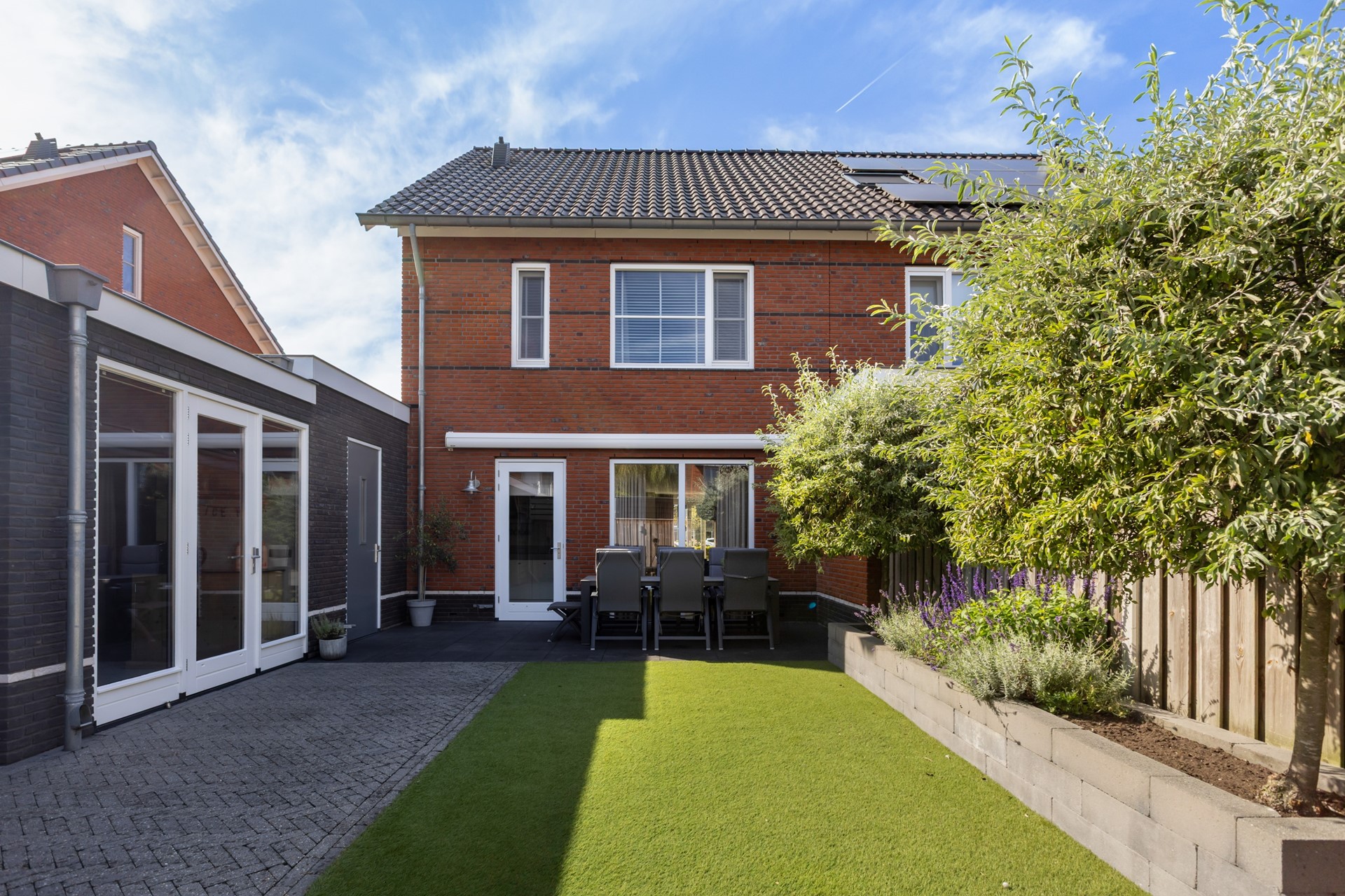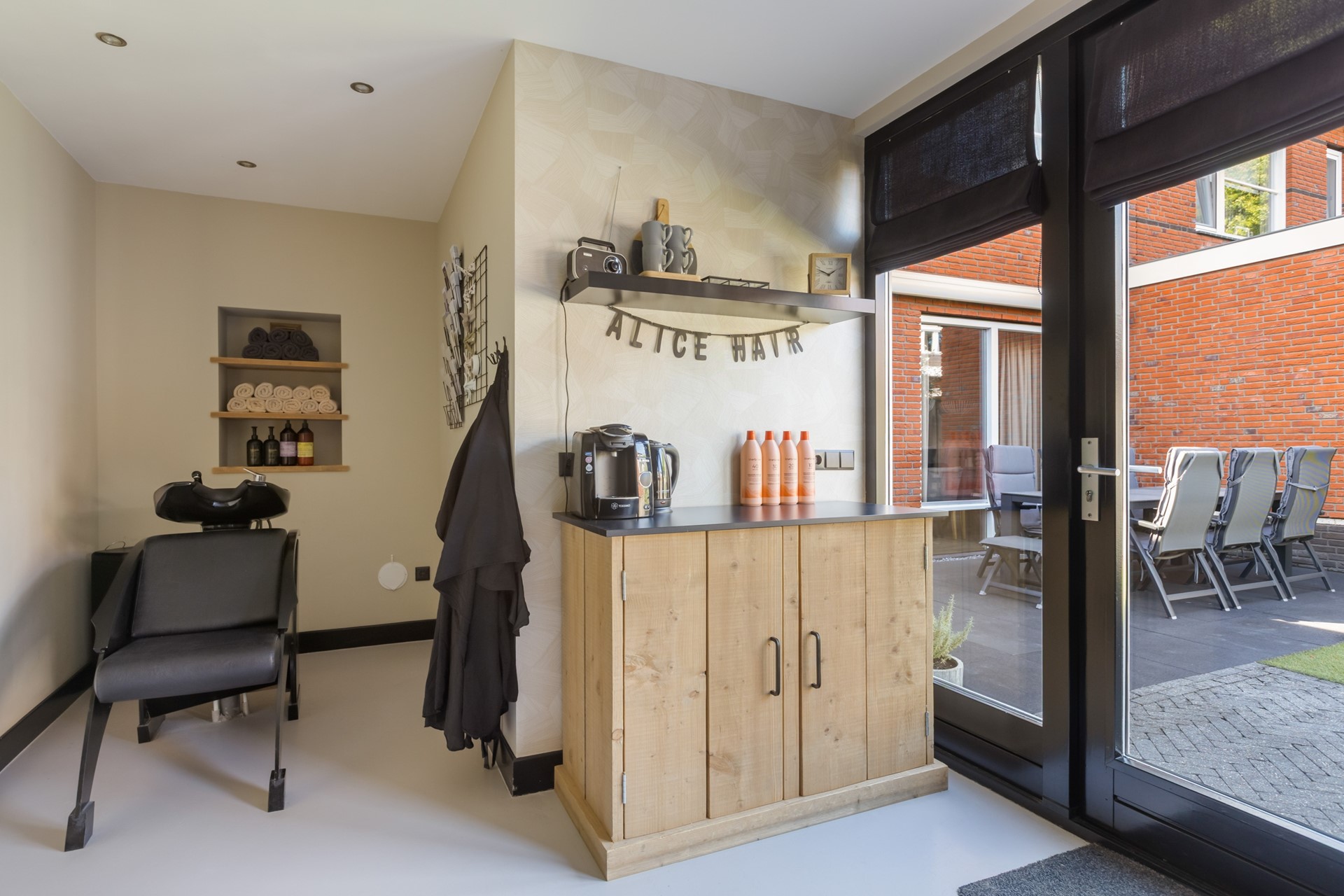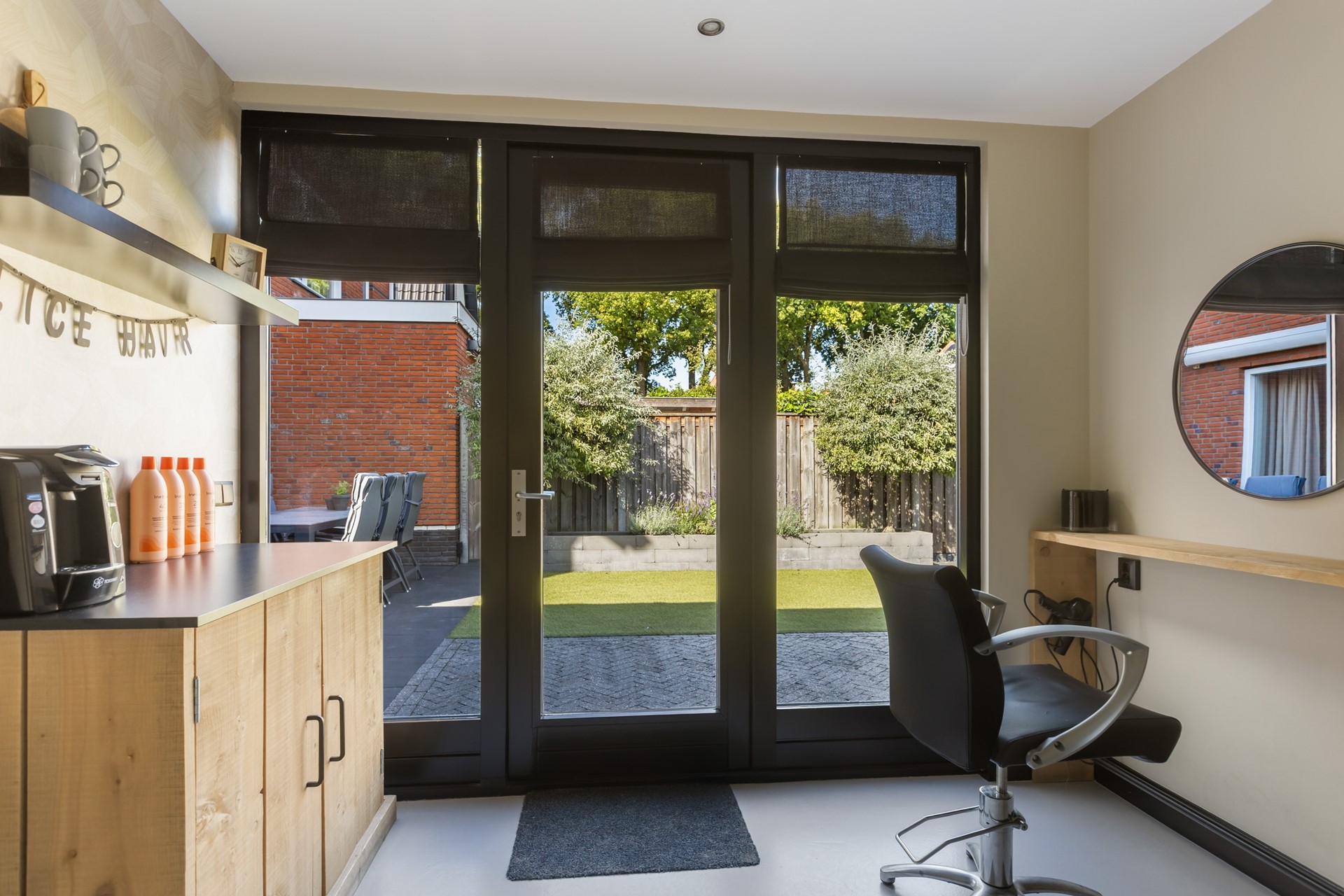 De onderhoudsvriendelijke achtertuin is oostelijk gelegen en ingericht met (sier)bestrating, groene borders en een gazon. In de veranda met gaskachel is een fijne plek gecreëerd om optimaal van het buitenleven te genieten. In de voormalige garage is een kapsalon ingericht, compleet met vloerverwarming, eigen cv-installatie en wateraansluiting, waardoor deze ruimte ook uitstekend geschikt is als thuiswerkplek of hobbyruimte. Daarnaast is er een aparte garage voor extra bergruimte. De tuin is zowel via deze garage als via de achterpoort bereikbaar. Naast een eigen oprit is er in de wijk ook voldoende parkeergelegenheid. Aan de overzijde van de woning is er tot slot een fijne speelruimte voor kinderen.