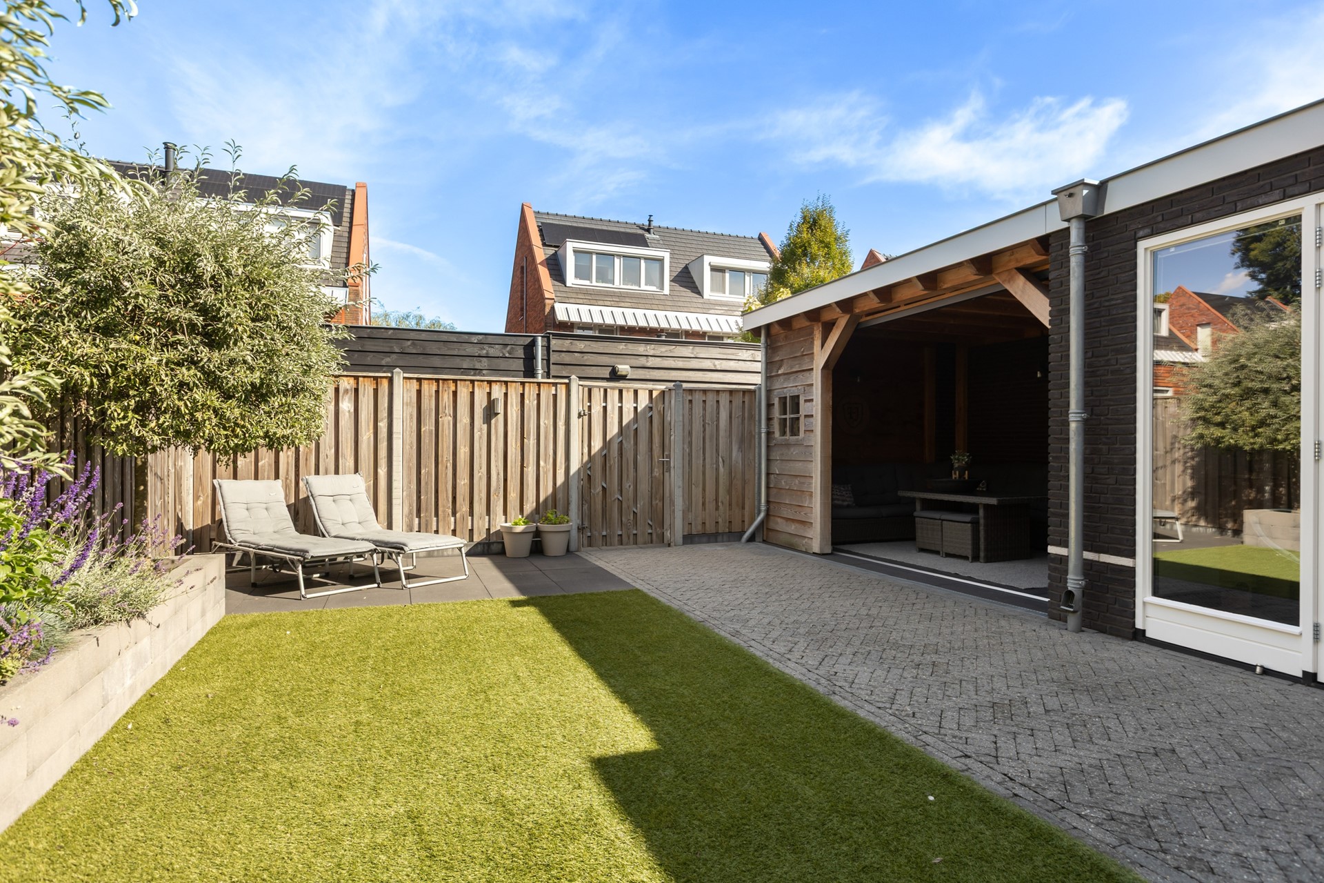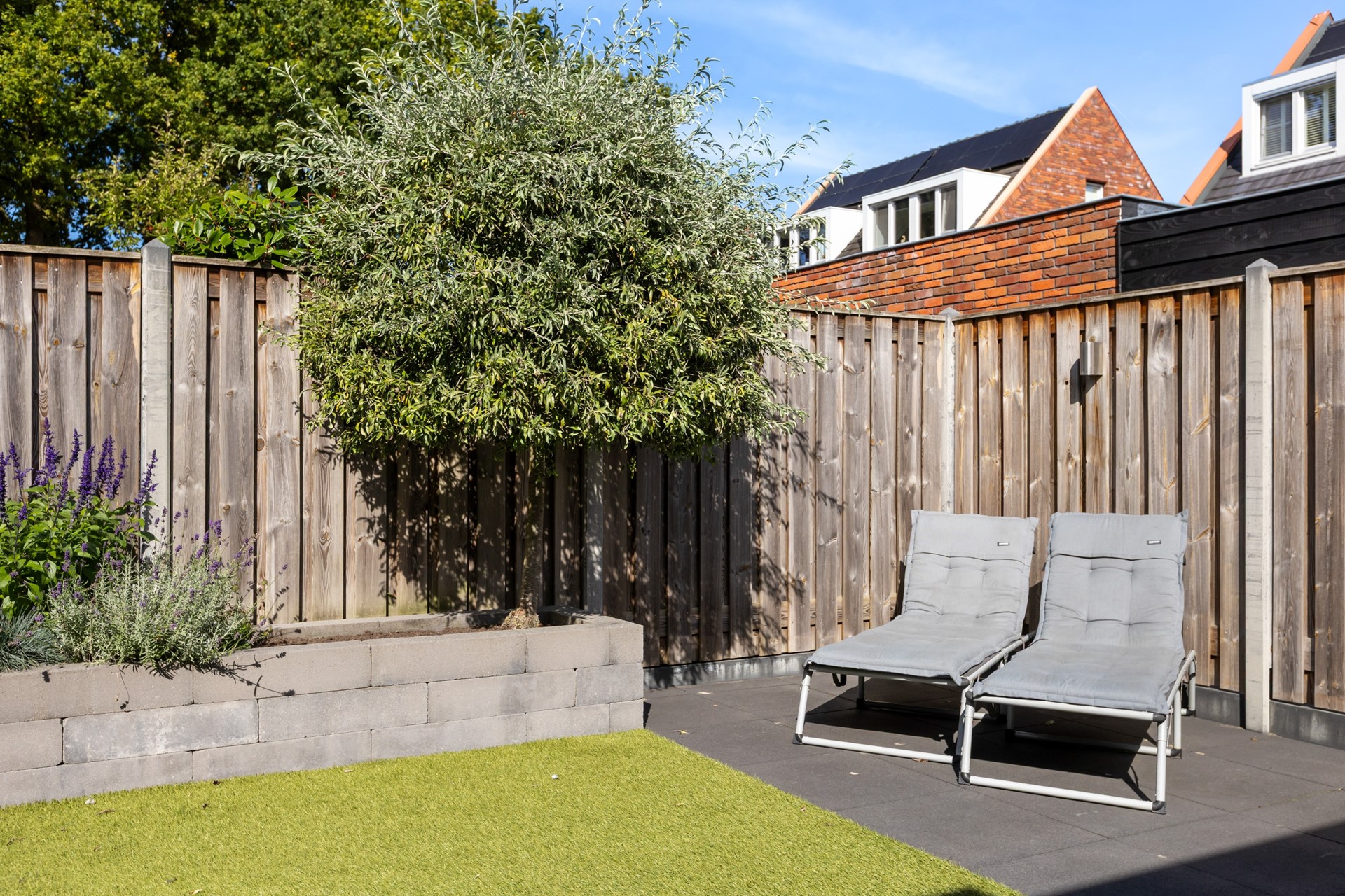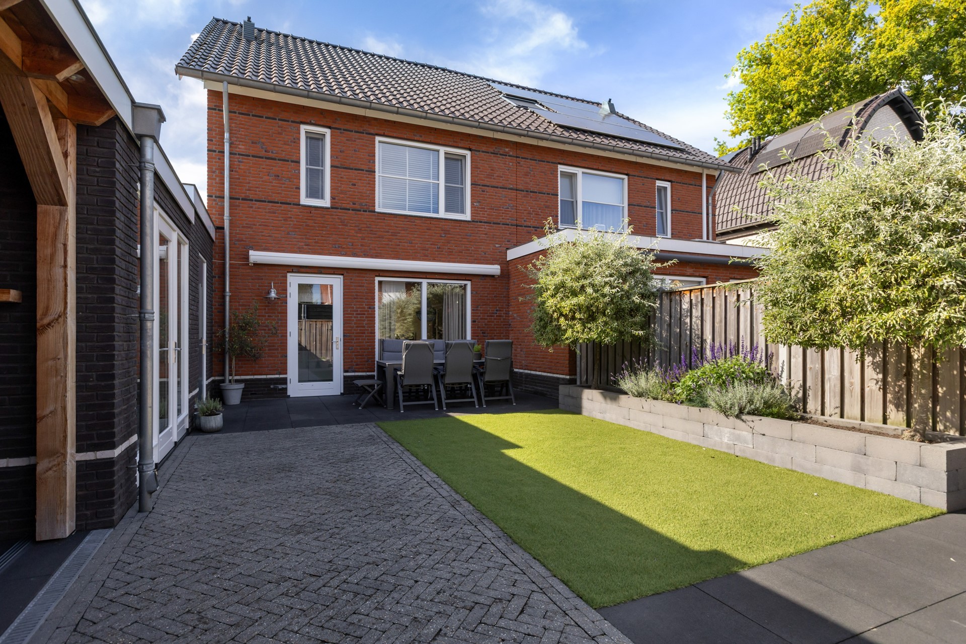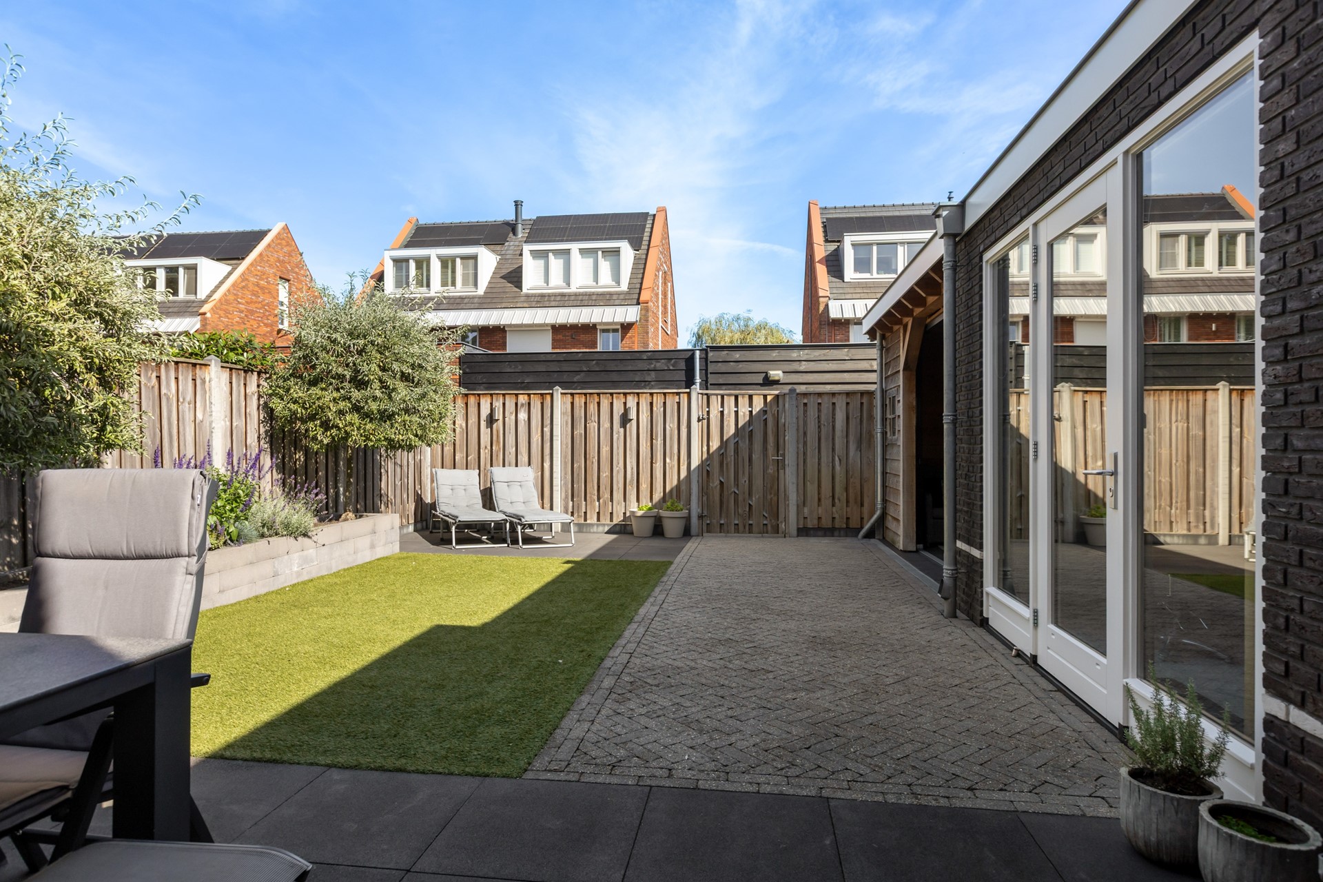 De onderhoudsvriendelijke achtertuin is oostelijk gelegen en ingericht met (sier)bestrating, groene borders en een gazon. In de veranda met gaskachel is een fijne plek gecreëerd om optimaal van het buitenleven te genieten. In de voormalige garage is een kapsalon ingericht, compleet met vloerverwarming, eigen cv-installatie en wateraansluiting, waardoor deze ruimte ook uitstekend geschikt is als thuiswerkplek of hobbyruimte. Daarnaast is er een aparte garage voor extra bergruimte. De tuin is zowel via deze garage als via de achterpoort bereikbaar. Naast een eigen oprit is er in de wijk ook voldoende parkeergelegenheid. Aan de overzijde van de woning is er tot slot een fijne speelruimte voor kinderen.