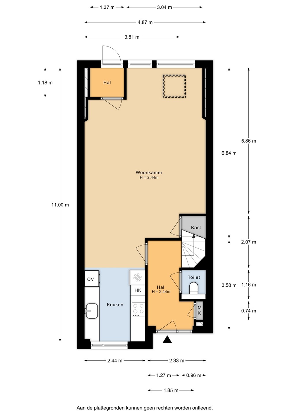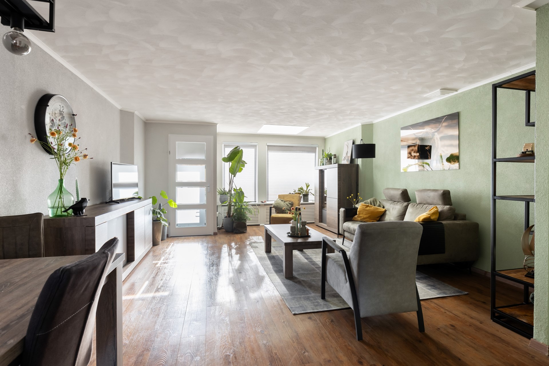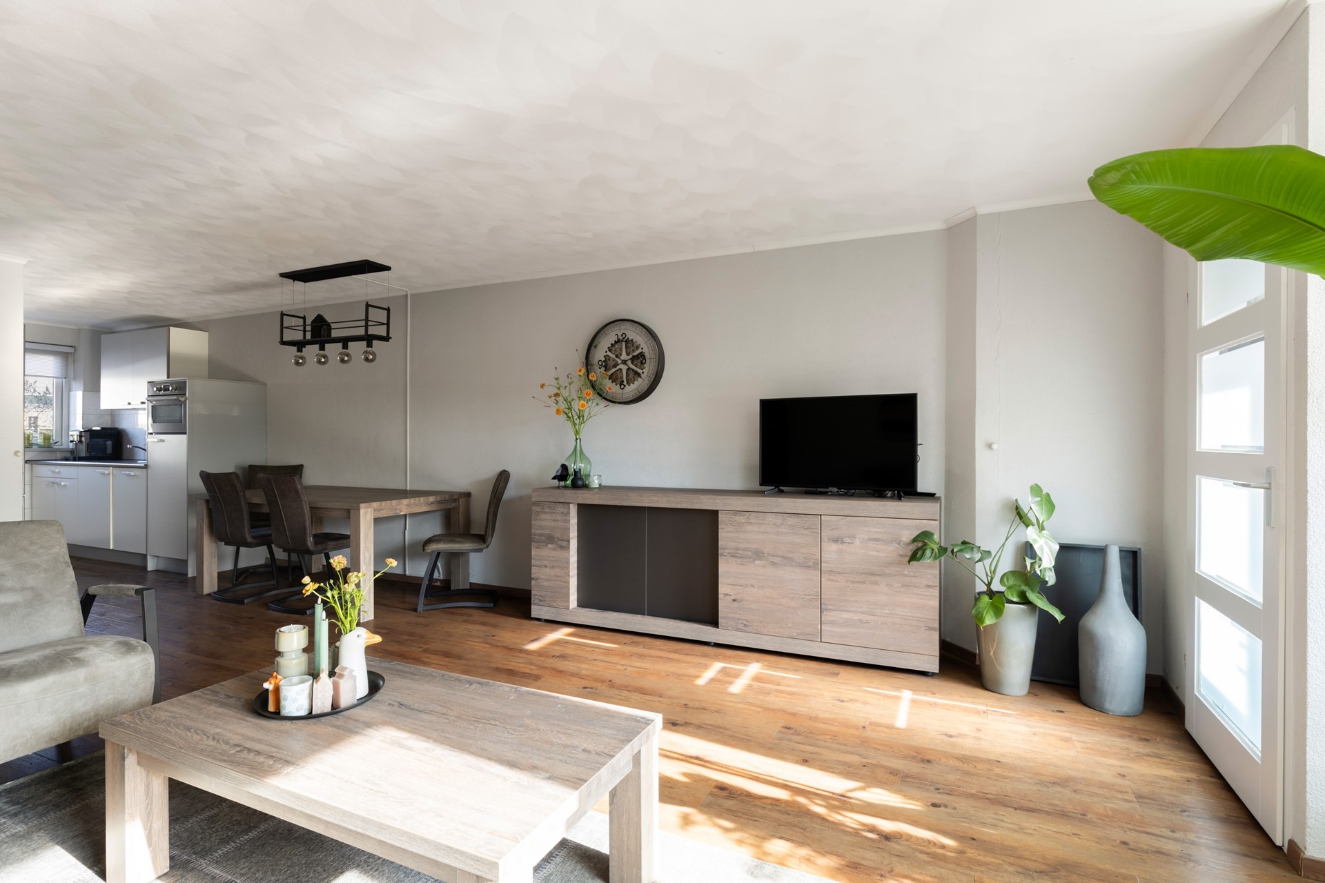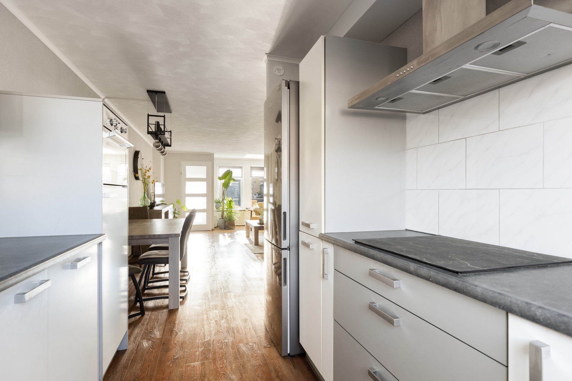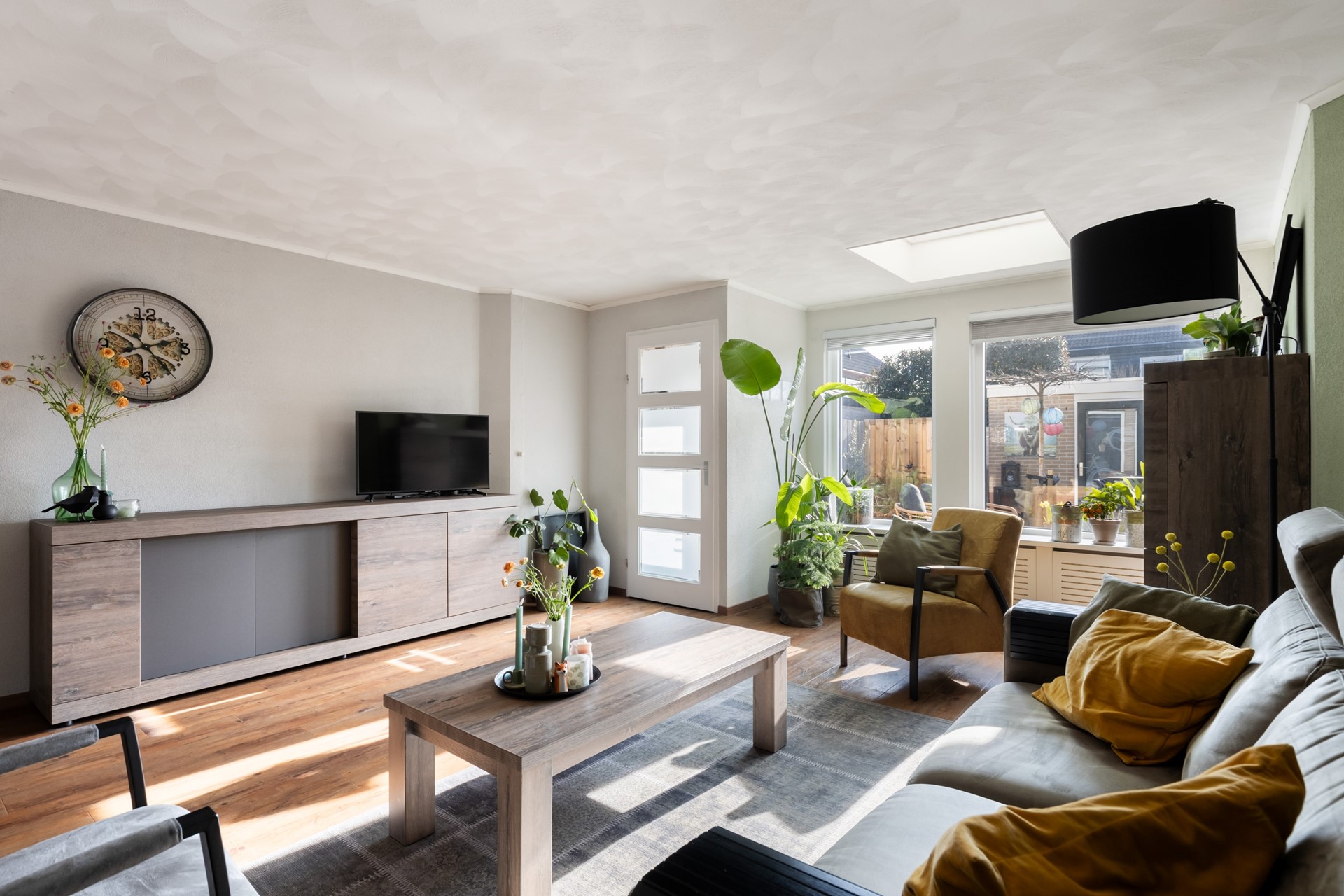 Bij binnenkomst in de hal tref je direct de meterkast (voorzien van glasvezelaansluiting), de toiletruimte met wandcloset en fonteintje en de trapopgang naar de eerste verdieping. Vervolgens stap je de uitgebouwde woonkamer binnen. Deze is tuingericht, waardoor je een prettig uitzicht op de achtertuin hebt en geniet van een mooie lichtinval dankzij de grote raampartijen en de lichtkoepel. De keuken bevindt zich aan de voorzijde van de woning en is opgesteld in een rechte opstelling. De keuken is voorzien van een inductiekookplaat, afzuigkap, vaatwasser en oven. Via het achterportaal bereik je eenvoudig de achtertuin. De gehele begane grond is afgewerkt met een onderhoudsvriendelijke pvc-vloer.