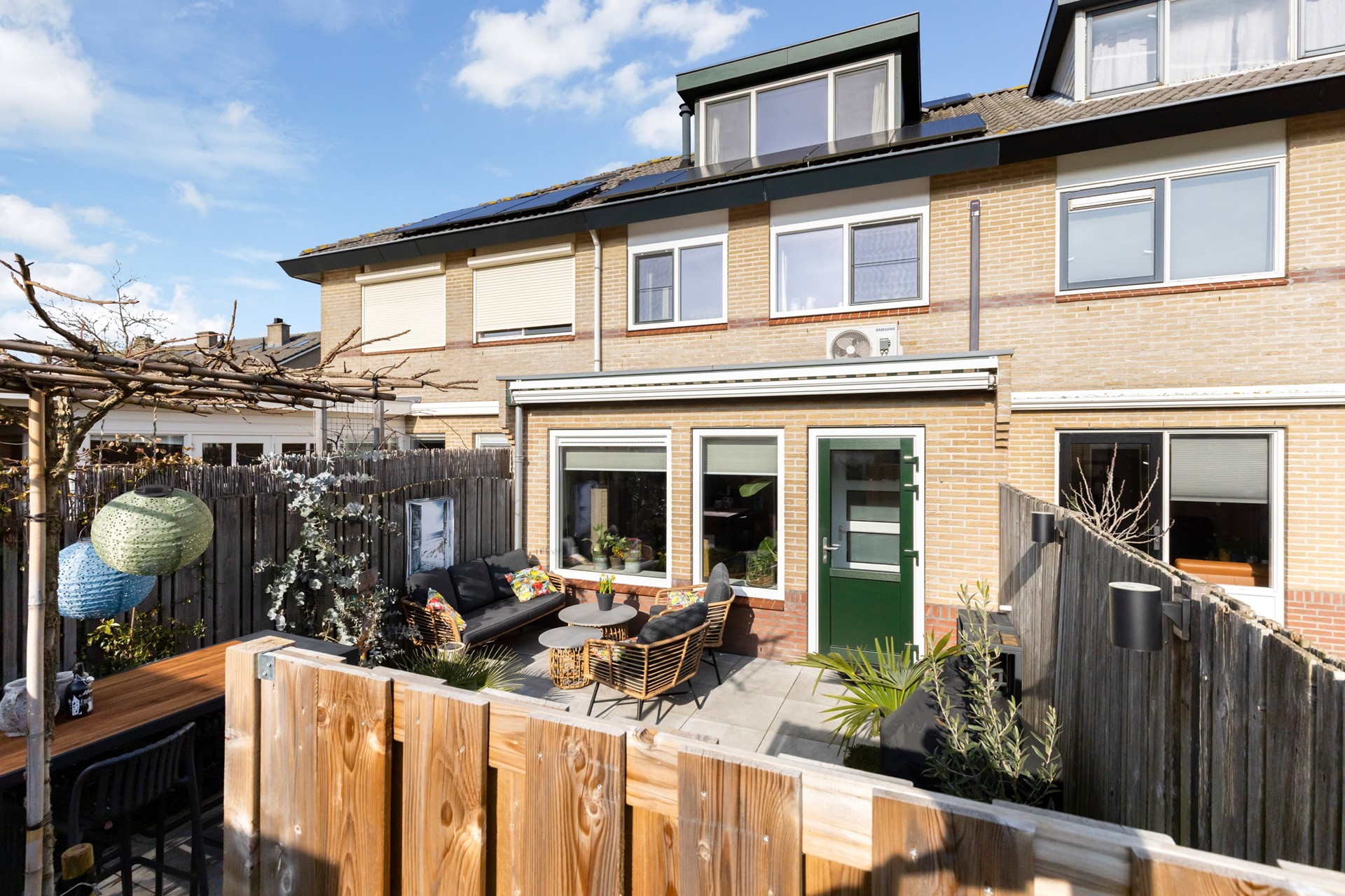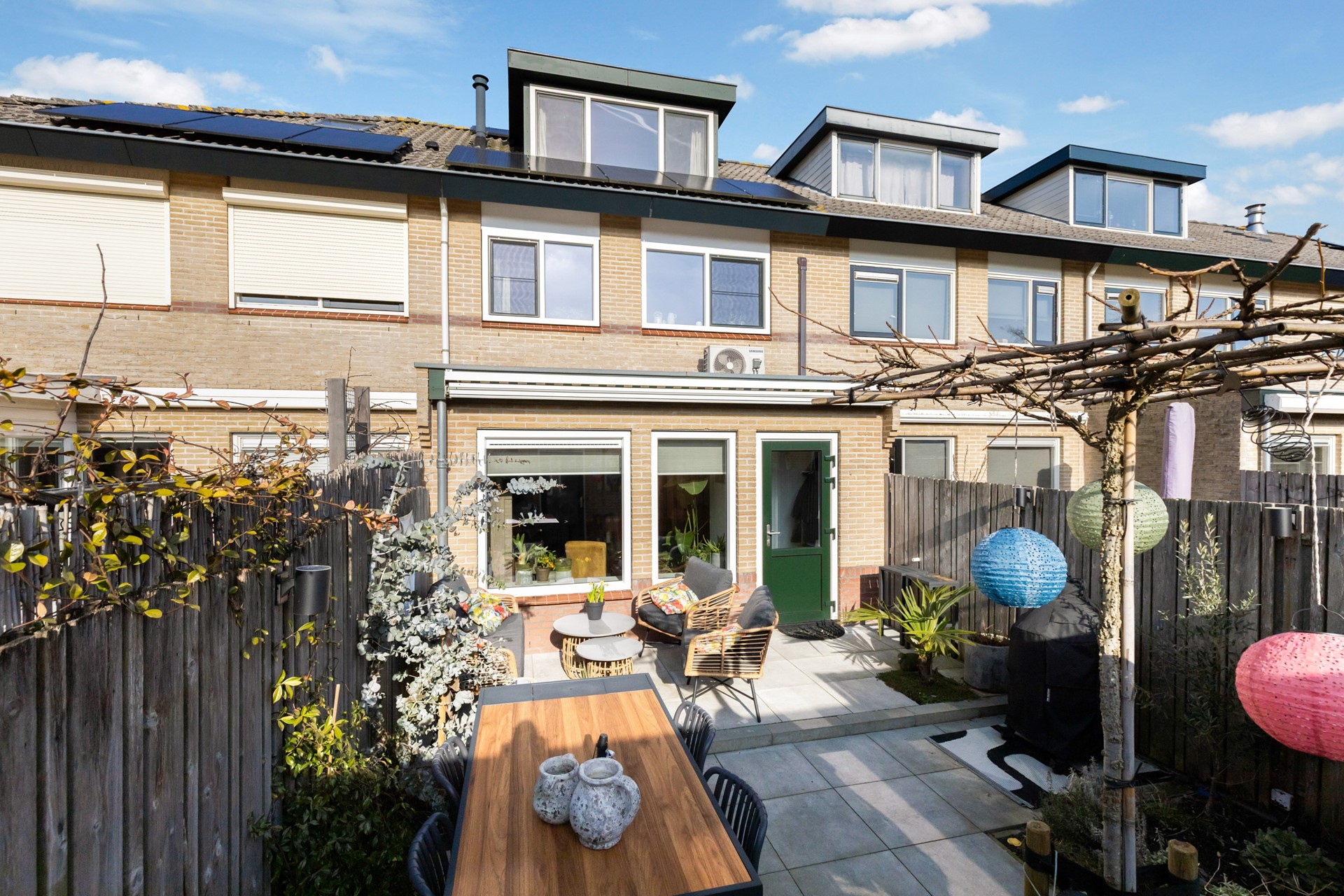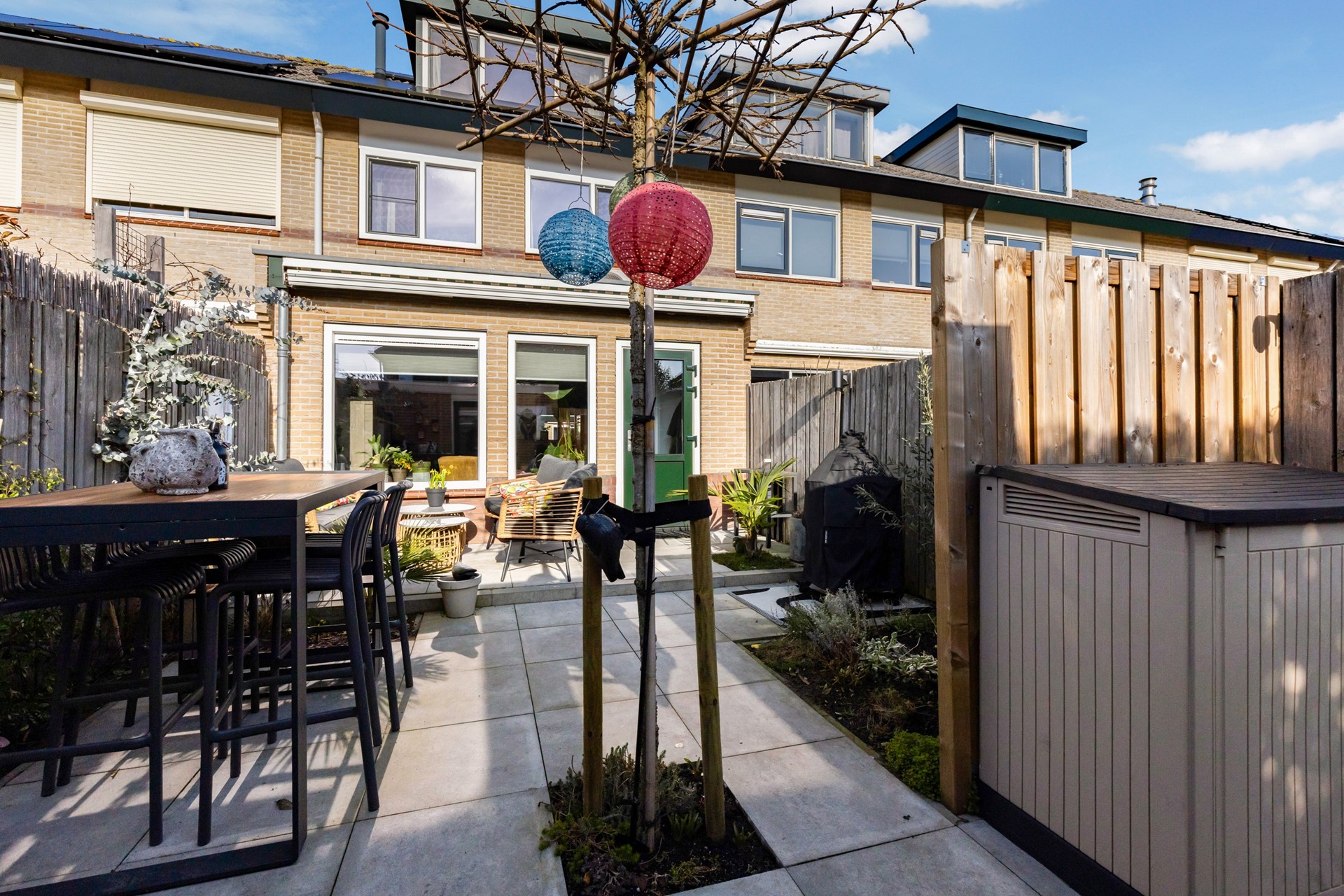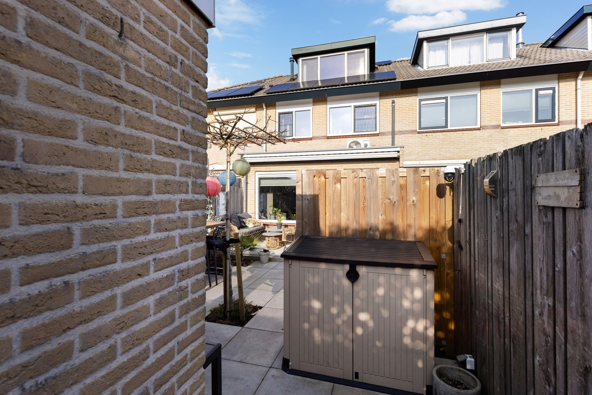 De fraai aangelegde achtertuin beschikt onder andere over een bestraat terras, een stenen berging en een erfafscheiding middels houten schuttingen. Dankzij de ligging op het zuiden kun je hier volop genieten van de zon. Op het dak van de woning zijn bovendien 12 zonnepanelen geplaatst. Via een achterom is de tuin eveneens bereikbaar. Tot slot is er in de wijk voldoende parkeer- en speelgelegenheid aanwezig.