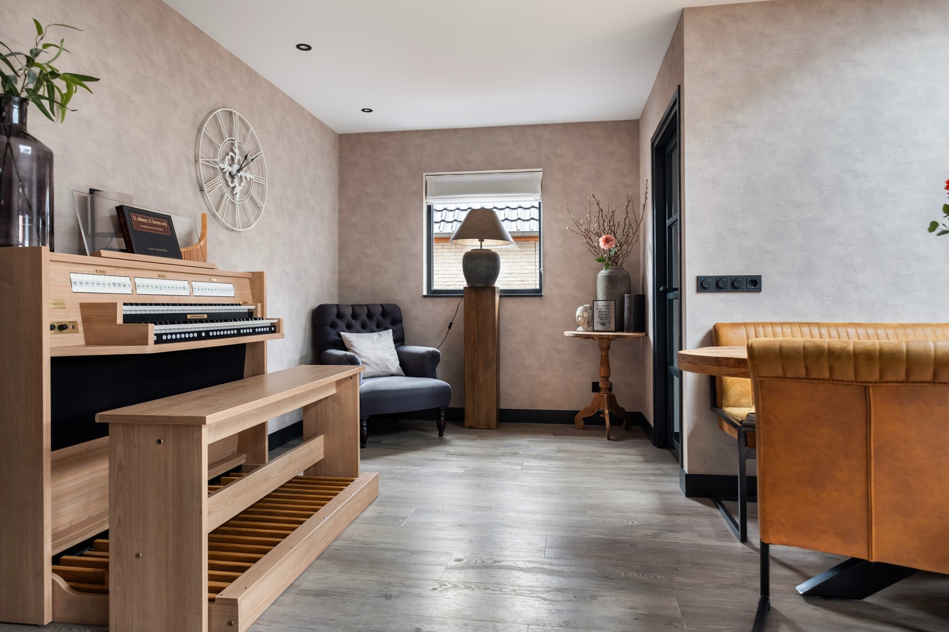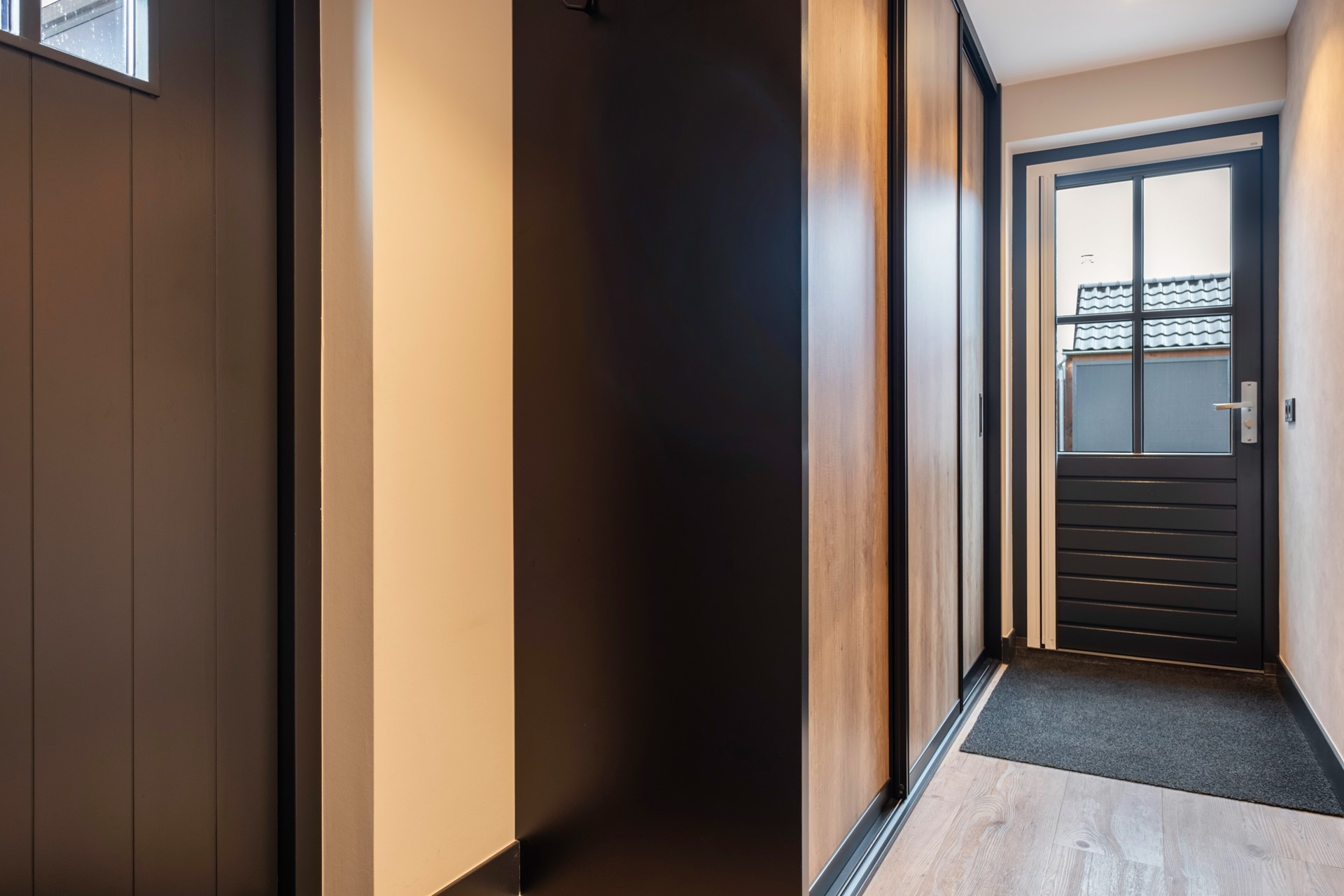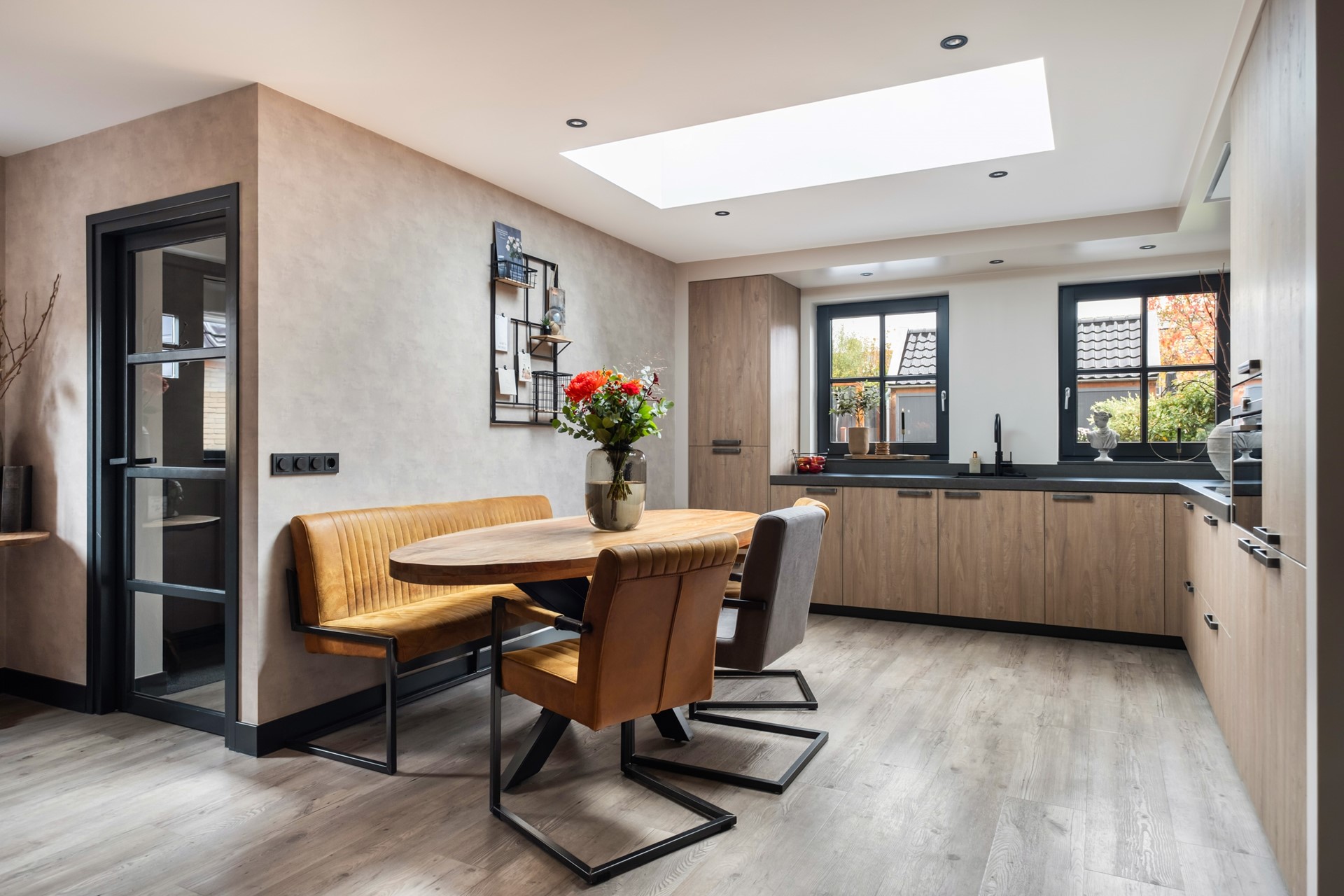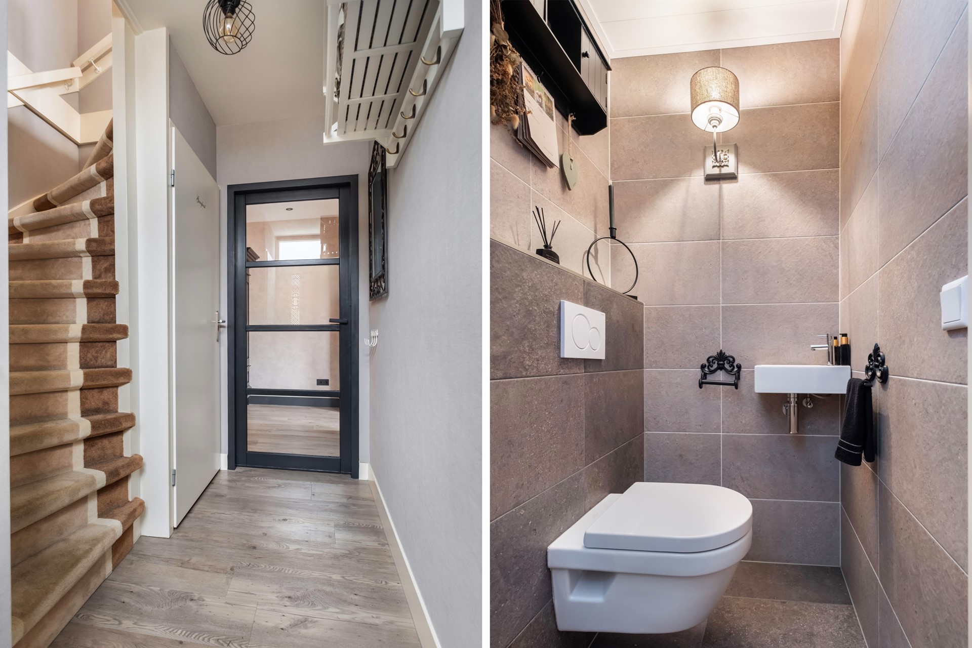 Via de hal kom je binnen in de woning. Hier vind je de meterkast (met glasvezelaansluiting), een moderne toiletruimte met wandcloset en fonteintje en een handige trapkast. Aan de achterzijde ligt de royale woonkeuken (2022) — een lichte en sfeervolle ruimte dankzij het grote daklicht. Er is volop plek voor een eethoek en een gezellige zithoek. De moderne keuken in hoekopstelling is uitgerust met alle gemakken: een kookplaat, afzuigkap, combi-oven, koelkast, vaatwasser en een Quooker. Aansluitend ligt de bijkeuken met een ruime vaste kast en toegang tot zowel de oprit als de achtertuin. Aan de voorzijde bevindt zich de sfeervolle woonkamer, te bereiken via authentieke openslaande deuren met glas-in-loodramen. De woonkamer heeft een warme en sfeervolle uitstraling, mede dankzij de fraaie houtkachel. De gehele begane grond is voorzien van een stijlvolle pvc-vloer met comfortabele vloerverwarming.