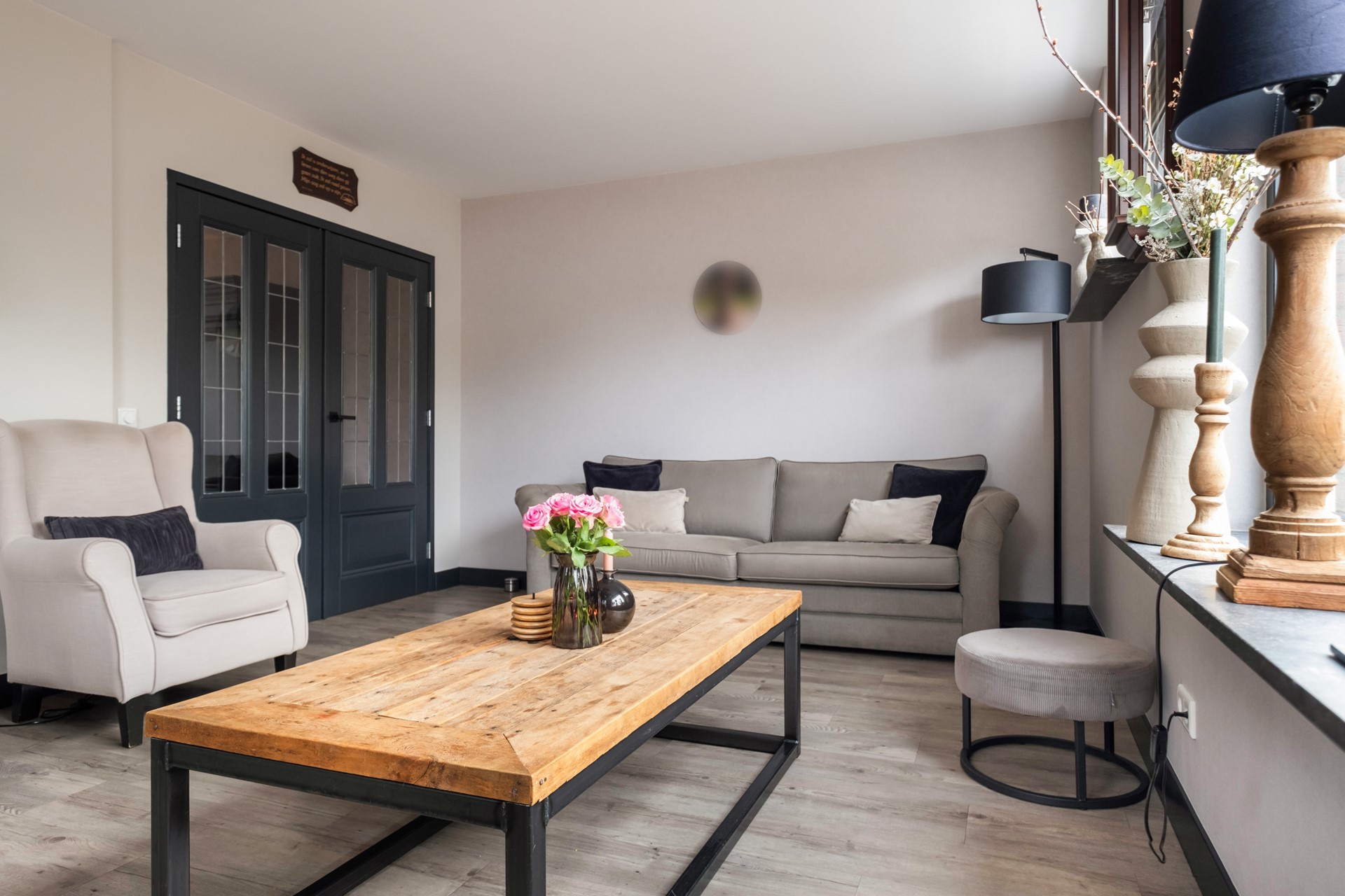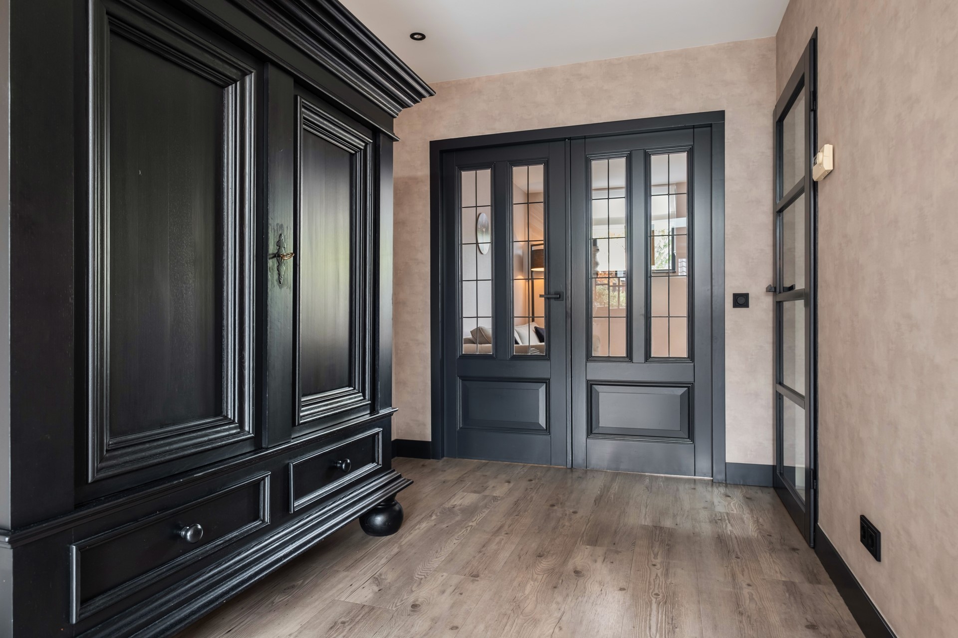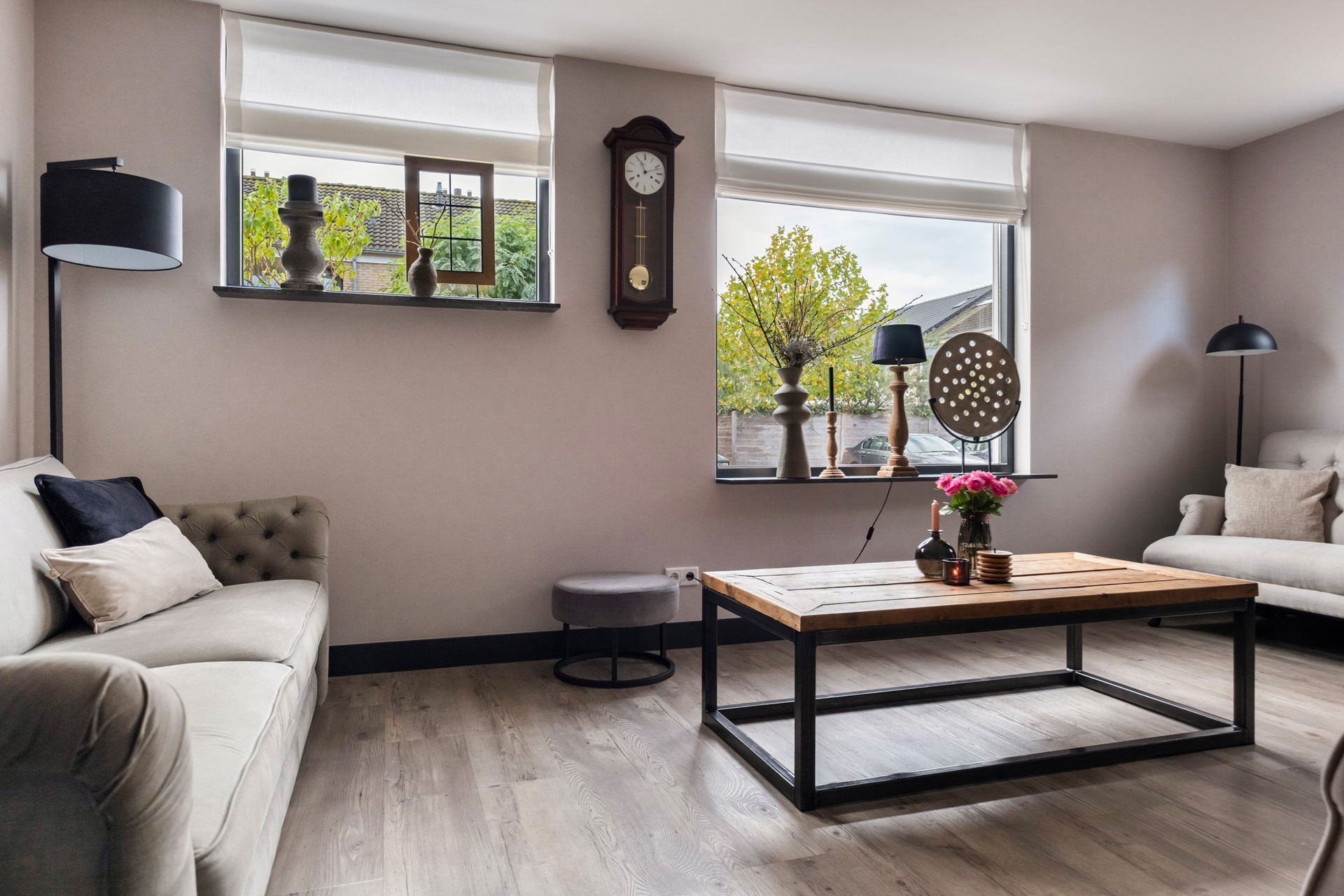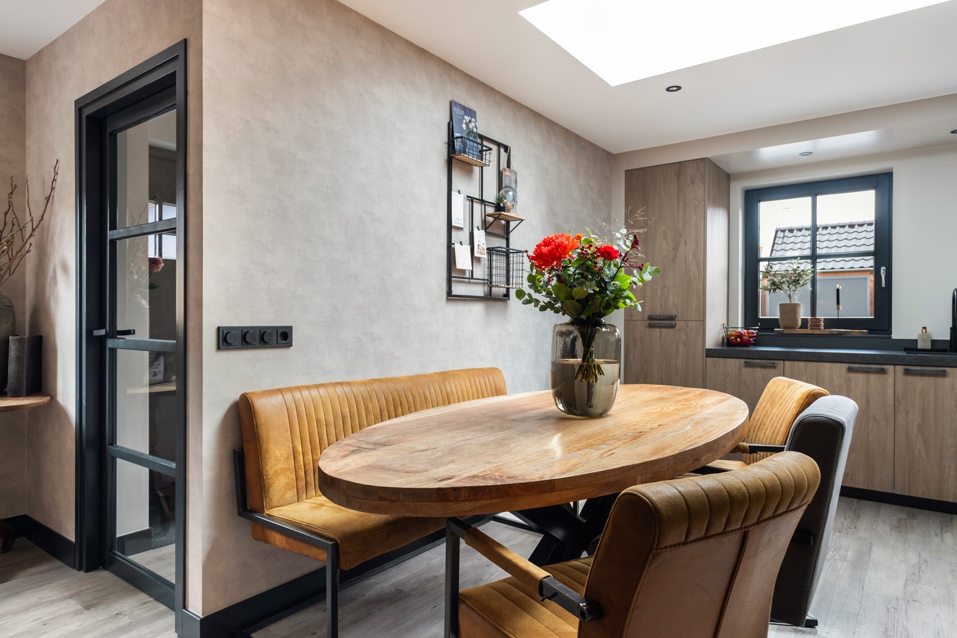 Via de hal kom je binnen in de woning. Hier vind je de meterkast (met glasvezelaansluiting), een moderne toiletruimte met wandcloset en fonteintje en een handige trapkast. Aan de achterzijde ligt de royale woonkeuken (2022) — een lichte en sfeervolle ruimte dankzij het grote daklicht. Er is volop plek voor een eethoek en een gezellige zithoek. De moderne keuken in hoekopstelling is uitgerust met alle gemakken: een kookplaat, afzuigkap, combi-oven, koelkast, vaatwasser en een Quooker. Aansluitend ligt de bijkeuken met een ruime vaste kast en toegang tot zowel de oprit als de achtertuin. Aan de voorzijde bevindt zich de sfeervolle woonkamer, te bereiken via authentieke openslaande deuren met glas-in-loodramen. De woonkamer heeft een warme en sfeervolle uitstraling, mede dankzij de fraaie houtkachel. De gehele begane grond is voorzien van een stijlvolle pvc-vloer met comfortabele vloerverwarming.