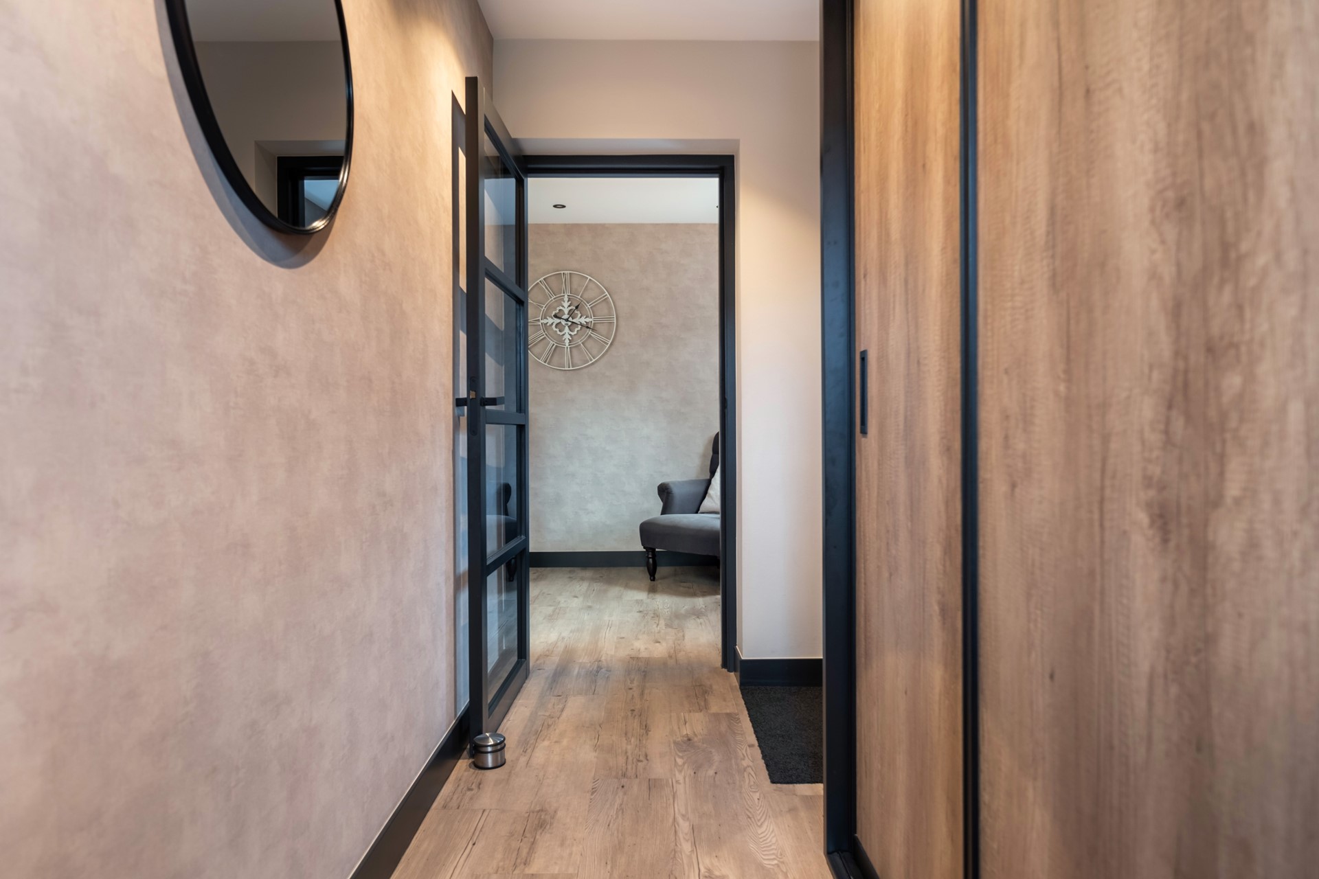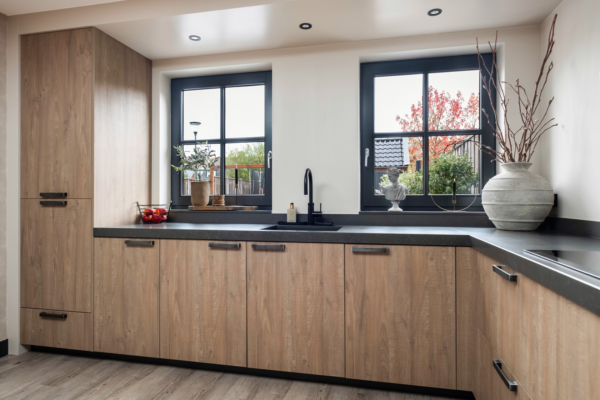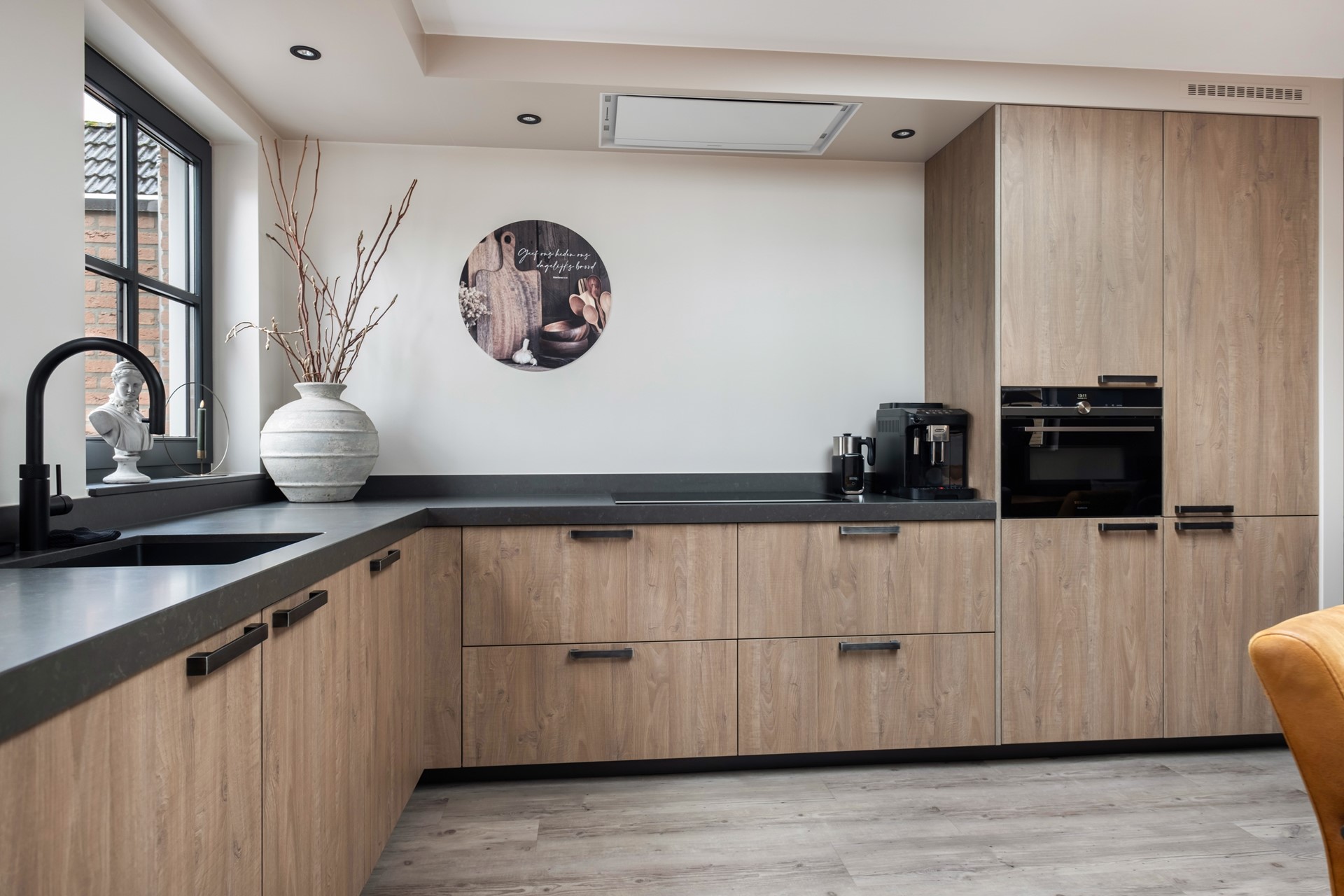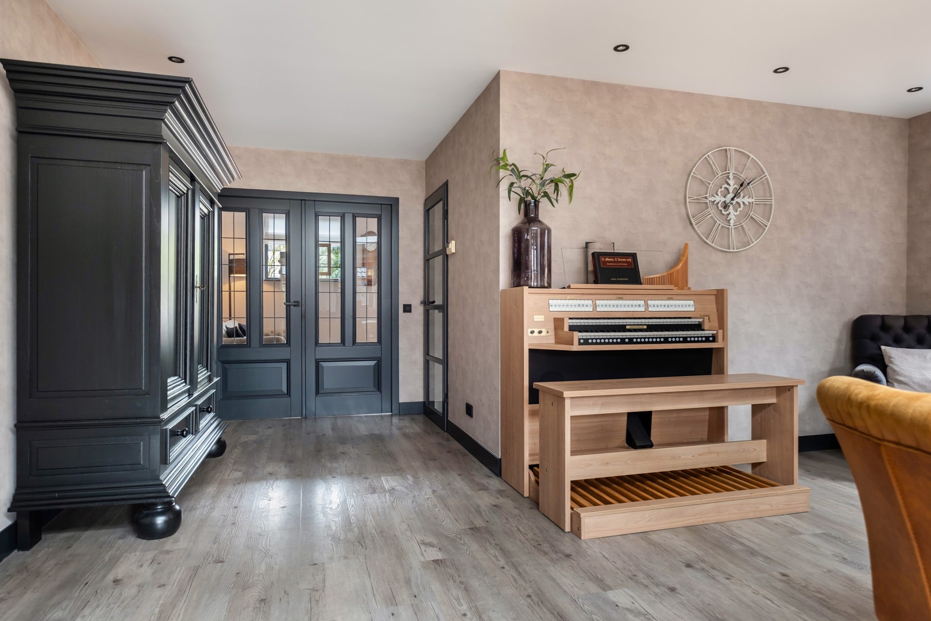 Via de hal kom je binnen in de woning. Hier vind je de meterkast (met glasvezelaansluiting), een moderne toiletruimte met wandcloset en fonteintje en een handige trapkast. Aan de achterzijde ligt de royale woonkeuken (2022) — een lichte en sfeervolle ruimte dankzij het grote daklicht. Er is volop plek voor een eethoek en een gezellige zithoek. De moderne keuken in hoekopstelling is uitgerust met alle gemakken: een kookplaat, afzuigkap, combi-oven, koelkast, vaatwasser en een Quooker. Aansluitend ligt de bijkeuken met een ruime vaste kast en toegang tot zowel de oprit als de achtertuin. Aan de voorzijde bevindt zich de sfeervolle woonkamer, te bereiken via authentieke openslaande deuren met glas-in-loodramen. De woonkamer heeft een warme en sfeervolle uitstraling, mede dankzij de fraaie houtkachel. De gehele begane grond is voorzien van een stijlvolle pvc-vloer met comfortabele vloerverwarming.