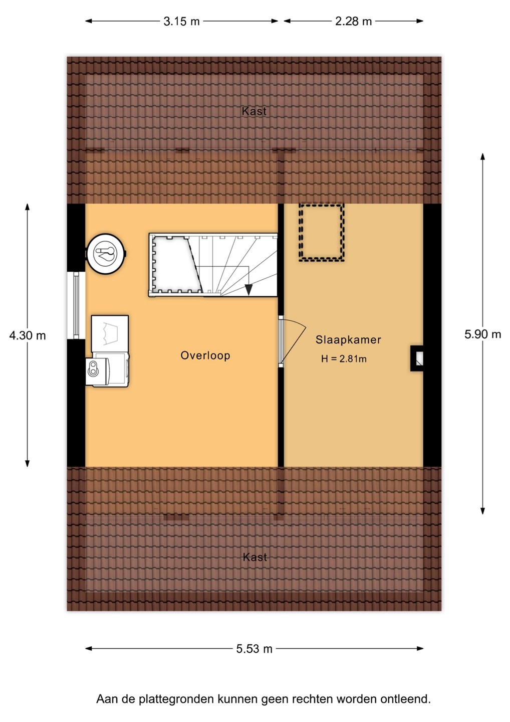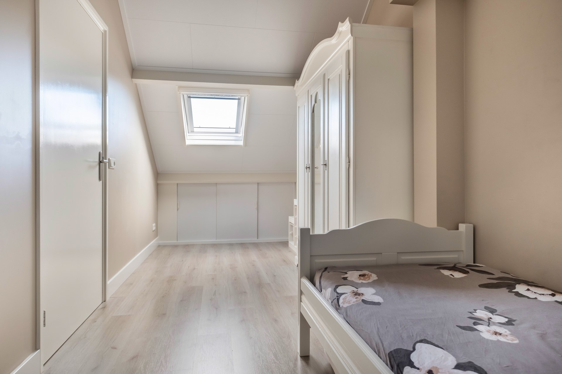 Via een vaste trap bereik je de ruime zolderverdieping. Op de overloop zijn de aansluitingen voor de wasmachine en droger, evenals de cv-installatie (Nefit, 2006) aanwezig. Achter de knieschotten is extra bergruimte en daarnaast is er een vierde slaapkamer gerealiseerd, met volop daglicht dankzij het Velux-dakraam. De verdieping is netjes afgewerkt met een laminaatvloer.
