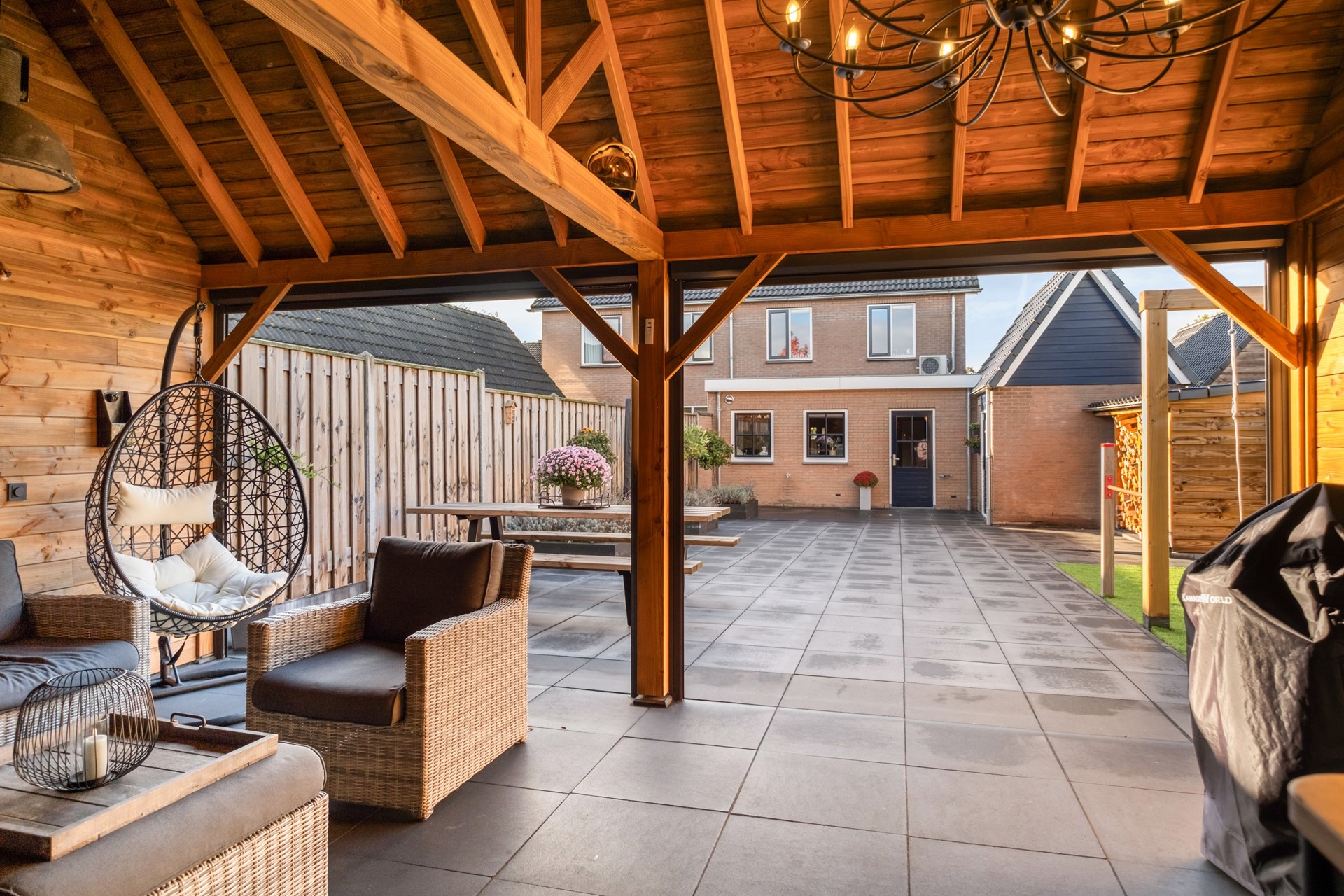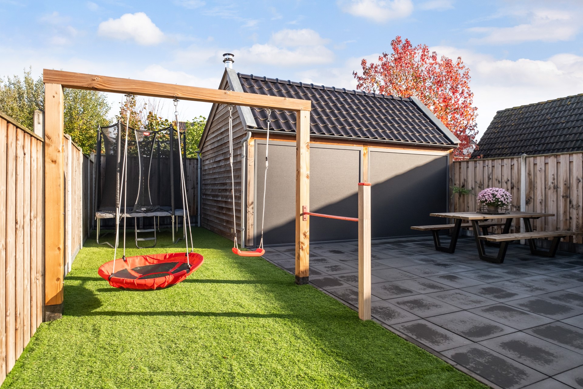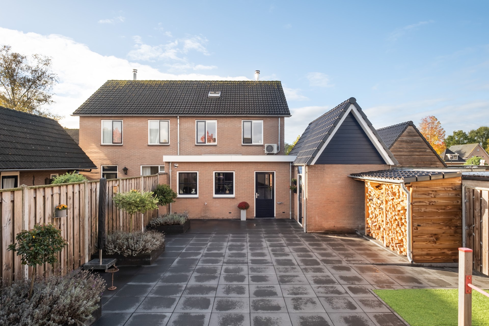 De fraai ingerichte achtertuin is een heerlijke plek om buiten te zijn. Er is een bestraat terras, (kunst)gazon, groene borders en een houthok. De sfeervolle veranda met screens en een gezellige houtkachel biedt op warme dagen een fijne, koele plek om te ontspannen en op koelere avonden een behaaglijke zitplek. De woning beschikt over 14 zonnepanelen en ramen met rolluiken en zonwering. Via de poort naast de woning is de tuin achterom bereikbaar. De oprit biedt ruimte voor meerdere auto’s, en in de wijk is daarnaast voldoende parkeergelegenheid. Ook aan speelruimte voor kinderen is geen gebrek.