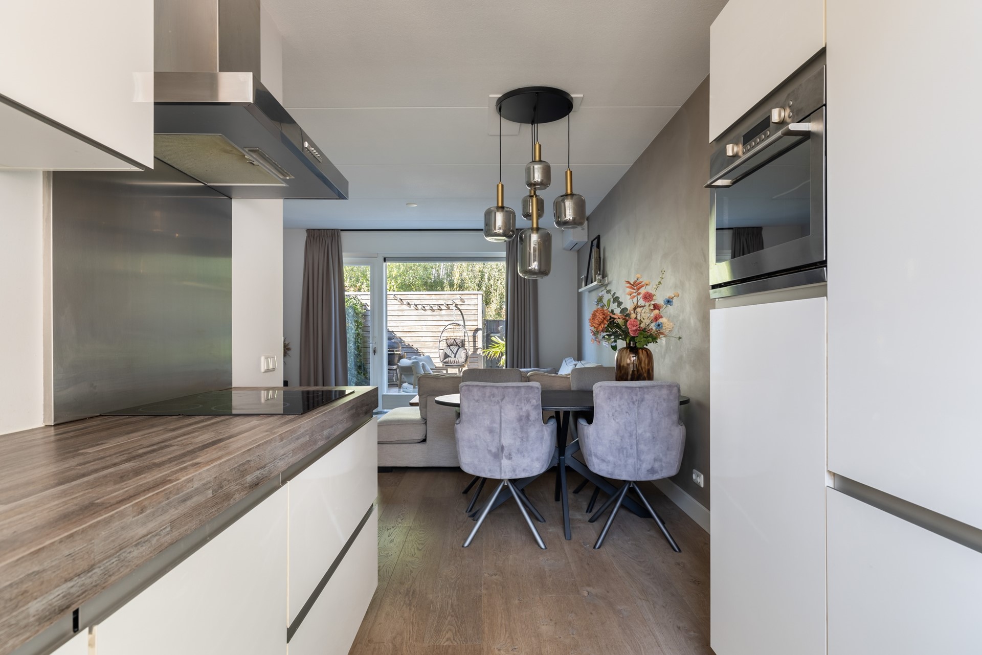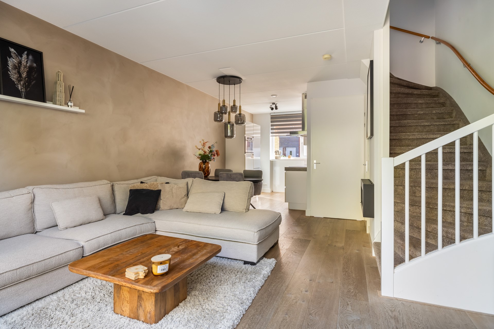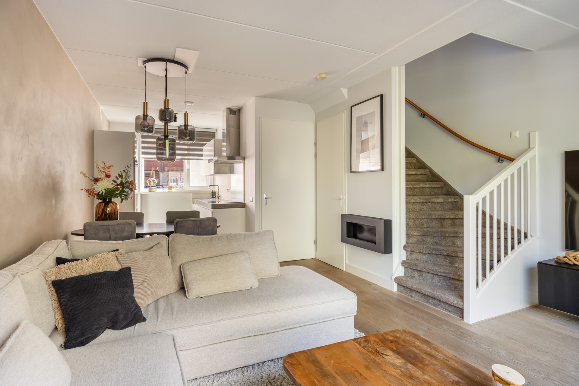 Via de entree kom je in de hal, met toegang tot de meterkast (inclusief glasvezel), het toilet en de woonkamer. De woonkamer is lekker licht en sfeervol, met aan de achterzijde een loopdeur naar het terras. Dankzij de airco zit je hier altijd comfortabel, ongeacht het seizoen. De haard zorgt voor extra gezelligheid, en onder de trap vind je handige bergruimte. Aan de voorzijde van de woning ligt de moderne keuken in rechte opstelling, met een extra apparatenkast. Je vindt hier diverse inbouwapparatuur zoals een kookplaat, afzuigkap, combi-oven, koel-/vriescombinatie en een vaatwasser. Er is bovendien voldoende plek voor een eethoek. De hele begane grond is netjes afgewerkt met een mooie houten vloer.