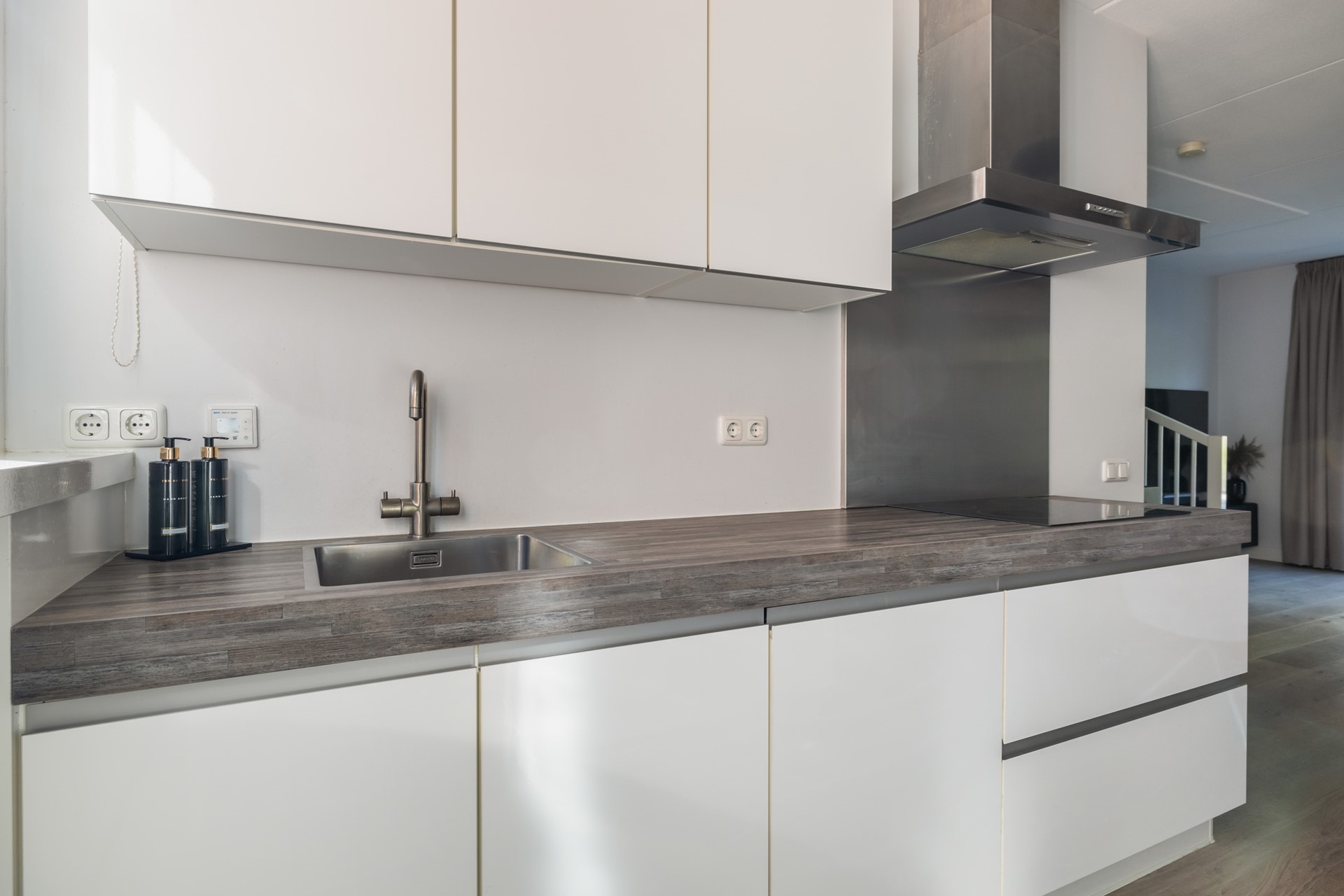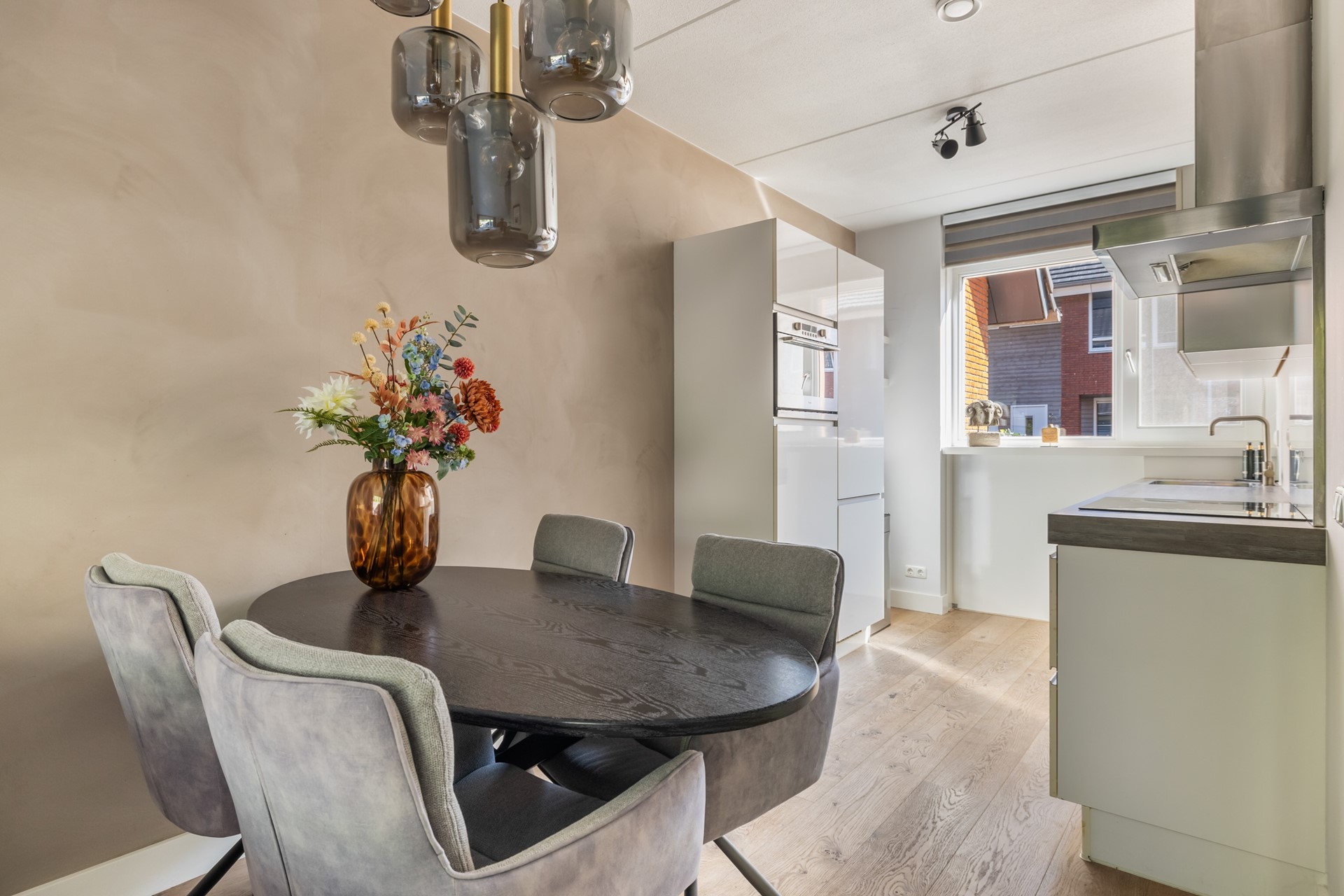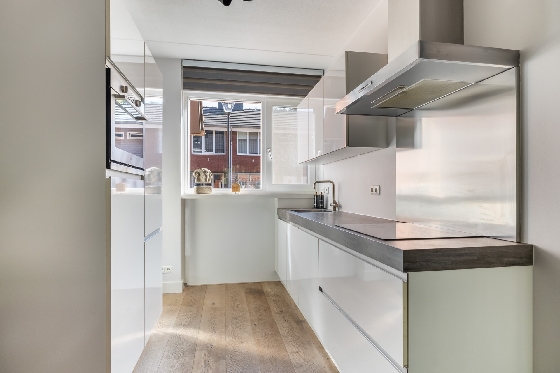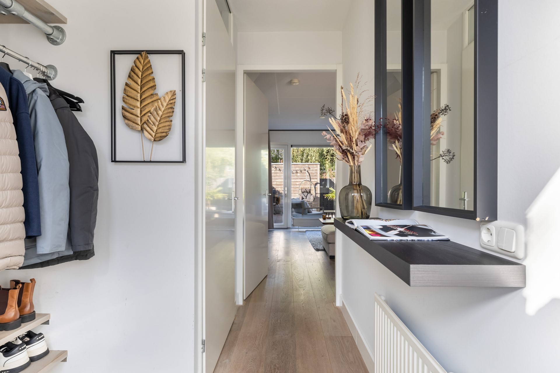 Via de entree kom je in de hal, met toegang tot de meterkast (inclusief glasvezel), het toilet en de woonkamer. De woonkamer is lekker licht en sfeervol, met aan de achterzijde een loopdeur naar het terras. Dankzij de airco zit je hier altijd comfortabel, ongeacht het seizoen. De haard zorgt voor extra gezelligheid, en onder de trap vind je handige bergruimte. Aan de voorzijde van de woning ligt de moderne keuken in rechte opstelling, met een extra apparatenkast. Je vindt hier diverse inbouwapparatuur zoals een kookplaat, afzuigkap, combi-oven, koel-/vriescombinatie en een vaatwasser. Er is bovendien voldoende plek voor een eethoek. De hele begane grond is netjes afgewerkt met een mooie houten vloer.