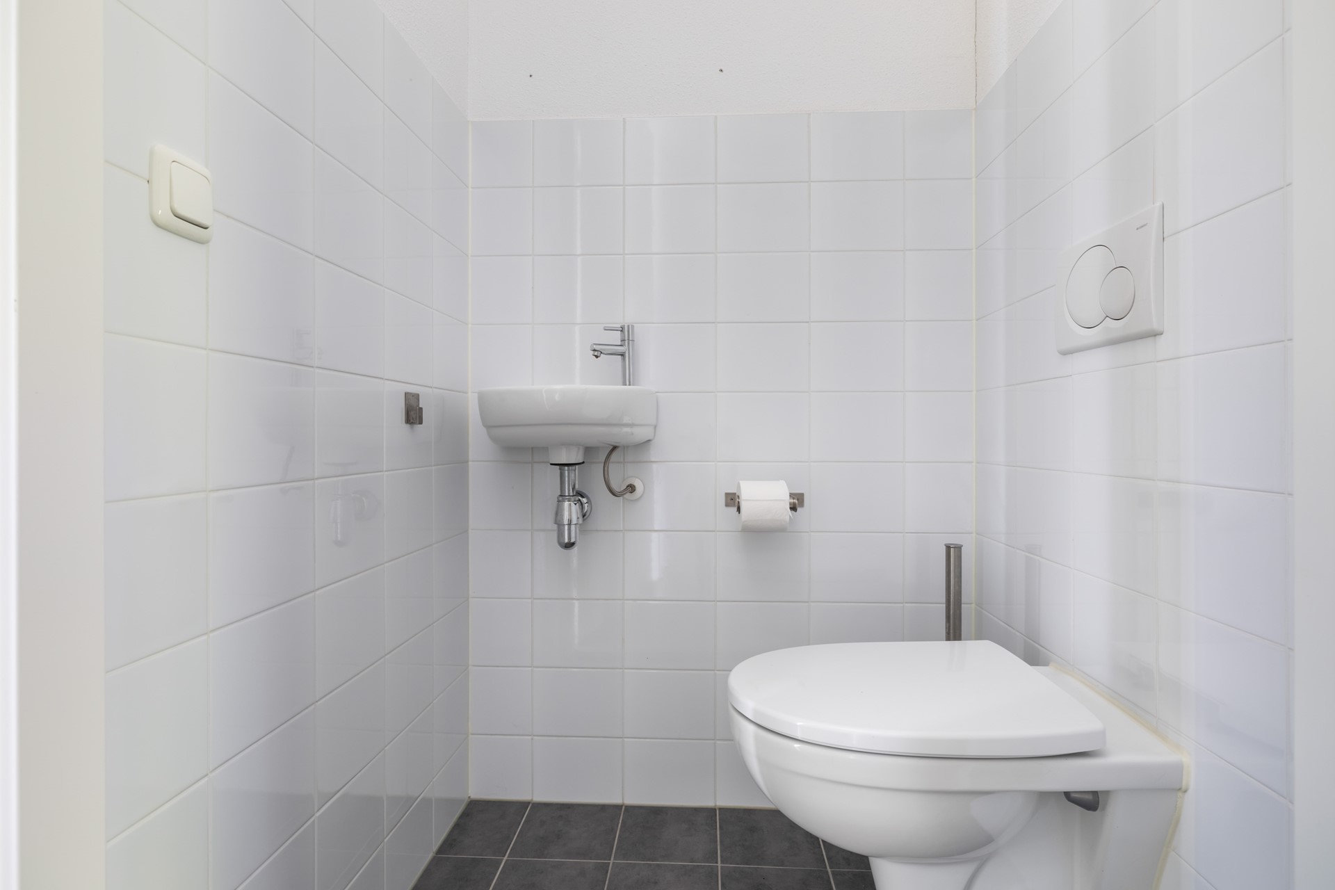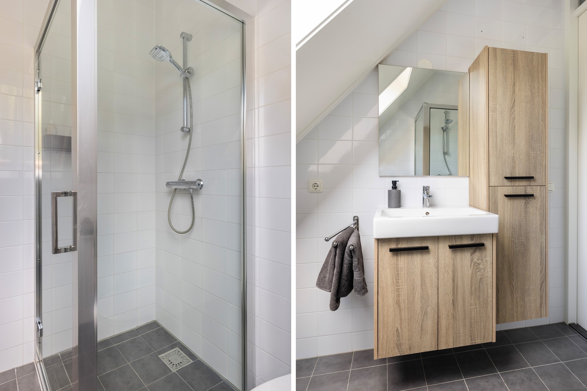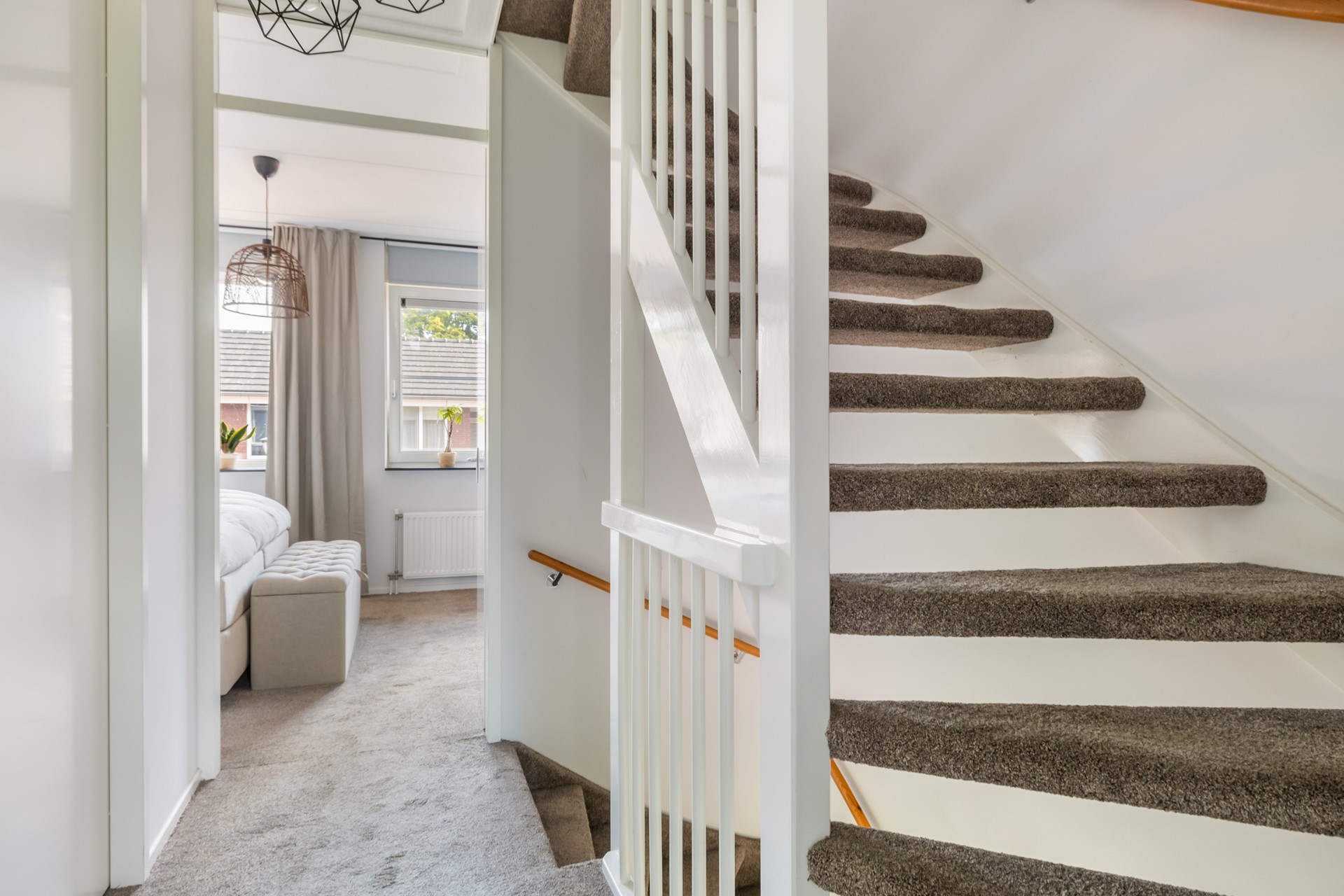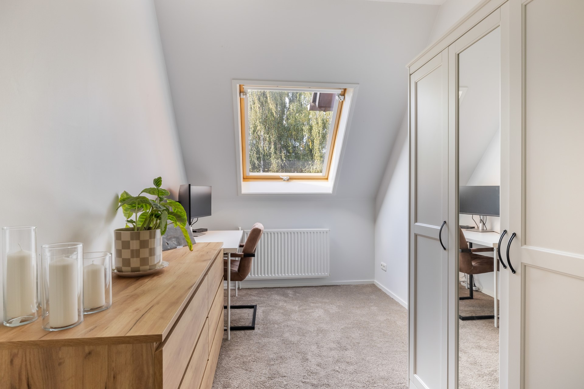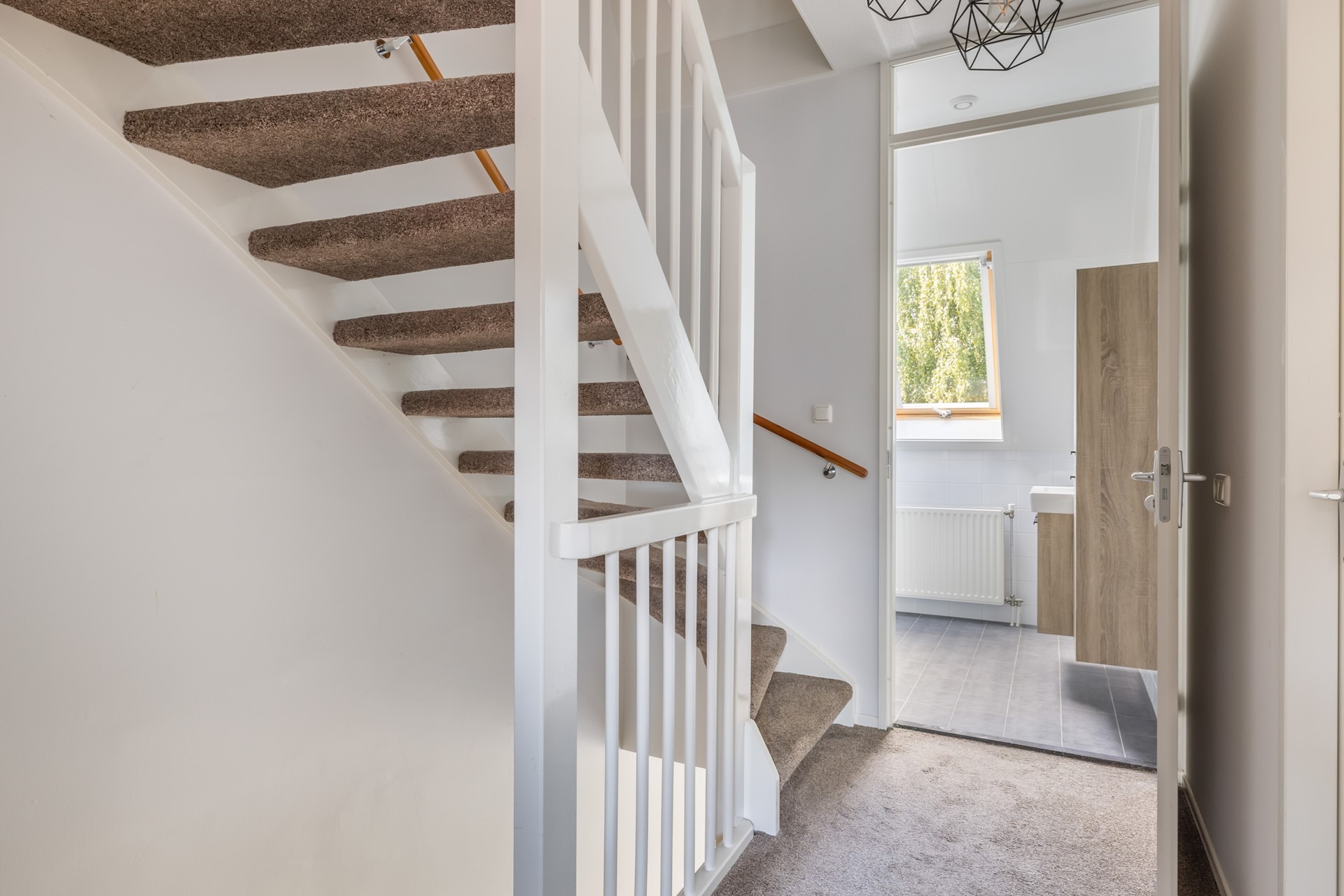 Via de vaste trap bereik je de overloop met toegang tot twee slaapkamers en de badkamer. De volledig betegelde badkamer is voorzien van een douche, toilet, wastafelmeubel en een Velux-dakraam voor natuurlijk licht en ventilatie. Aan de achterzijde ligt een ruime slaapkamer met dakraam, en aan de voorzijde vind je de ouderslaapkamer. Deze verdieping is afgewerkt met vloerbedekking.