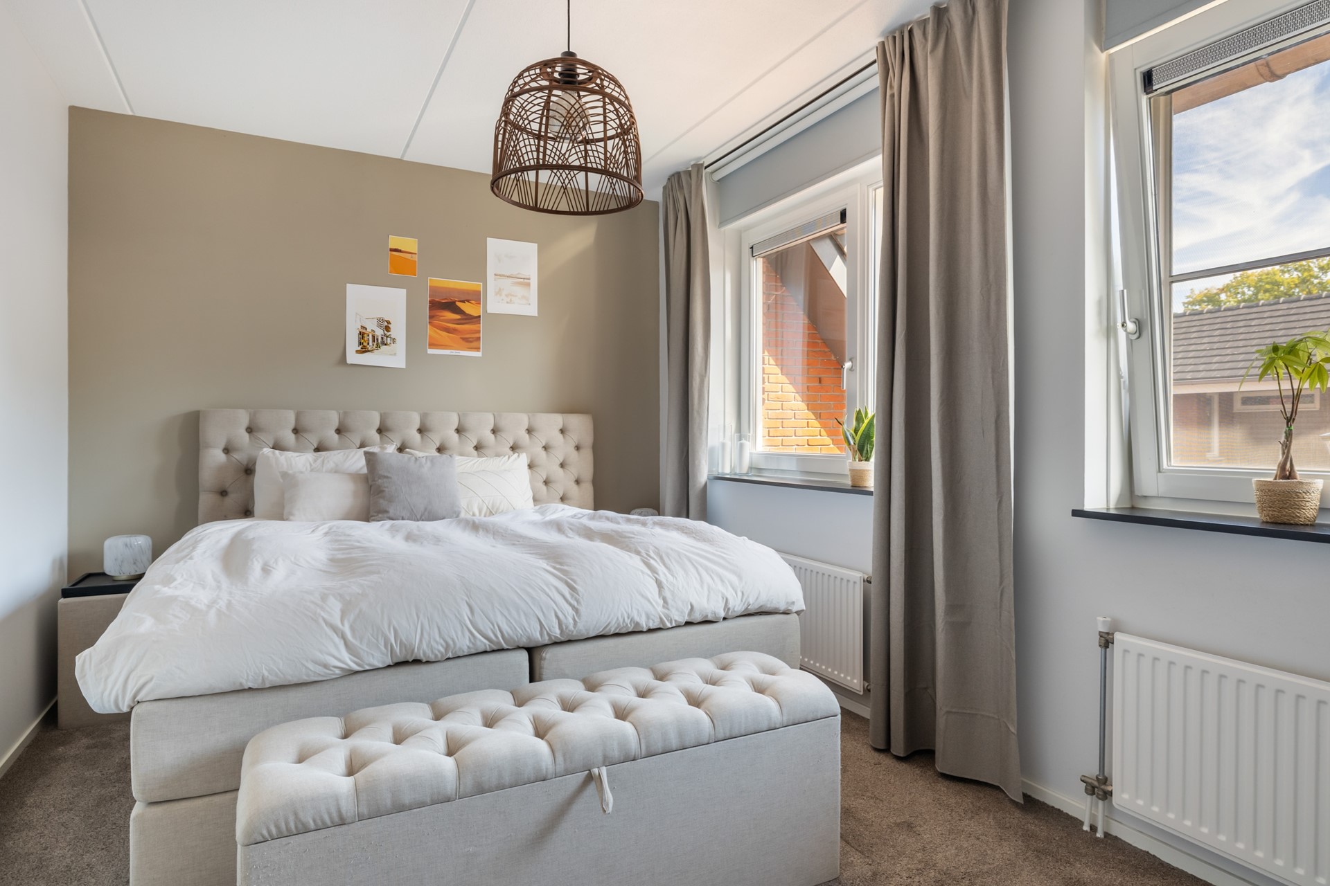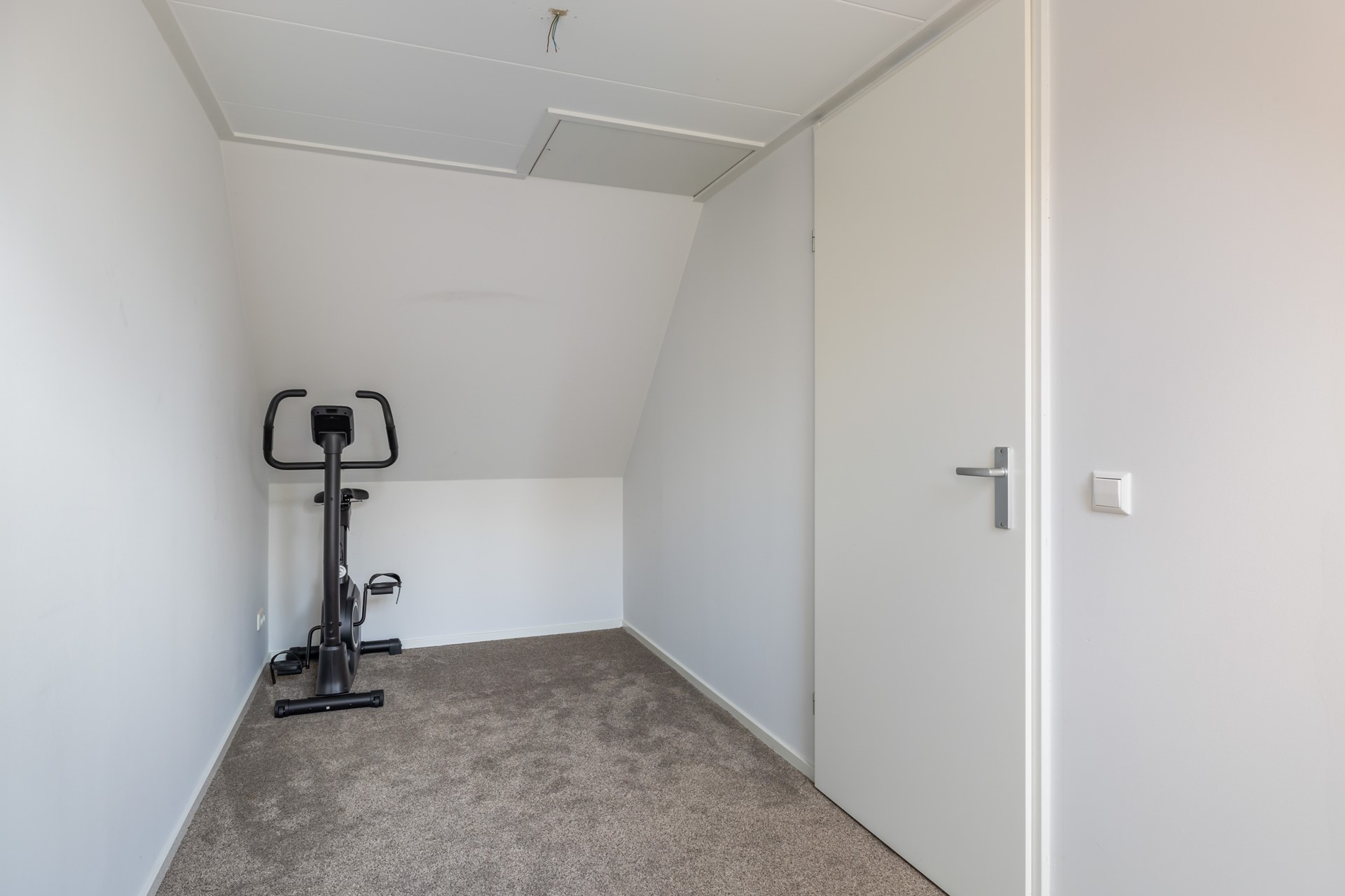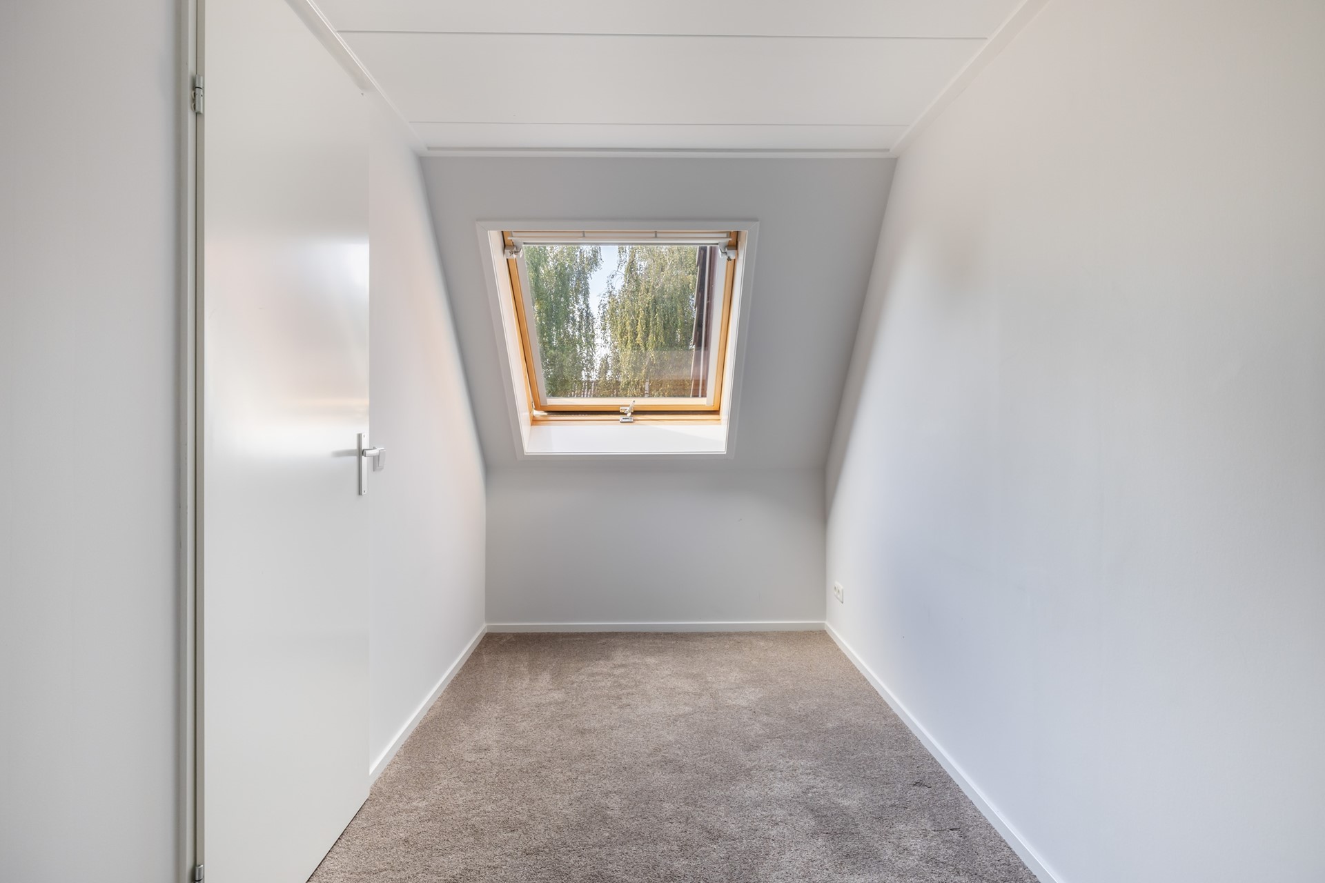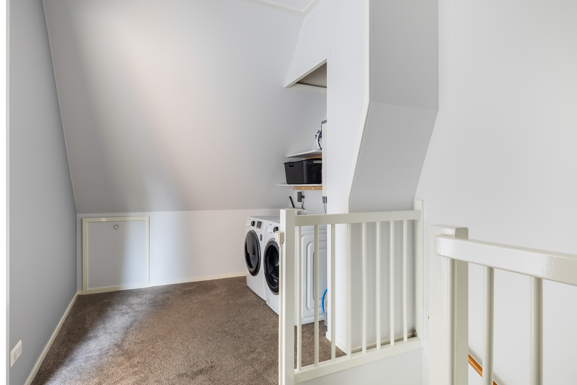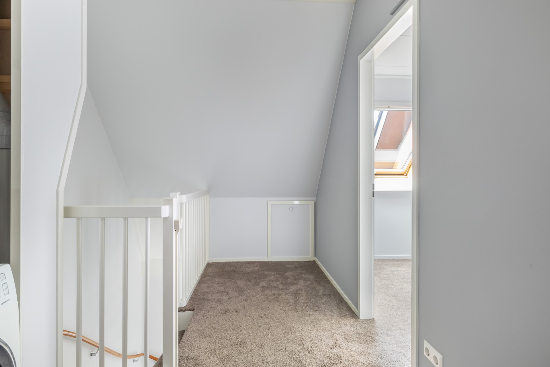 Ook deze verdieping bereik je via een vaste trap. Hier vind je een ruime overloop én een derde slaapkamer met dakraam. Extra opbergruimte is er achter de knieschotten én op de vliering (bereikbaar via een luik). Op de overloop zijn ook de cv-installatie (Intergas 2011) en de aansluitingen voor wasmachine en droger te vinden. Net als de eerste verdieping is ook deze etage voorzien van vloerbedekking.