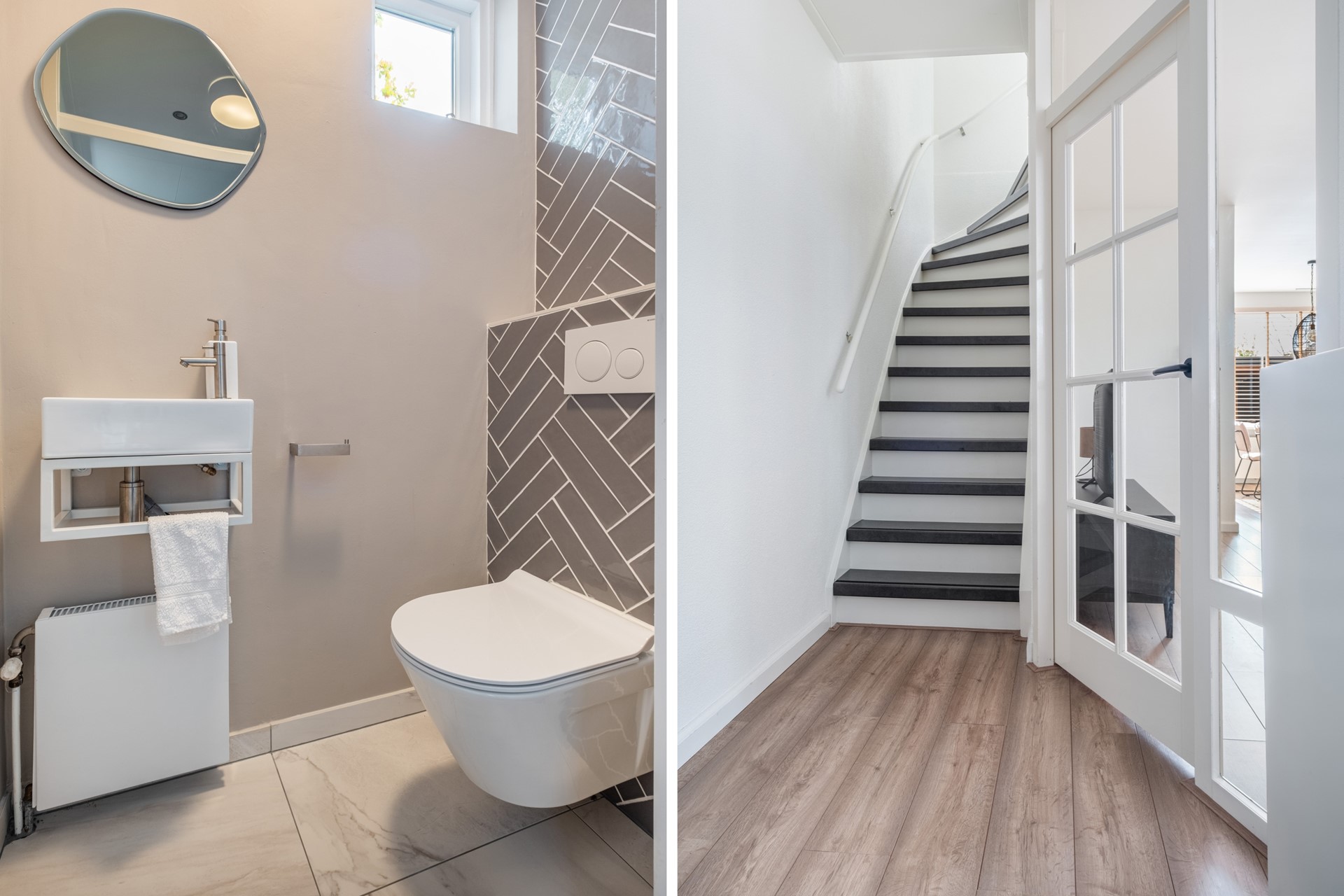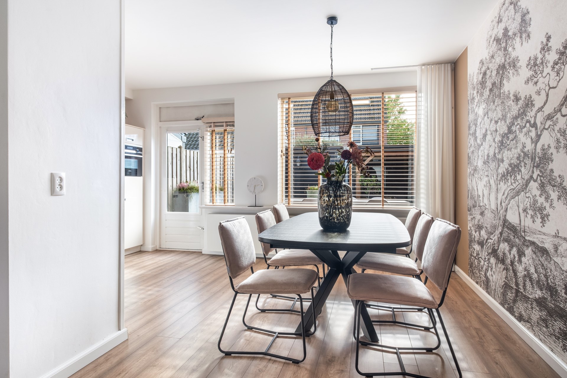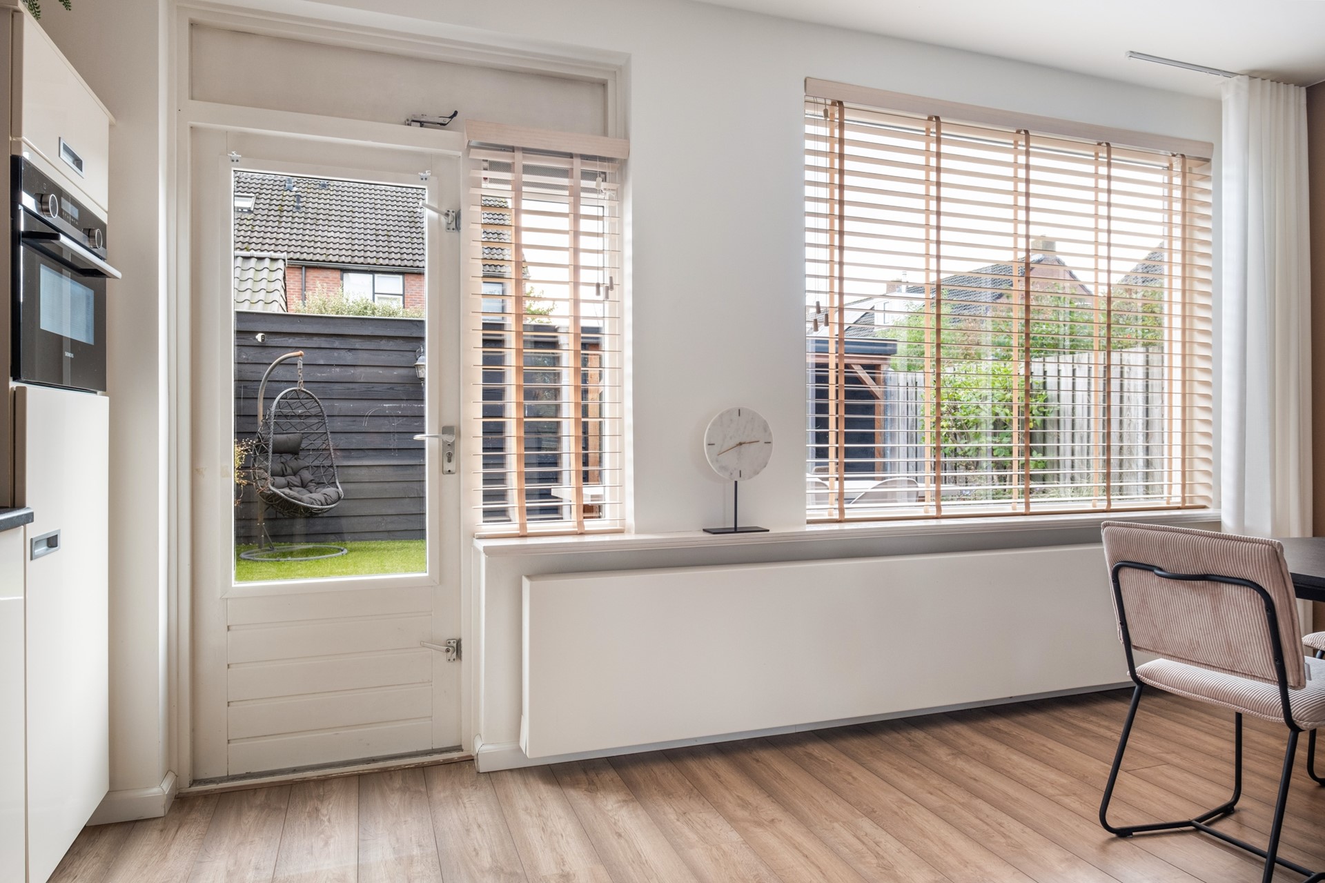 Via de entree kom je in de hal, die toegang biedt tot de toiletruimte met wandcloset en fontein (2023), de meterkast, de trapopgang naar de eerste verdieping en de woonkamer. De sfeervolle woonkamer bevindt zich aan de voorzijde van de woning en biedt plaats voor een royale zithoek. Daarnaast is er een praktische provisieruimte aanwezig. In het verlengde van de woonkamer is ruimte voor een gezellige eethoek en bevindt zich de keuken. De open keuken in hoekopstelling is uitgerust met een kookplaat, afzuigkap, combi-oven, koelkast en een vaatwasser. Vanuit de keuken heb je direct toegang tot de tuin. De gehele begane grond is afgewerkt met een nette laminaatvloer en de wanden en het plafond zijn glad afgewerkt.
