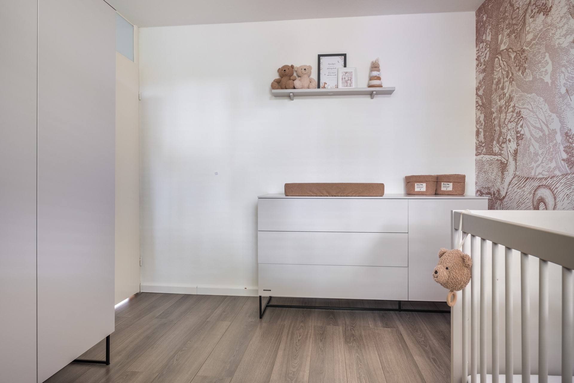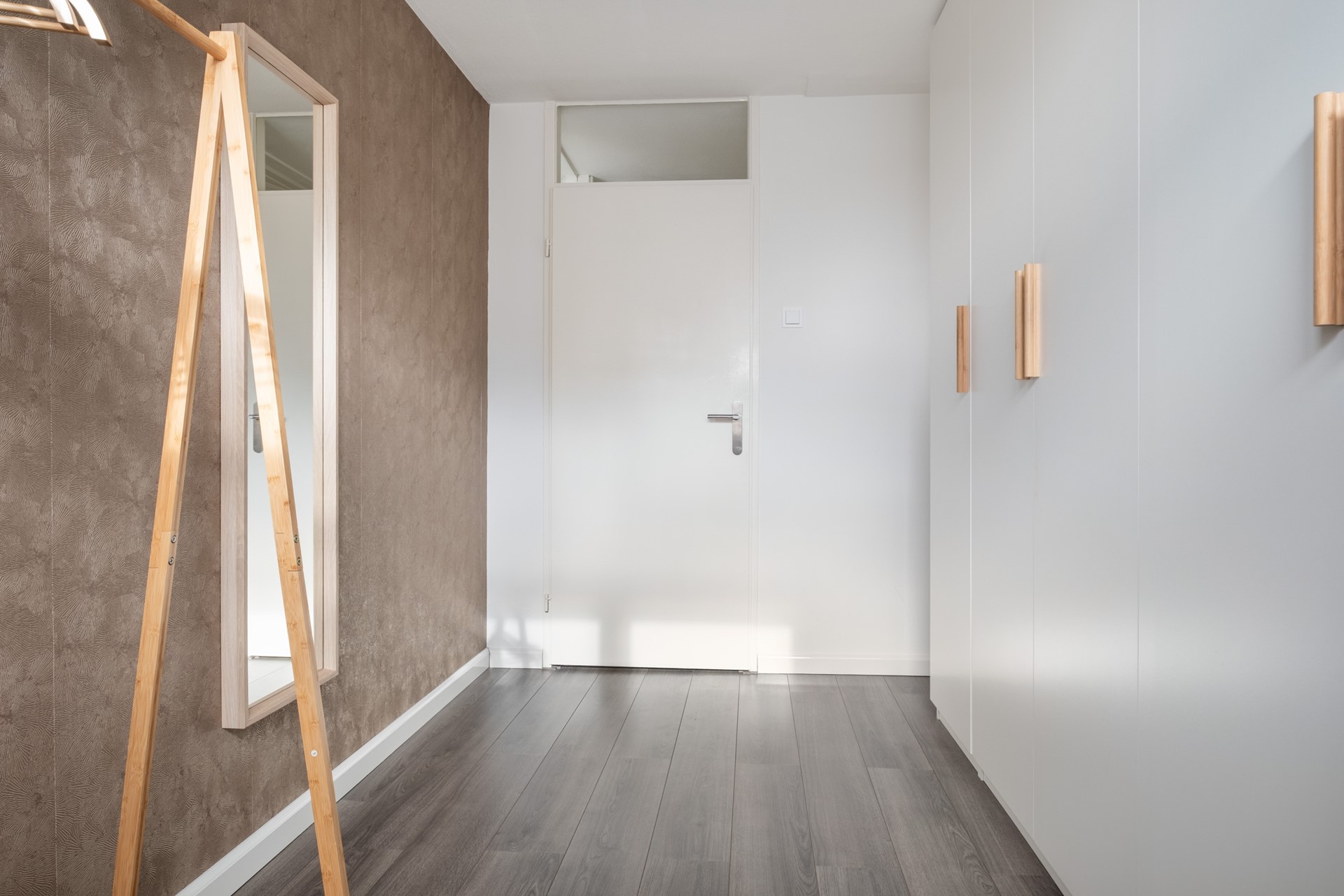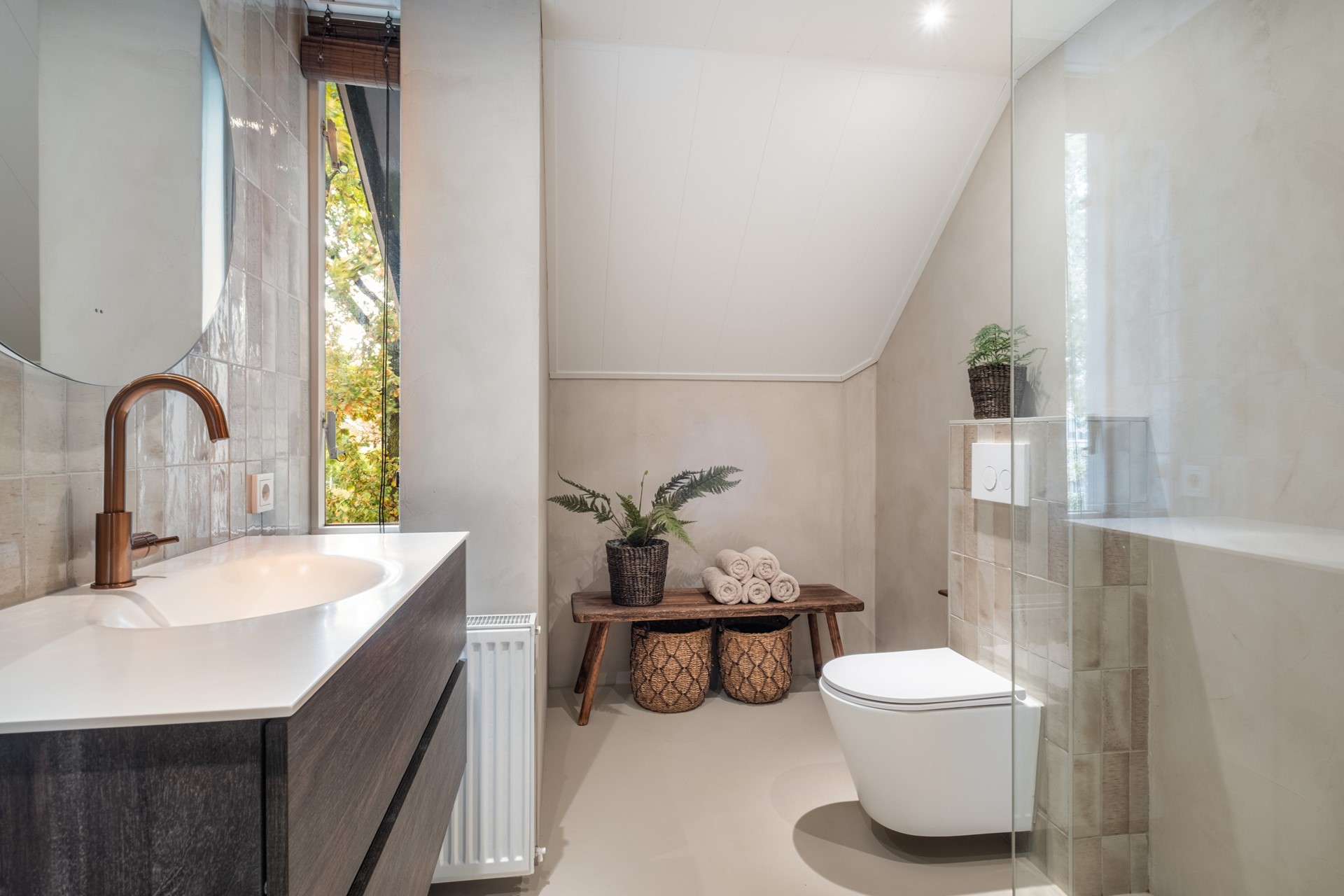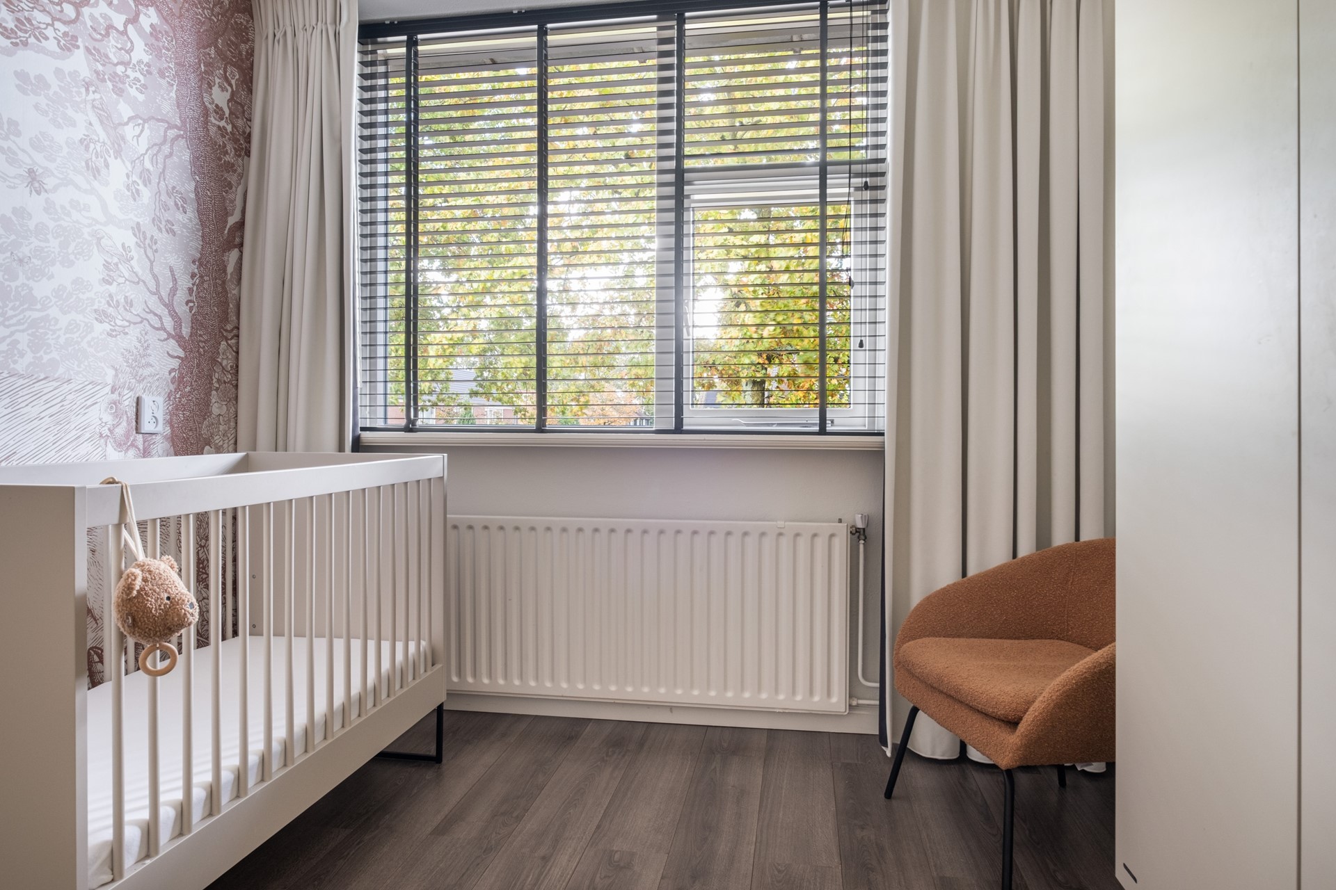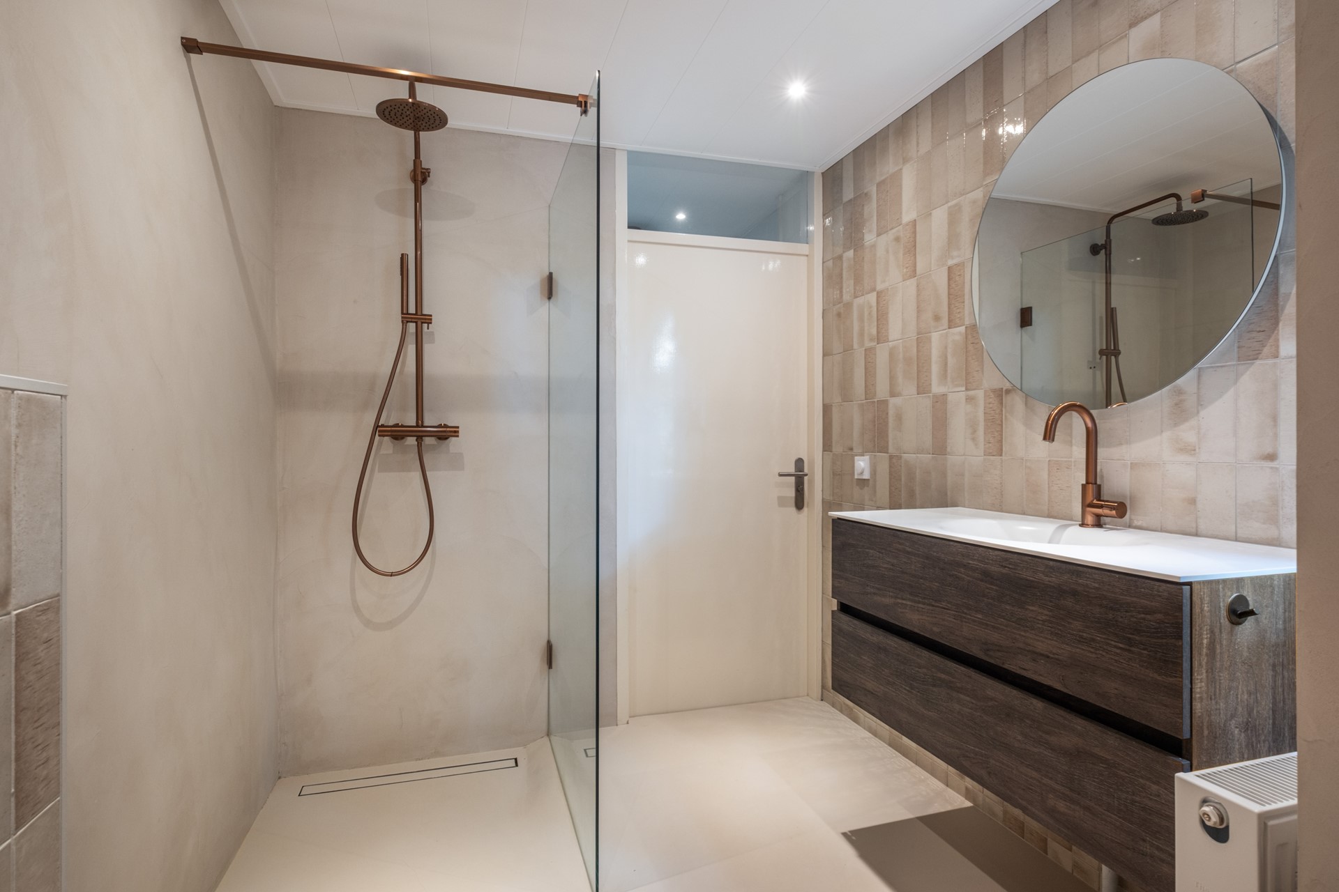 Via de vaste trap kom je op de overloop van de eerste verdieping die toegang biedt tot drie slaapkamers en de badkamer. De vernieuwde, moderne badkamer is uitgerust met een inloopdouche, wandcloset en een wastafelmeubel. Van de drie slaapkamers ligt er één aan de voorzijde en twee aan de achterzijde. De gehele verdieping is netjes afgewerkt met gladde wanden en een laminaatvloer.