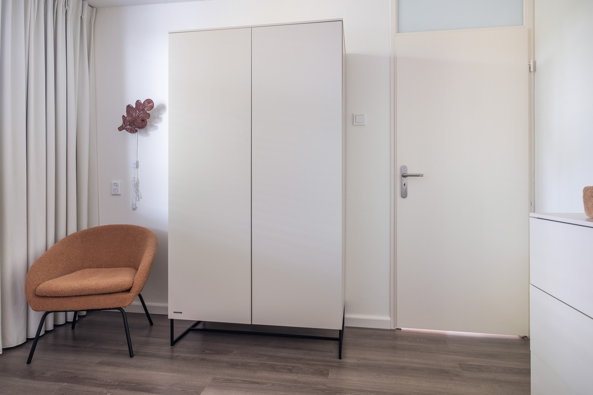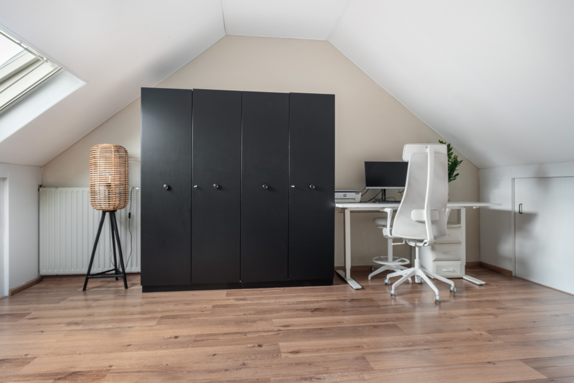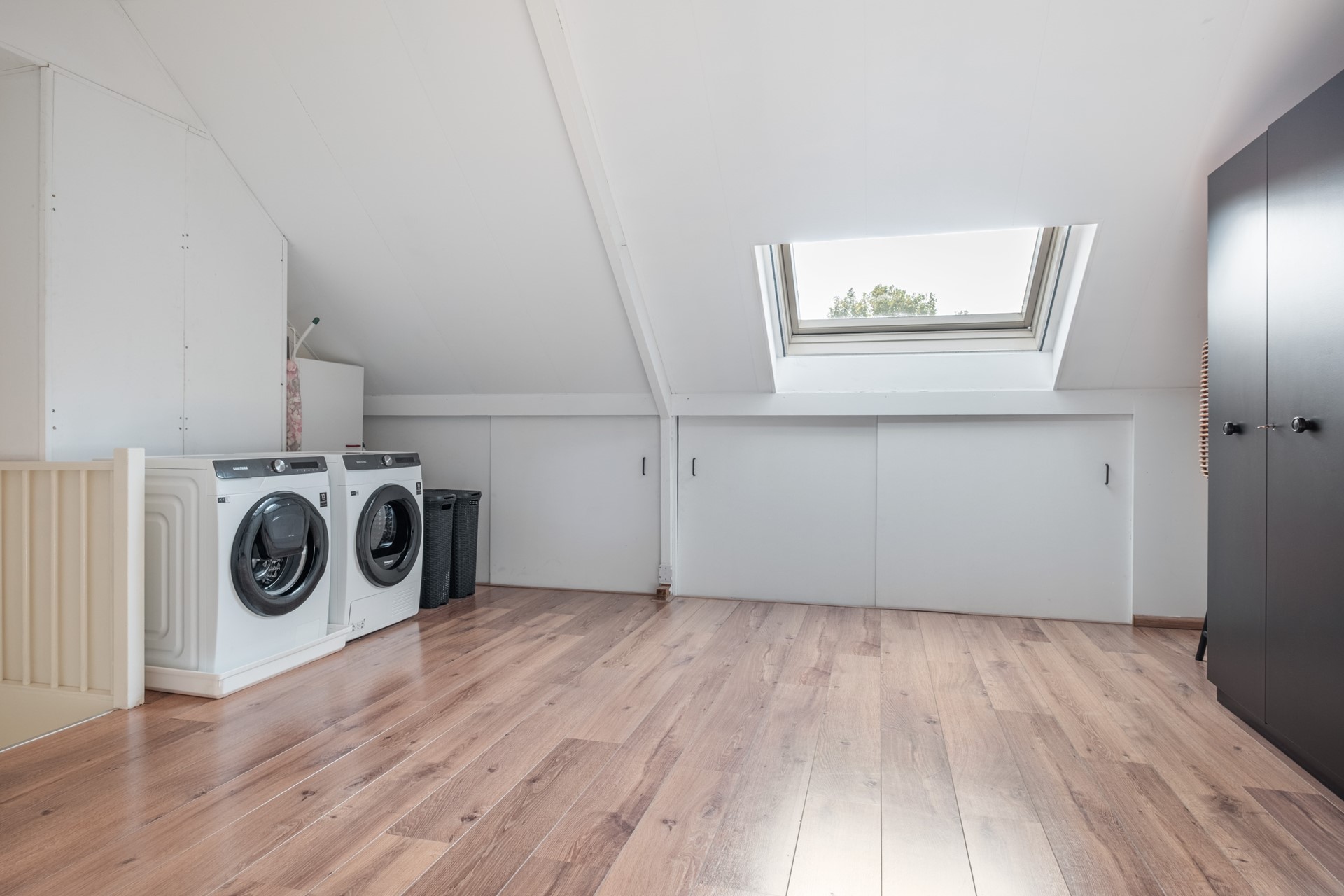 Via een vaste trap is de zolder bereikbaar. Deze open zolder met Velux-dakraam is netjes afgewerkt en beschikt over veel praktische bergruimte achter de knieschotten. Hier zijn ook de aansluitingen voor een wasmachine en droger te vinden en de cv-installatie (Remeha, 2022) is hier gesitueerd. Ook op deze verdieping is een laminaatvloer aanwezig. De open ruimte biedt daarnaast zeker mogelijkheid om bijvoorbeeld extra (slaap)kamers te realiseren.