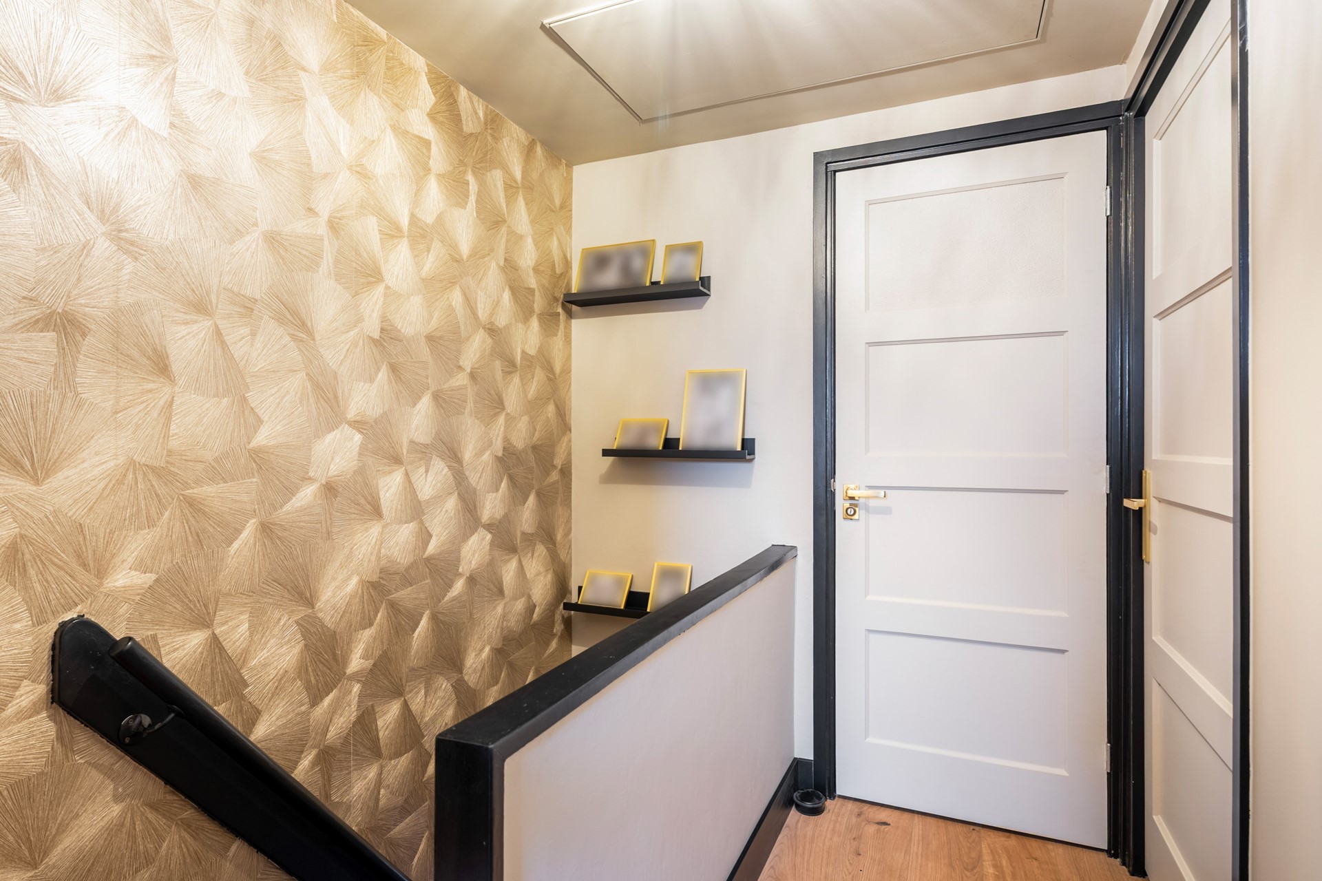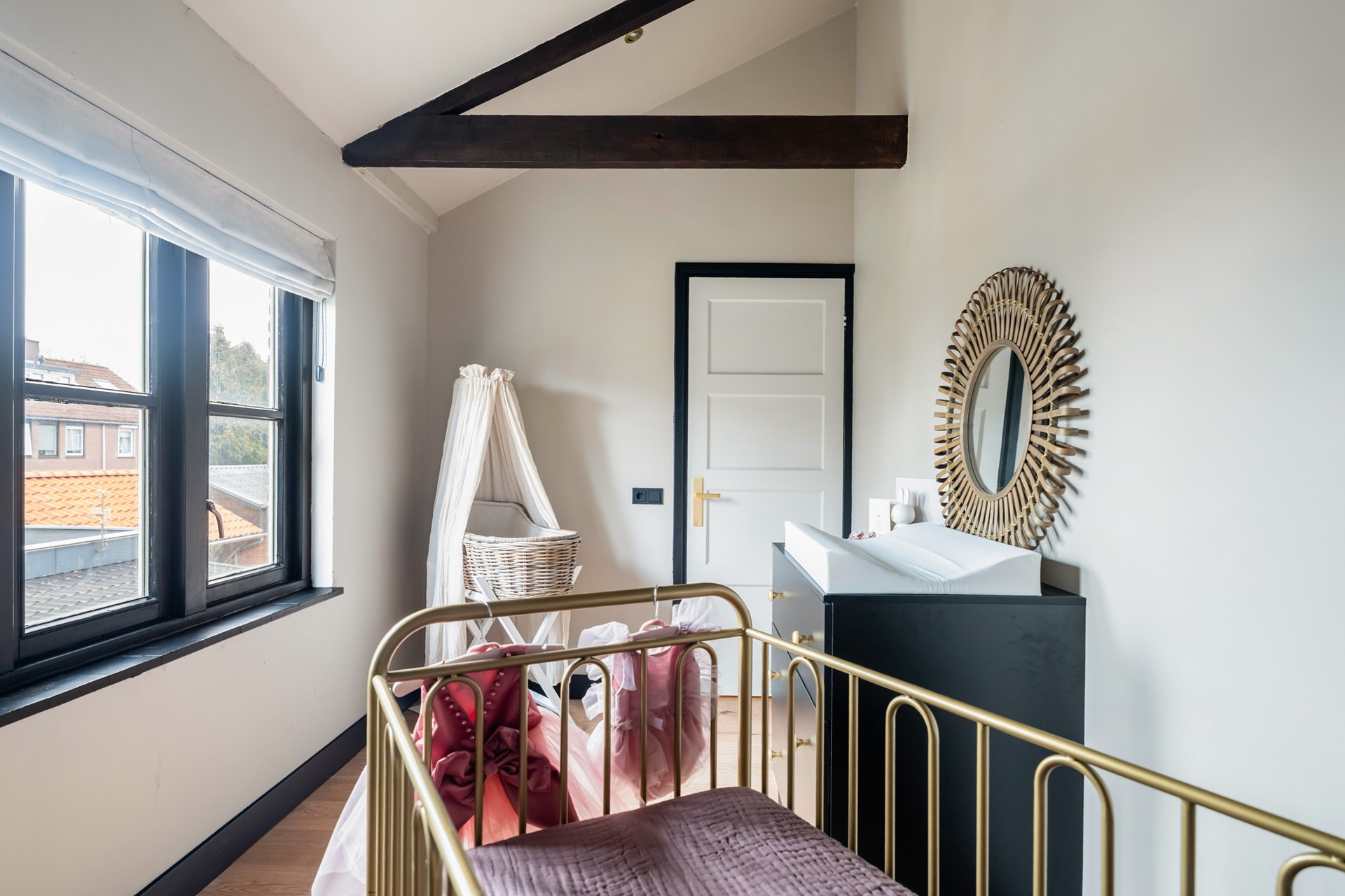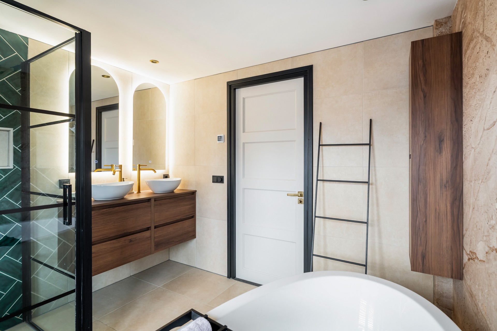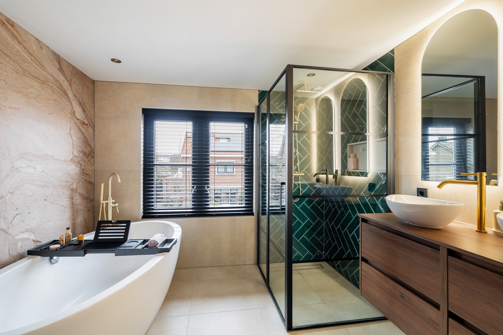 Via de trap bereik je de overloop van de 1e verdieping. Deze geeft toegang tot de moderne badkamer, twee slaapkamers en een praktische berging. De recent vernieuwde badkamer bevindt zich aan de voorzijde van de woning en biedt dankzij de elektrische vloerverwarming voor extra comfort. De ruimte is ingericht met een vrijstaand ligbad, een separate douche en een stijlvol wastafelmeubel met dubbele waskommen. De naastgelegen hoofdslaapkamer en de kinderkamer aan de achterzijde zijn beide keurig afgewerkt met strak gestucte wanden en een plafond met inbouwspots. De berging op deze verdieping is voorzien van aansluitingen voor een wasmachine en droger en leent zich daardoor uitstekend als praktische wasruimte.