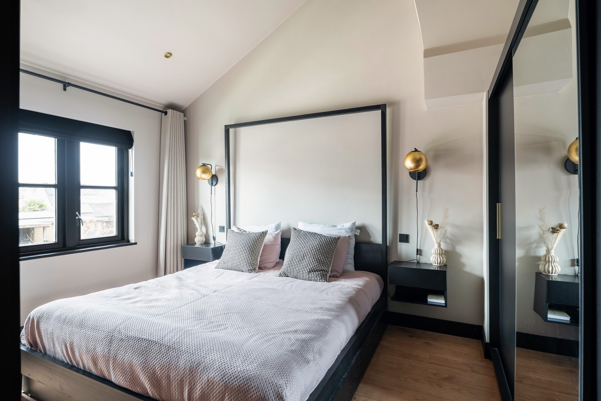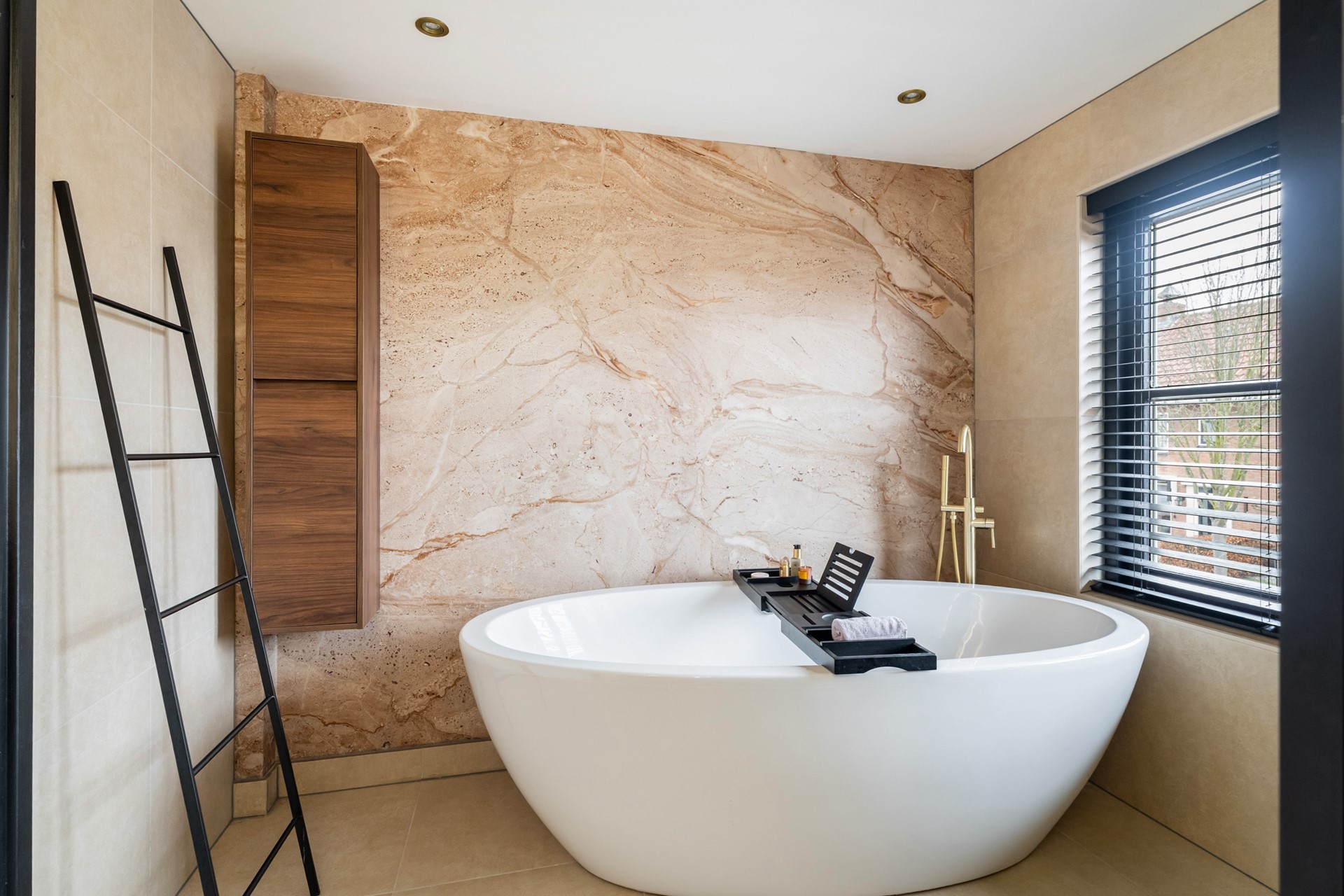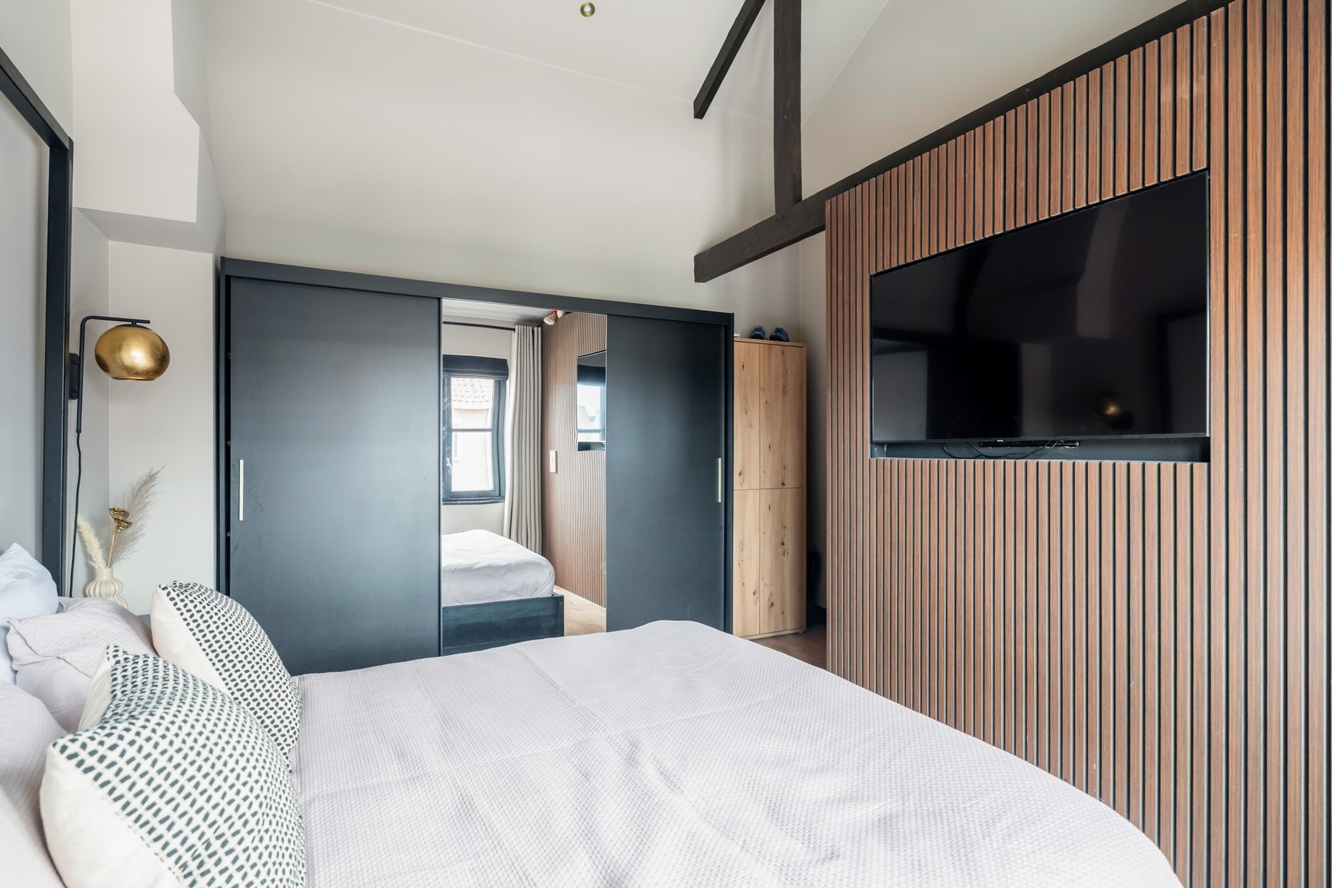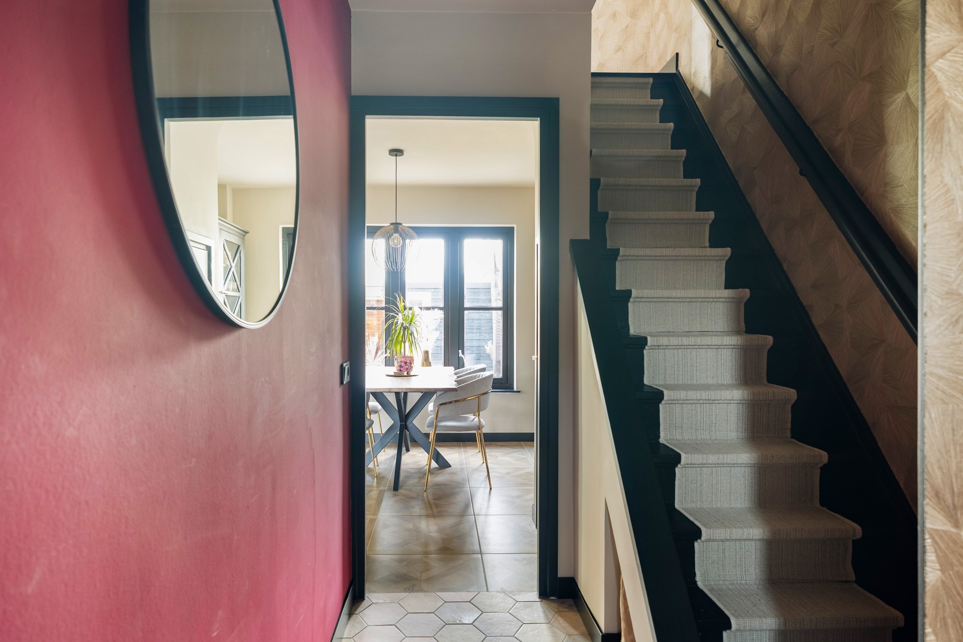 Via de trap bereik je de overloop van de 1e verdieping. Deze geeft toegang tot de moderne badkamer, twee slaapkamers en een praktische berging. De recent vernieuwde badkamer bevindt zich aan de voorzijde van de woning en biedt dankzij de elektrische vloerverwarming voor extra comfort. De ruimte is ingericht met een vrijstaand ligbad, een separate douche en een stijlvol wastafelmeubel met dubbele waskommen. De naastgelegen hoofdslaapkamer en de kinderkamer aan de achterzijde zijn beide keurig afgewerkt met strak gestucte wanden en een plafond met inbouwspots. De berging op deze verdieping is voorzien van aansluitingen voor een wasmachine en droger en leent zich daardoor uitstekend als praktische wasruimte.