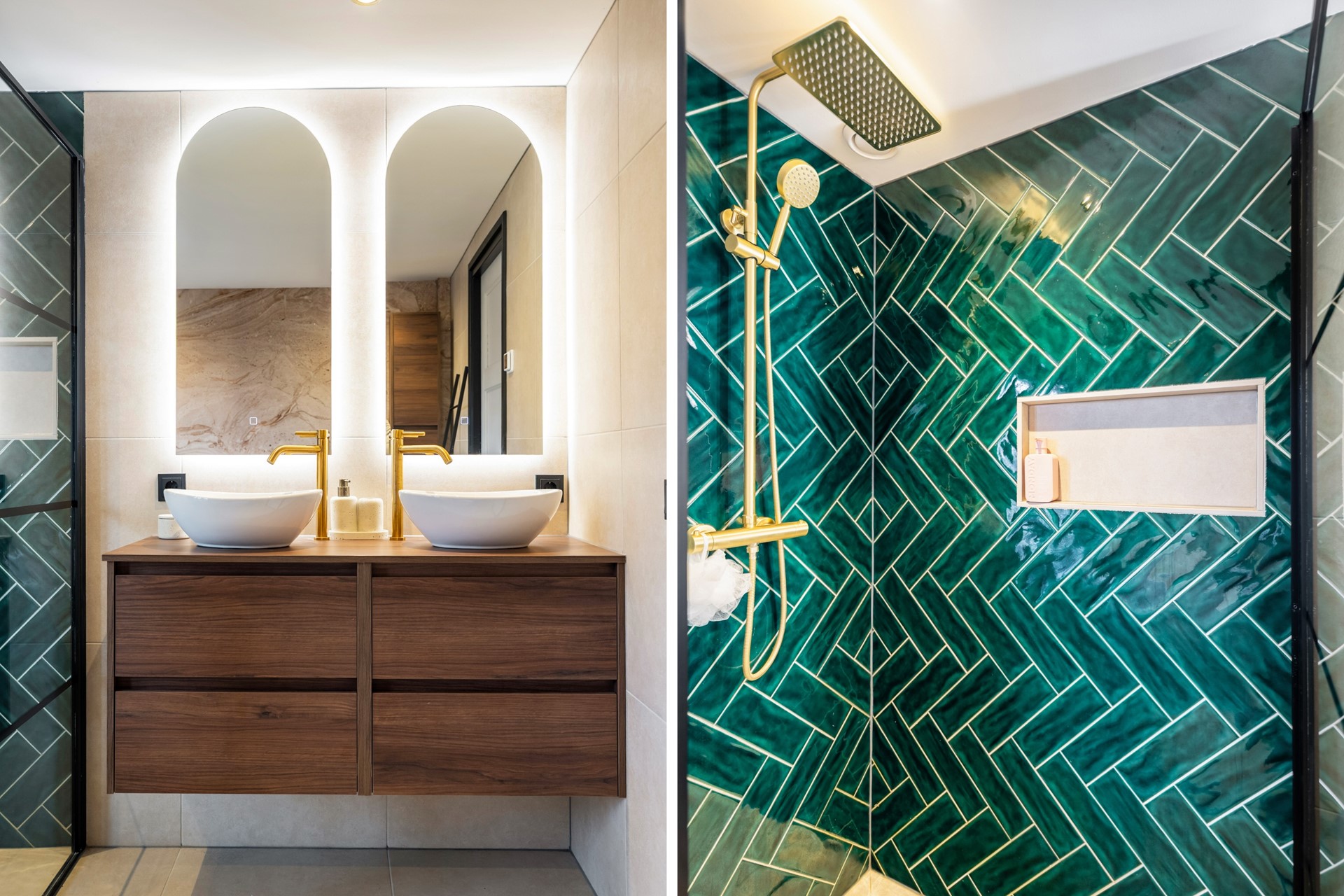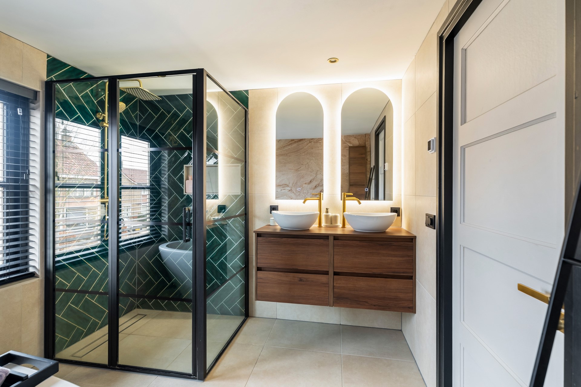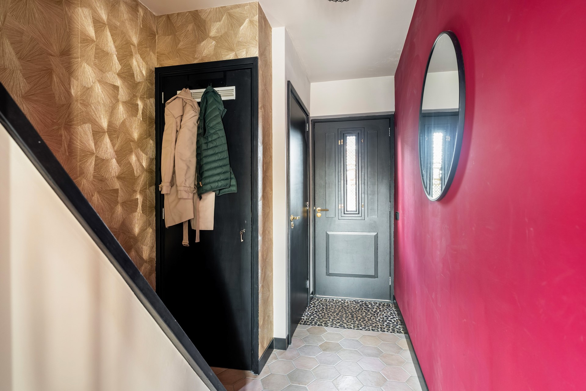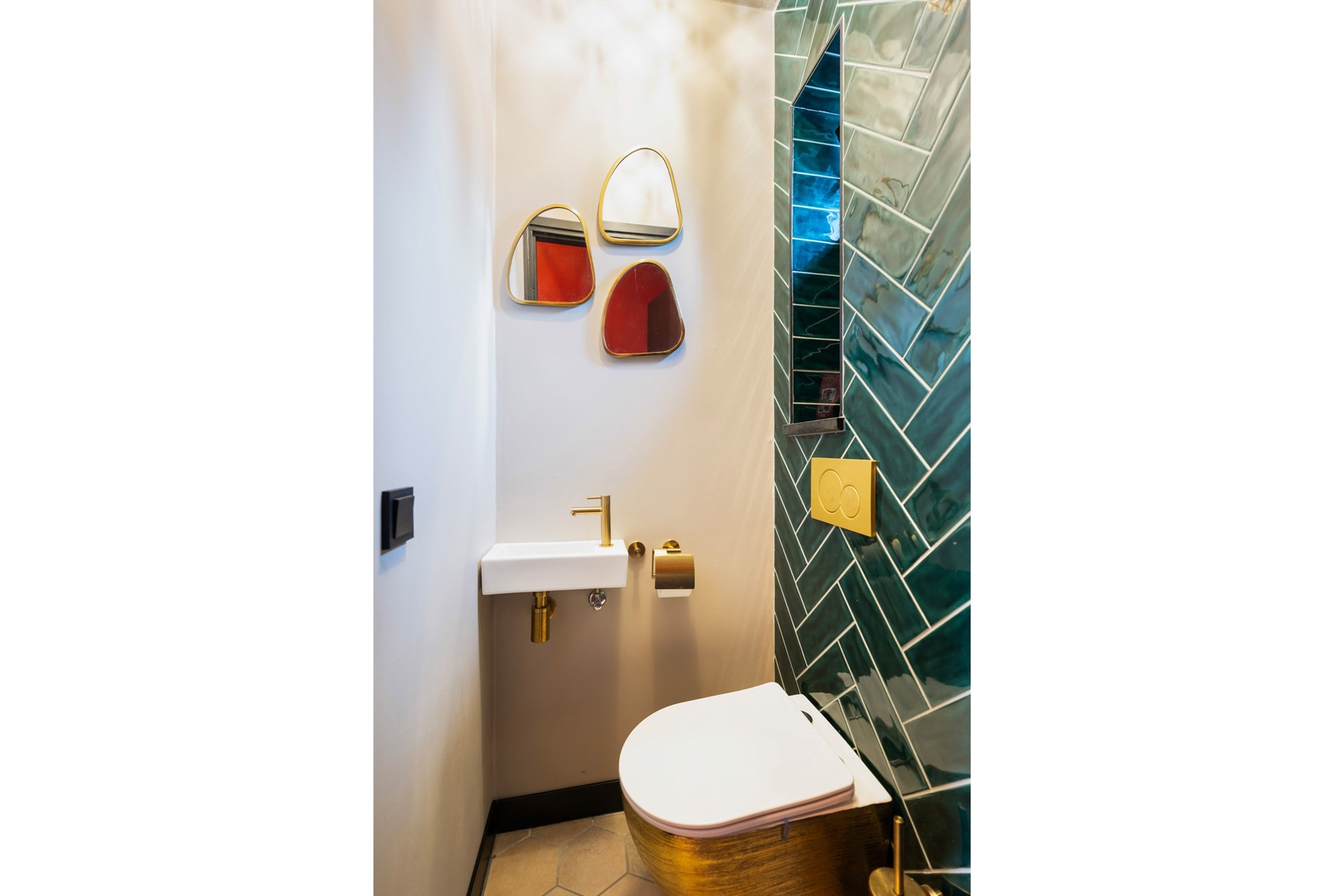 Via de trap bereik je de overloop van de 1e verdieping. Deze geeft toegang tot de moderne badkamer, twee slaapkamers en een praktische berging. De recent vernieuwde badkamer bevindt zich aan de voorzijde van de woning en biedt dankzij de elektrische vloerverwarming voor extra comfort. De ruimte is ingericht met een vrijstaand ligbad, een separate douche en een stijlvol wastafelmeubel met dubbele waskommen. De naastgelegen hoofdslaapkamer en de kinderkamer aan de achterzijde zijn beide keurig afgewerkt met strak gestucte wanden en een plafond met inbouwspots. De berging op deze verdieping is voorzien van aansluitingen voor een wasmachine en droger en leent zich daardoor uitstekend als praktische wasruimte.