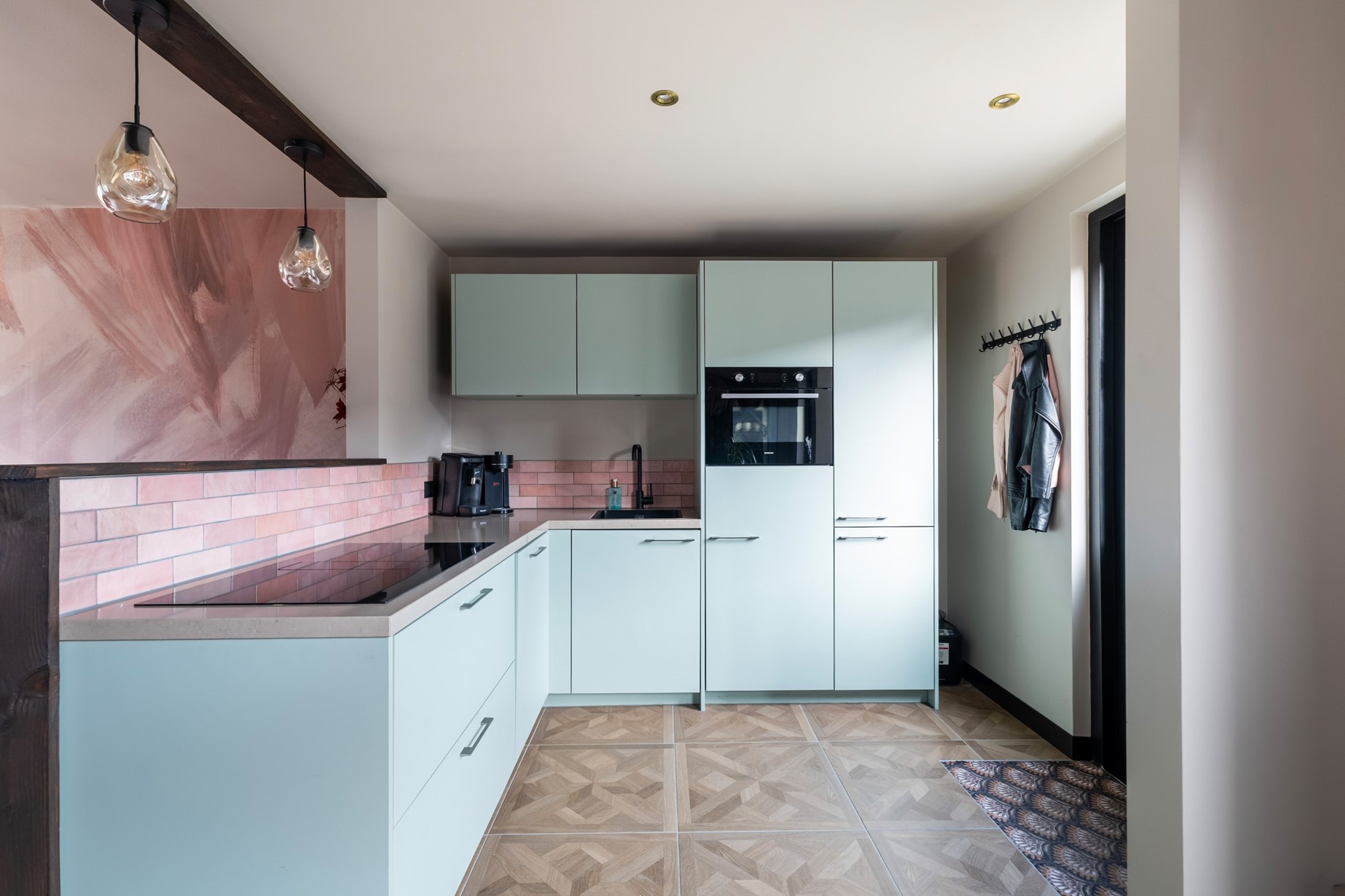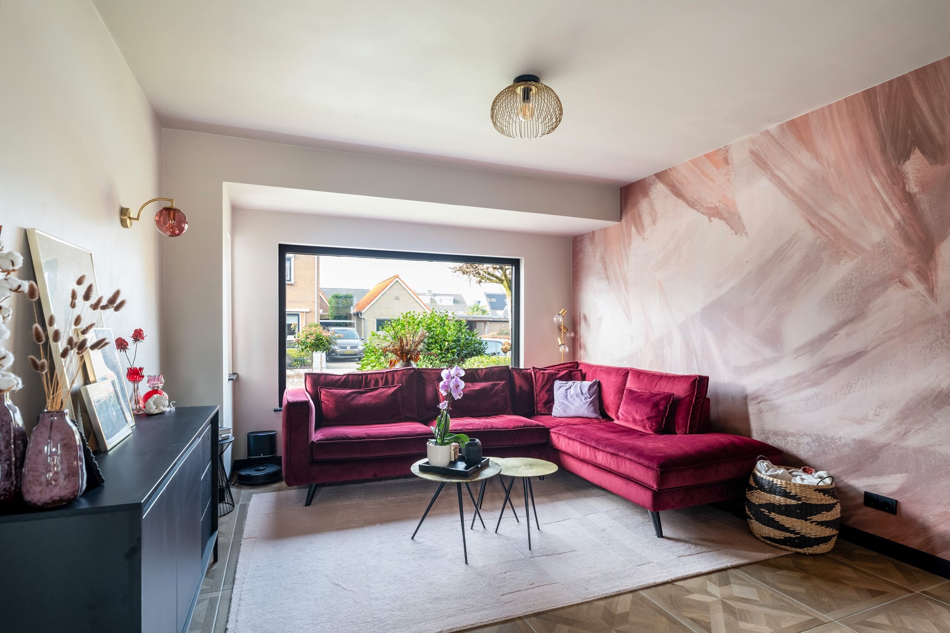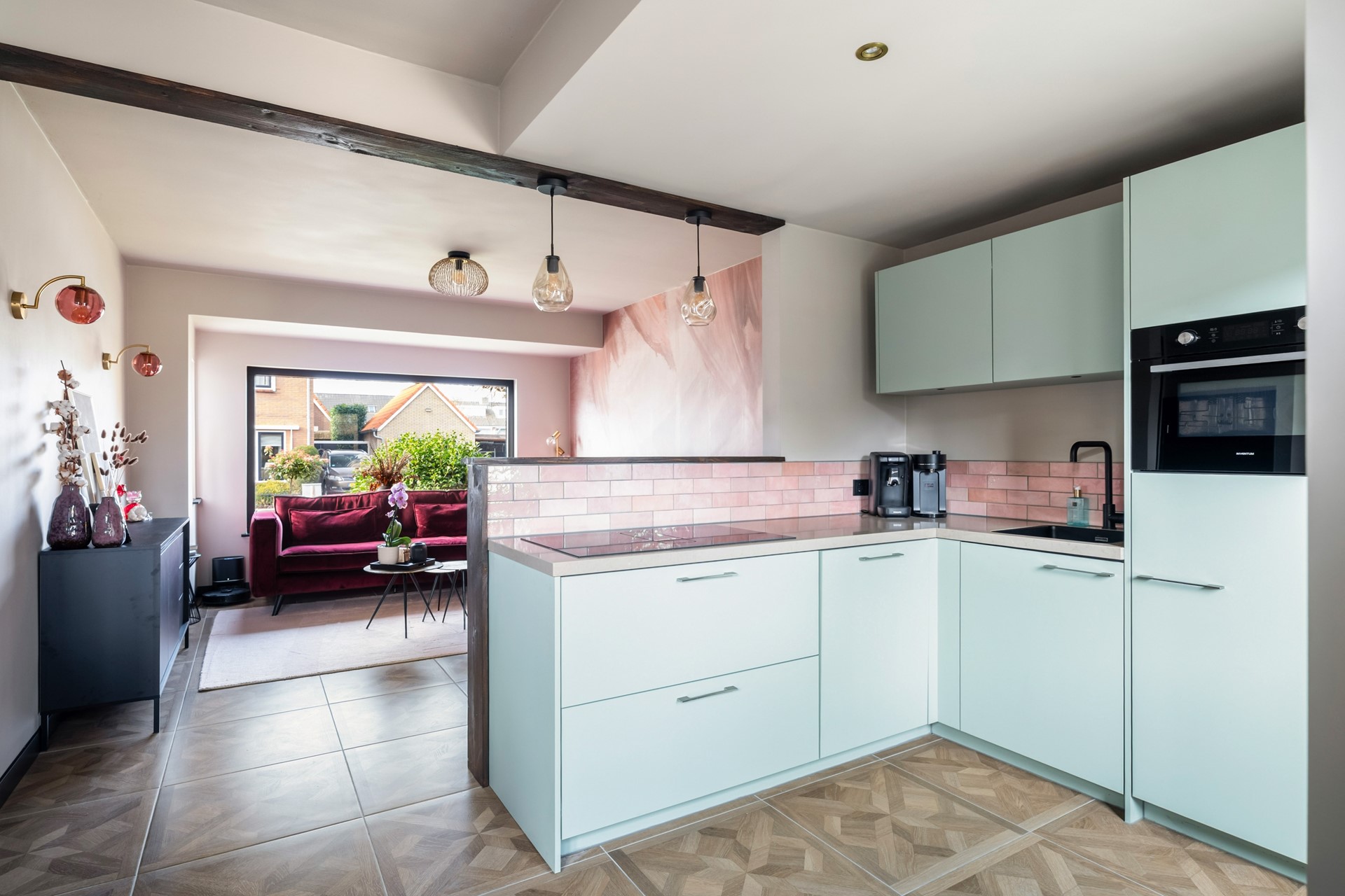 Via de entree kom je binnen in de hal, die toegang geeft tot de toiletruimte met wandcloset en fonteintje, de meterkast met glasvezelaansluiting, de trap naar de 1e verdieping en de keuken. De nieuwe keuken is opgesteld in een hoekopstelling en uitgerust met diverse inbouwapparatuur, waaronder een inductiekookplaat met geïntegreerde down-draft afzuiging, koelkast, combi-oven en vaatwasser. Vanuit de keuken geeft een loopdeur direct toegang tot het terras. De woonkamer bevindt zich aan de voorzijde van de woning en profiteert dankzij de grote raampartij van een prettige lichtinval en een fraai uitzicht. De open verbinding met de keuken zorgt voor een ruimtelijke leefomgeving. De gehele begane grond is voorzien van vloerverwarming. Zowel de wanden als het plafond zijn strak afgewerkt en uitgerust met inbouwspots, wat zorgt voor een moderne en verzorgde uitstraling.