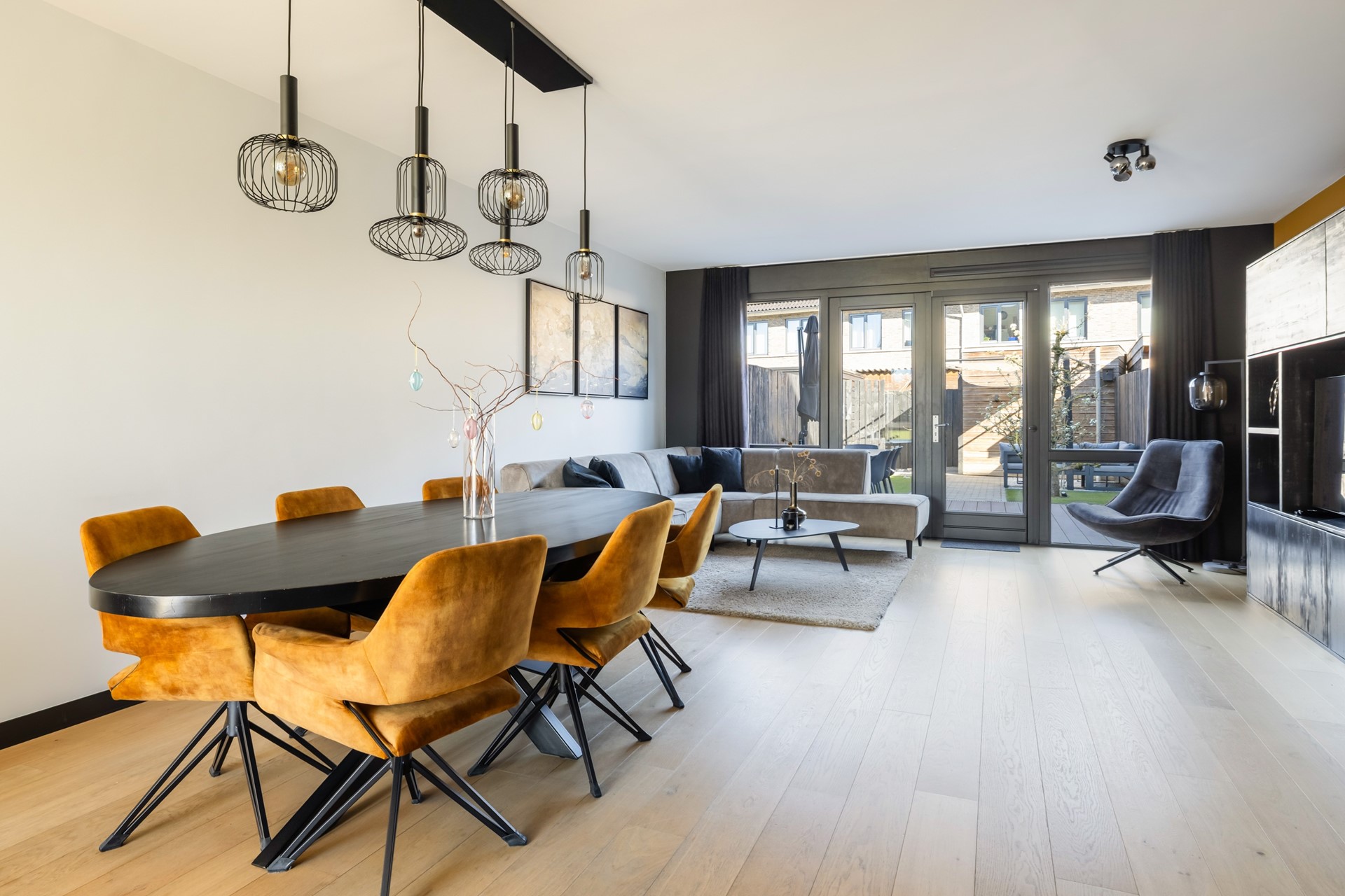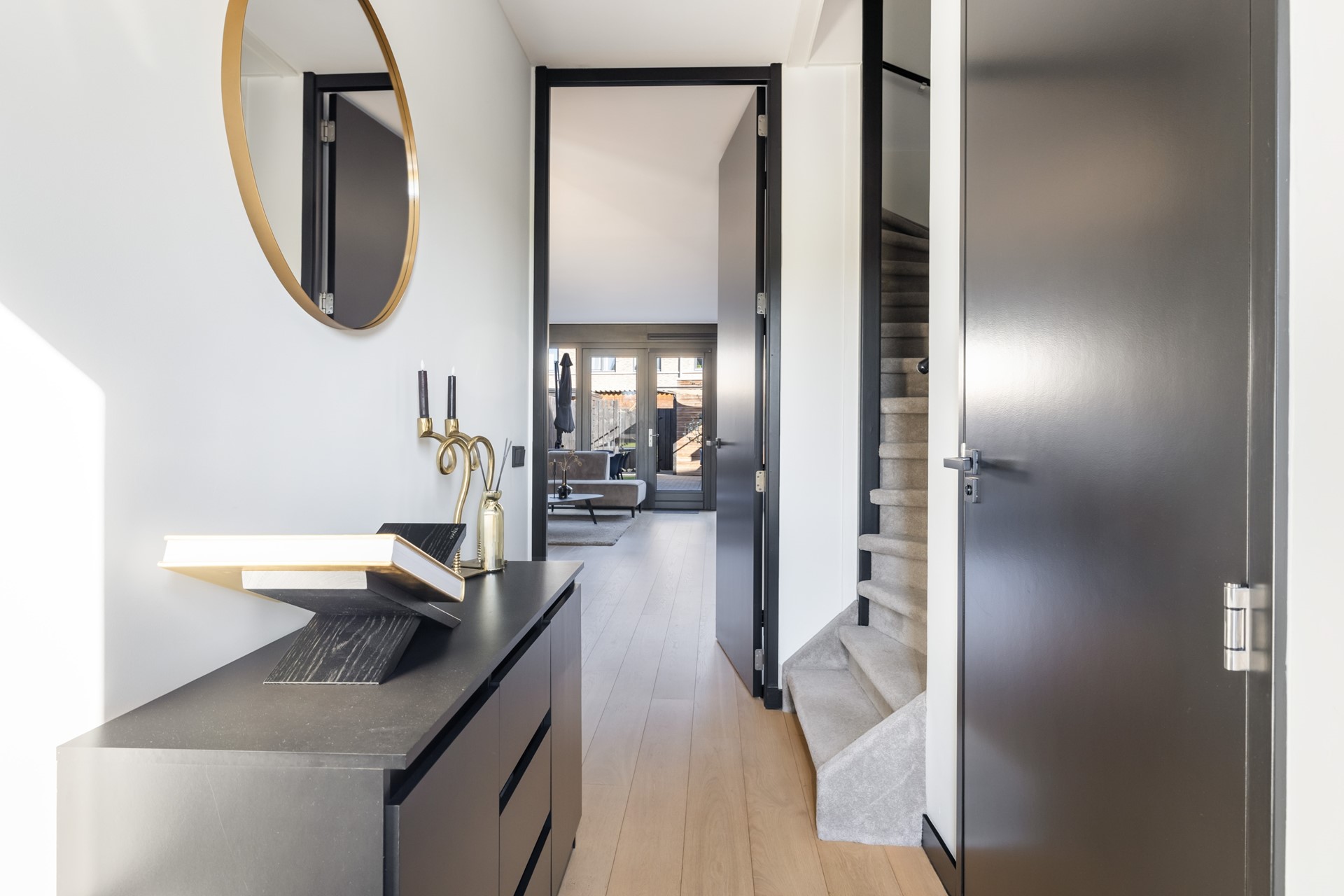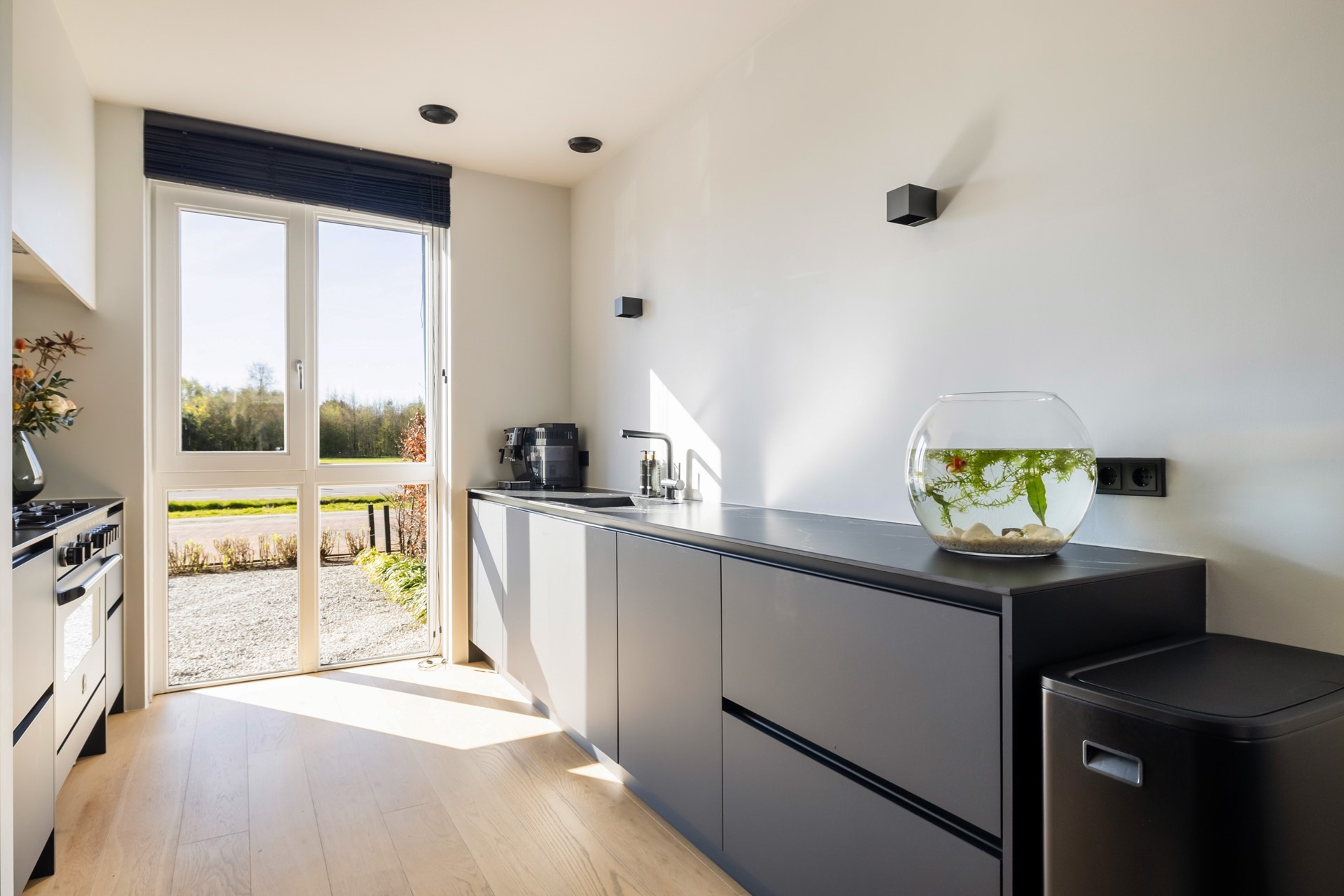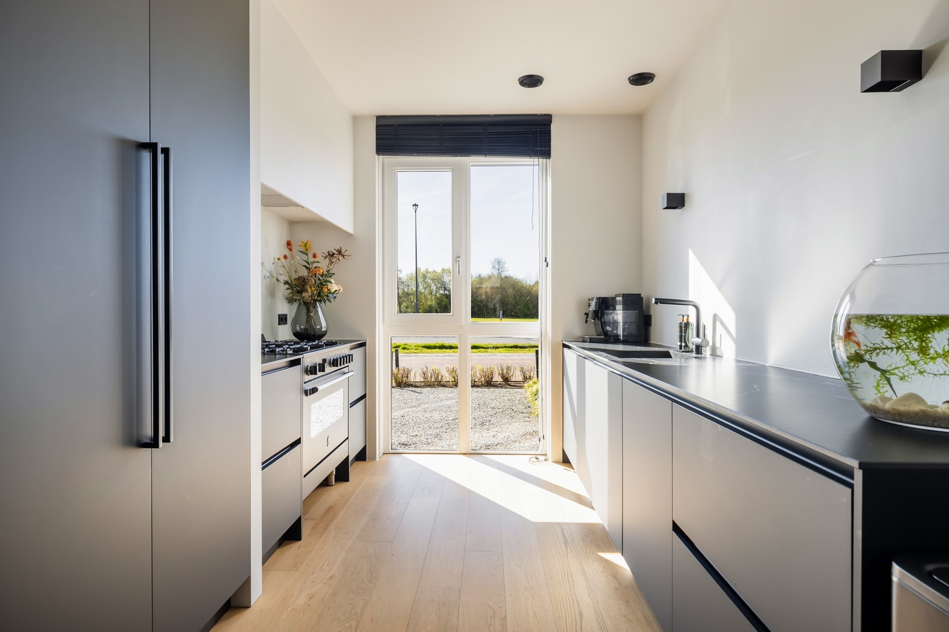 Via de entree kom je in de hal met meterkast, voorzien van glasvezel, de toiletruimte met wandcloset en fontein, de trapopgang naar de eerste verdieping en toegang tot de woonkamer. De uitgebouwde woonkamer voelt ruim en licht aan en beschikt over een praktische provisiekast en een nette houten vloer. Aan de achterzijde bevindt zich de moderne keuken met twee rechte opstellingen, uitgerust met onder andere een 6-pits fornuis met oven, afzuigkap, koelkast en vaatwasser. Dankzij de openslaande deuren loopt binnen hier moeiteloos over in buiten en stap je zo de achtertuin in. De begane grond is volledig voorzien van comfortabele vloerverwarming.