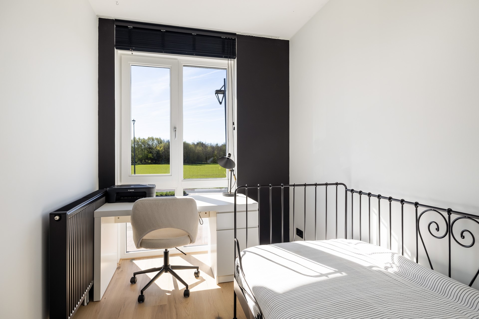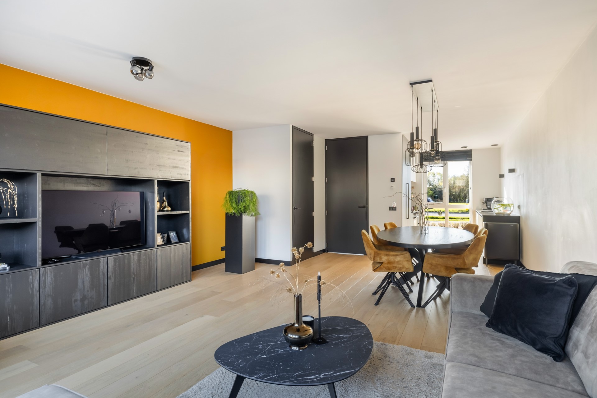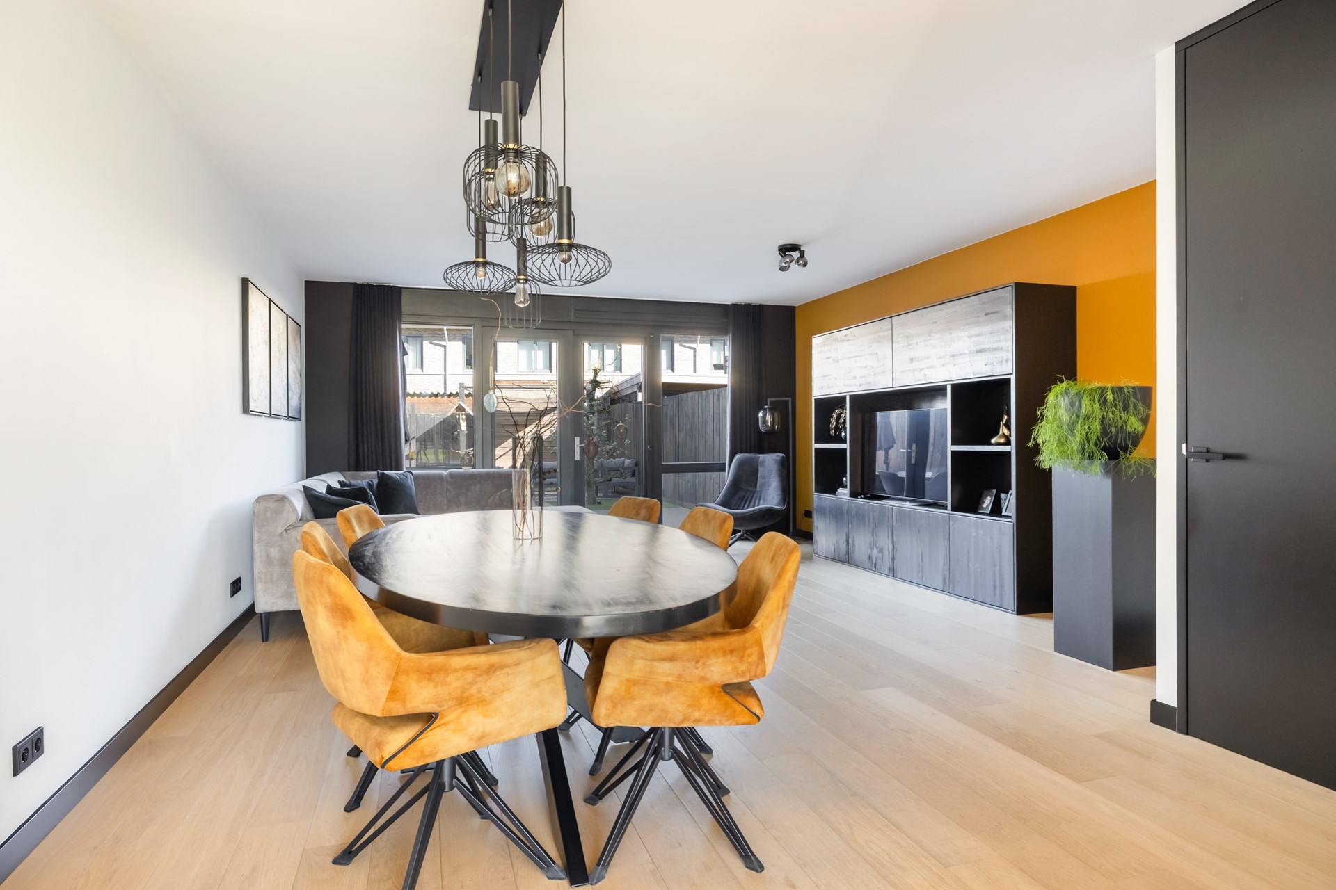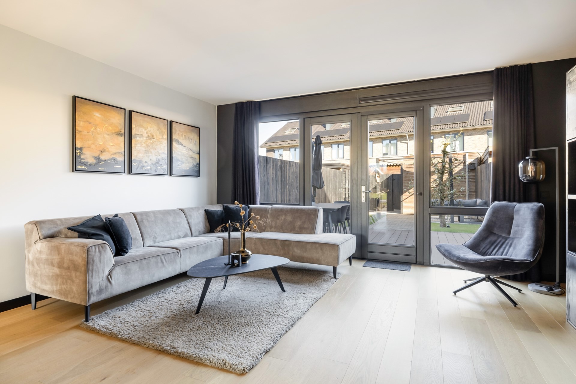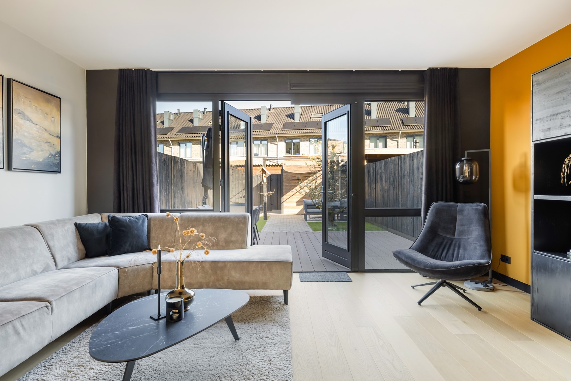 Via de entree kom je in de hal met meterkast, voorzien van glasvezel, de toiletruimte met wandcloset en fontein, de trapopgang naar de eerste verdieping en toegang tot de woonkamer. De uitgebouwde woonkamer voelt ruim en licht aan en beschikt over een praktische provisiekast en een nette houten vloer. Aan de achterzijde bevindt zich de moderne keuken met twee rechte opstellingen, uitgerust met onder andere een 6-pits fornuis met oven, afzuigkap, koelkast en vaatwasser. Dankzij de openslaande deuren loopt binnen hier moeiteloos over in buiten en stap je zo de achtertuin in. De begane grond is volledig voorzien van comfortabele vloerverwarming.