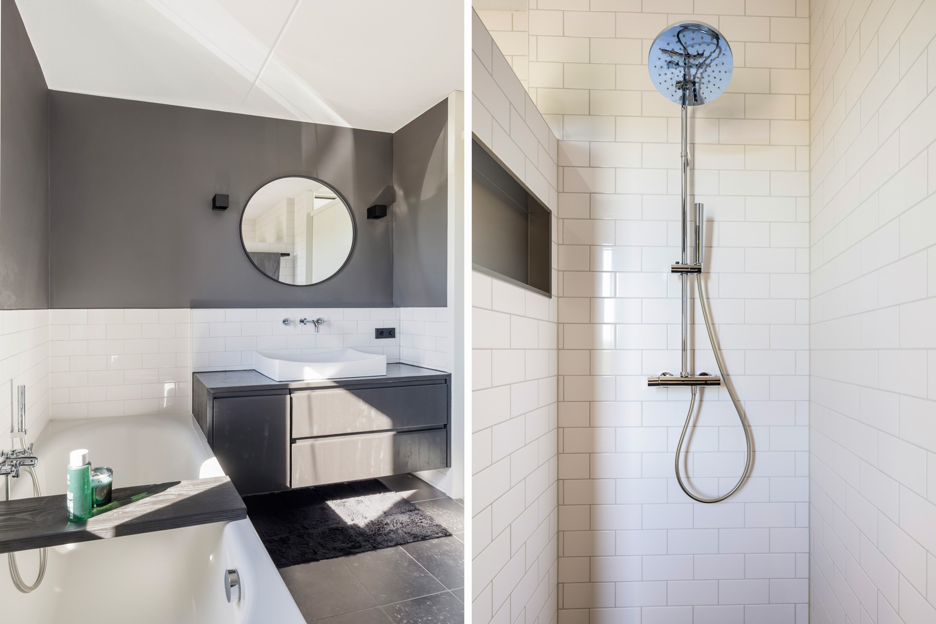 Op de eerste verdieping bereik je via de overloop drie slaapkamers en de badkamer. De betegelde badkamer is ingericht met een inloopdouche, ligbad, wandcloset en een wastafelmeubel. De ouderslaapkamer ligt aan de rustige achterzijde van de woning, net als een tweede slaapkamer, terwijl de derde slaapkamer zich aan de voorzijde bevindt, direct naast de badkamer.