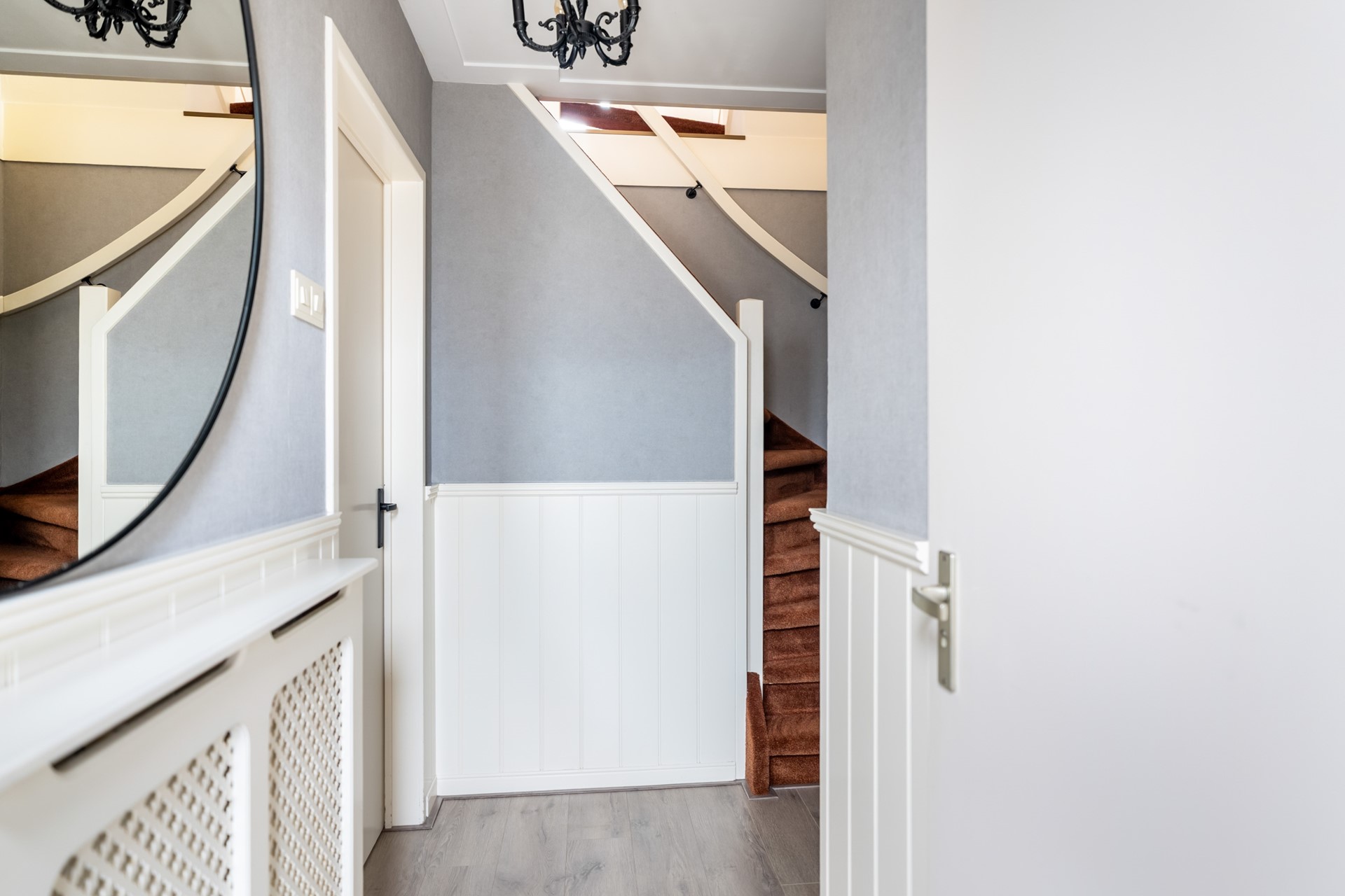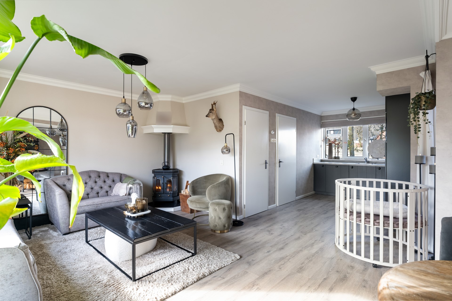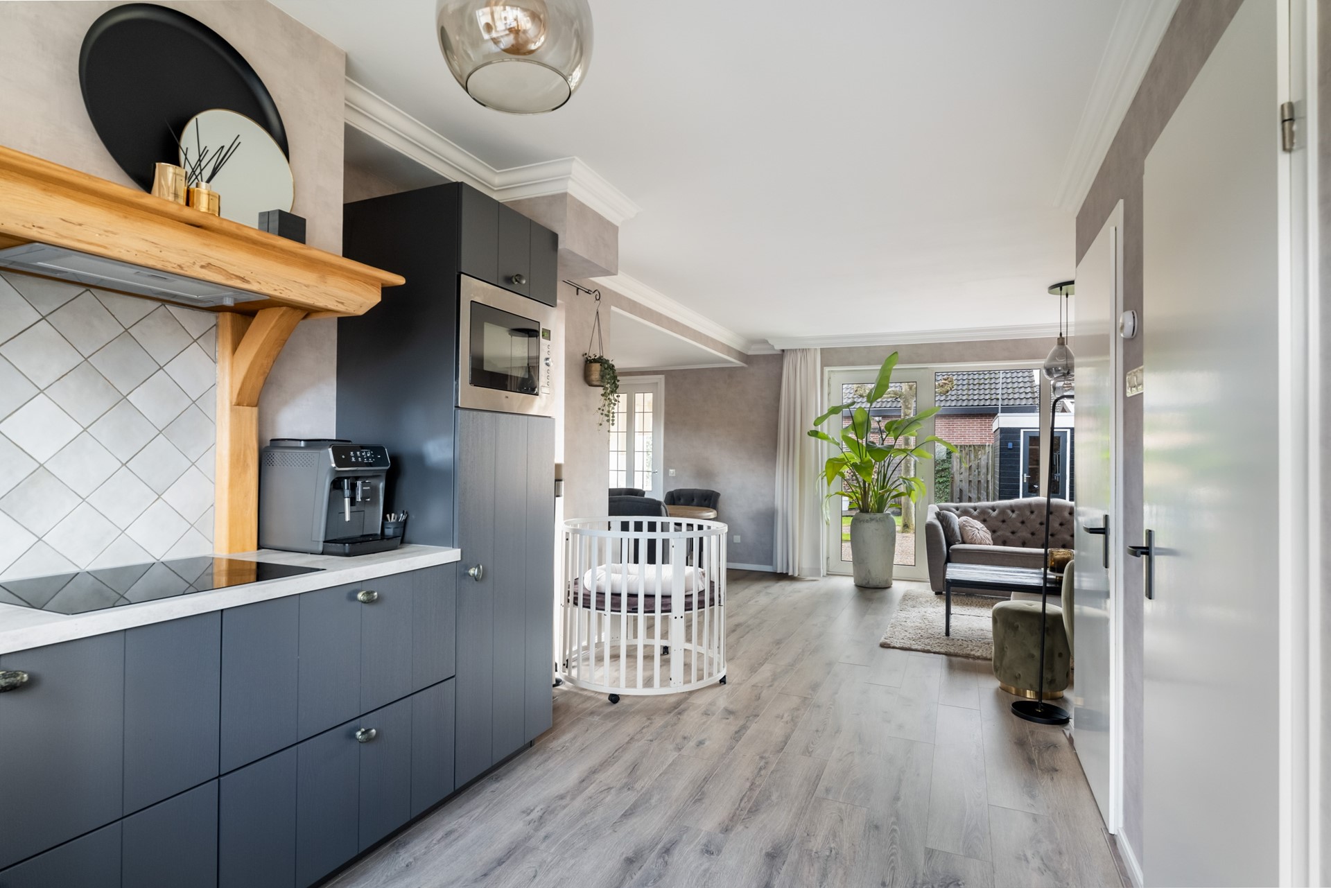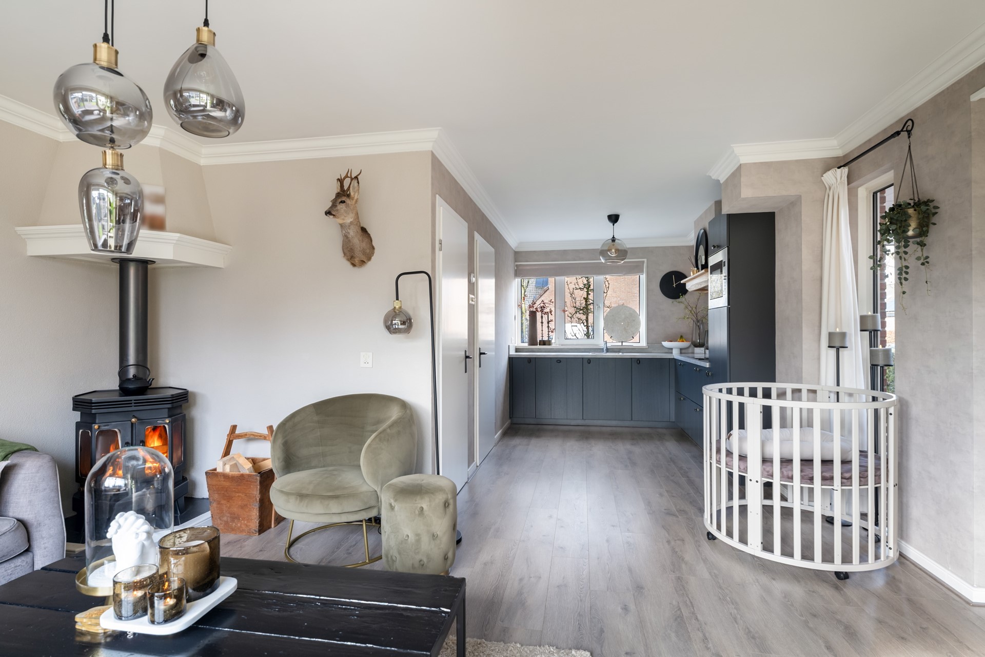 Via de entree stap je binnen in de hal, die toegang geeft tot de meterkast (voorzien van glasvezelaansluiting), de toiletruimte met wandcloset, de trapopgang naar de eerste verdieping en de keuken. De keuken is aan de voorzijde van de woning gesitueerd en uitgevoerd in een praktische hoekopstelling. Deze is voorzien van diverse inbouwapparatuur, waaronder een inductiekookplaat, afzuigkap, combi-oven, koelkast en vaatwasser. De woonkamer bevindt zich aan de achterzijde van de woning en beschikt over een sfeervolle houtkachel. De ruimte staat in open verbinding met de keuken en biedt voldoende plaats voor een gezellige eethoek. De begane grond is strak afgewerkt en voorzien van vloerverwarming en een strak plafond met inbouwspots. In de bijkeuken vind je de aansluiting voor de wasmachine en een uitstortgootsteen. Vanuit deze ruimte heb je tevens toegang tot de achtertuin.