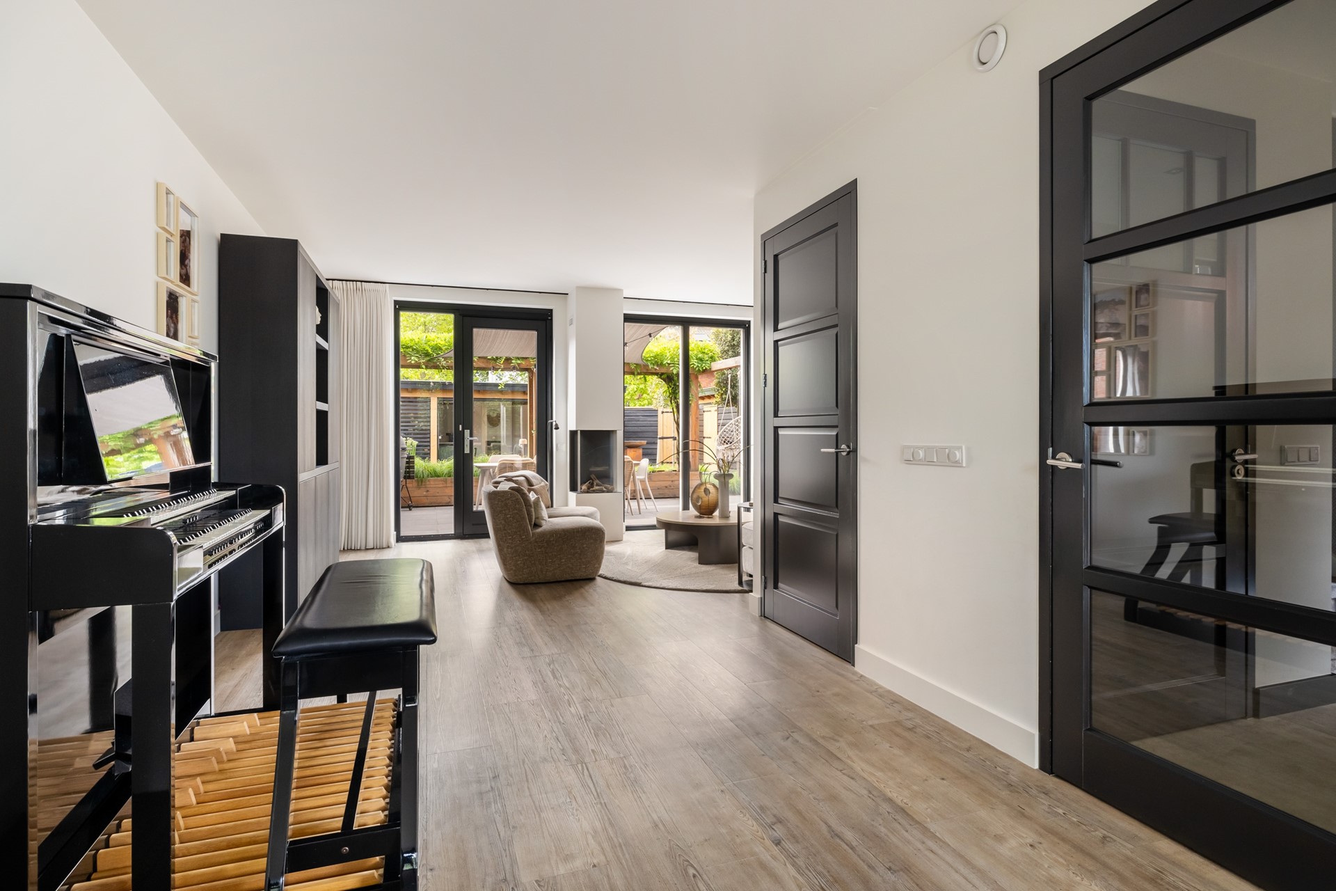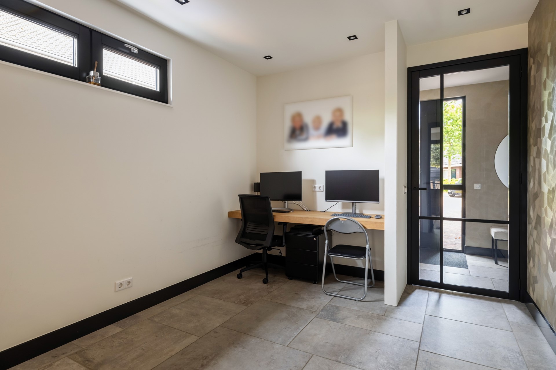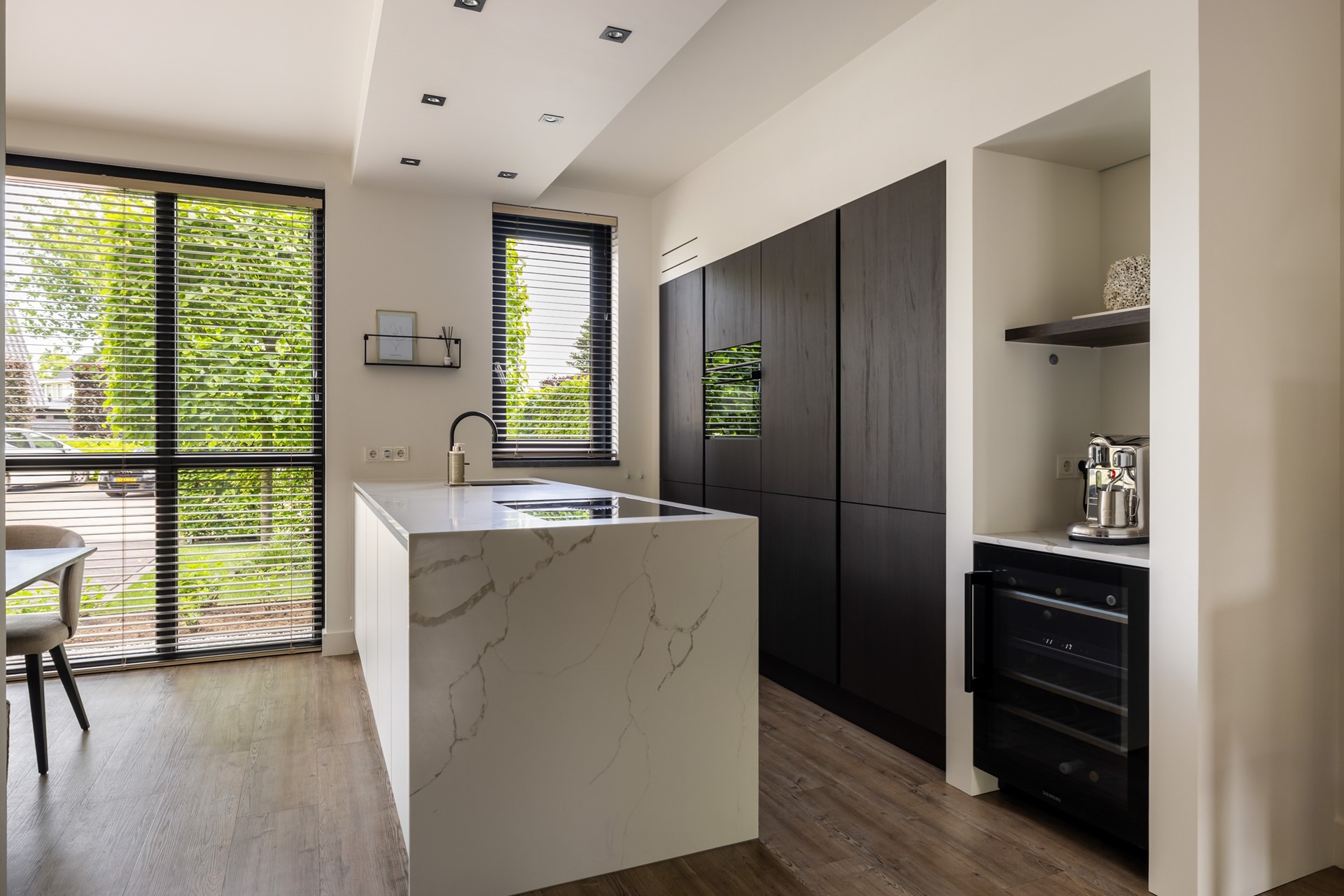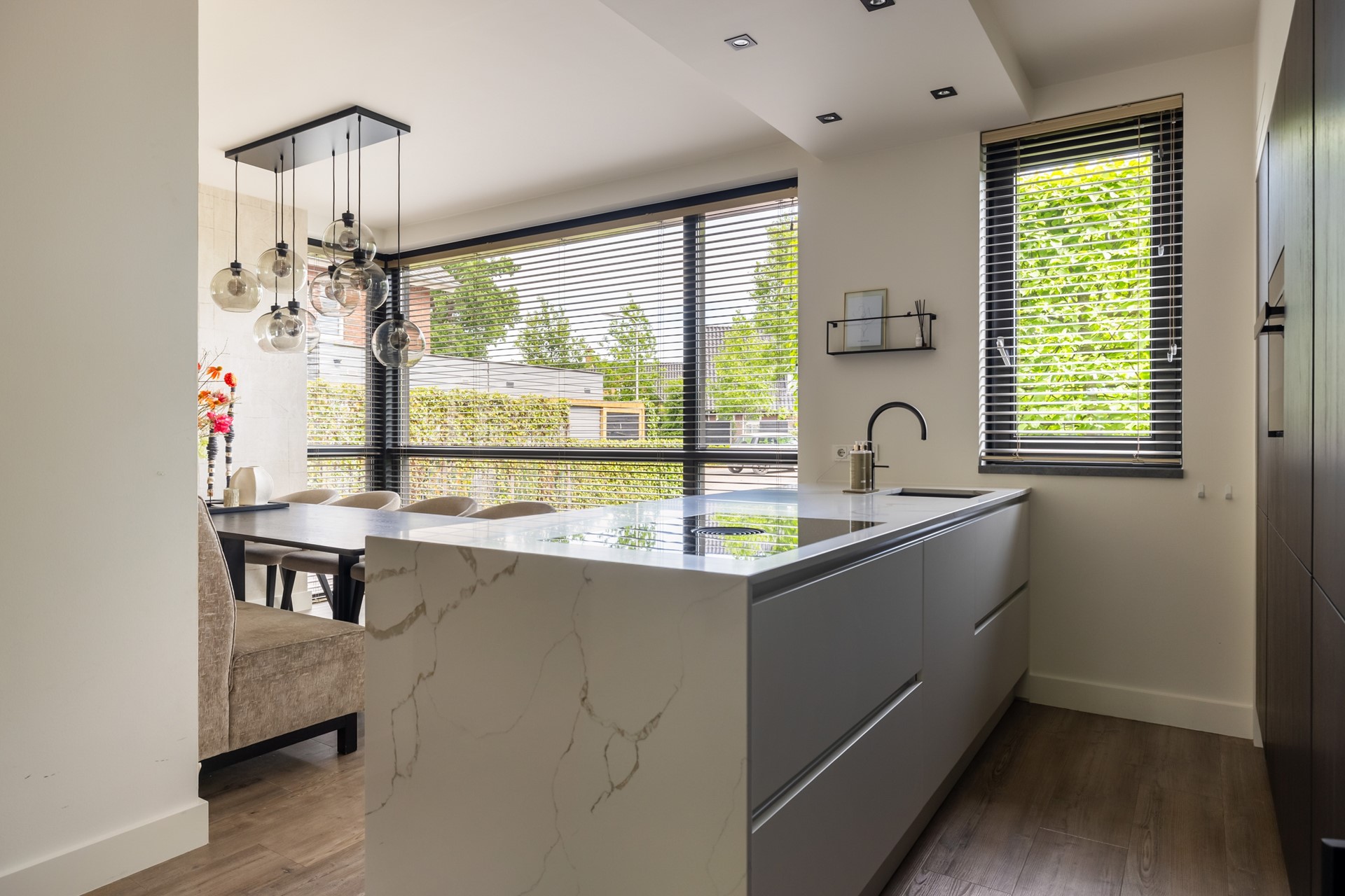 Via de overdekte entree bereik je de ruime hal, die je toegang geeft tot de werkkamer, trapopgang naar de eerste verdieping, toiletruimte met wandcloset en fontein, meterkast (glasvezelaansluiting aanwezig) en de woonkamer. Deze gezellige woonkamer beschikt over een sfeervolle gashaard, grote raampartijen en directe toegang tot de achtertuin. De luxe keuken (2025) is aan de voorzijde van de woning gesitueerd en uitgerust van een kook- en spoelschiereiland. Daarnaast is de keuken voorzien van een inductiekookplaat (Bora downdraft), wijnklimaatkast, Quooker, koelkast, vriezer, vaatwasser en combi-oven. De werkkamer, bereikbaar vanuit de hal, is strak afgewerkt en uitgerust van inbouwspots en een vaste kastenwand. Grenzend aan de werkkamer is de bijkeuken met een praktisch keukenblok voorzien van wasbak en afzuigkap. Hier is ook voldoende ruimte om je fiets(en) te bergen. Tot slot is de gehele begane grond strak afgewerkt, voorzien van een pvc-vloer en vloerverwarming.