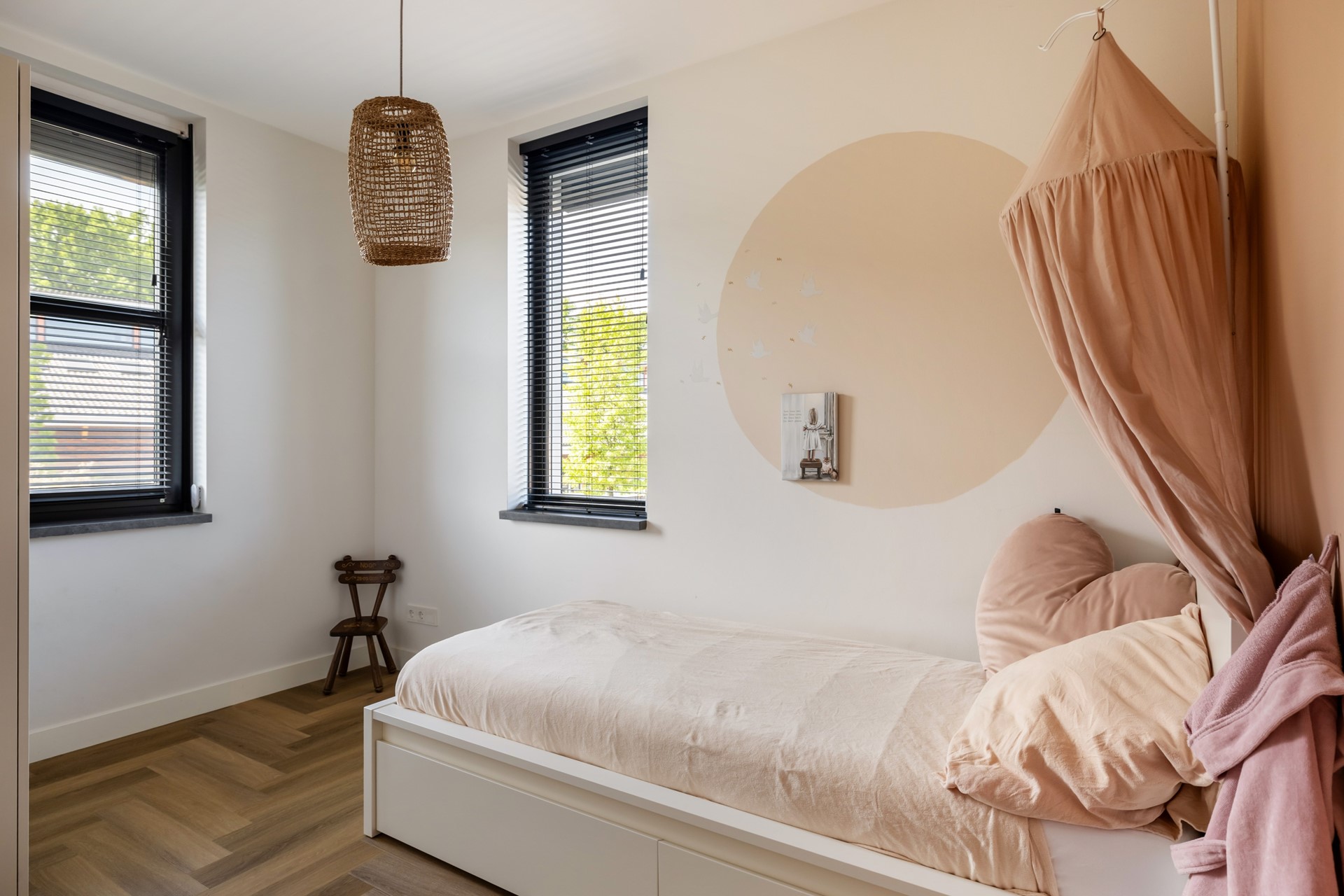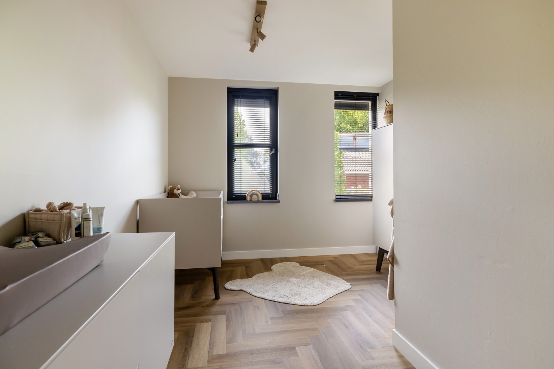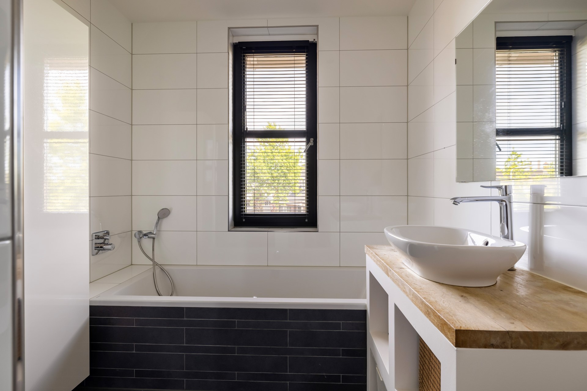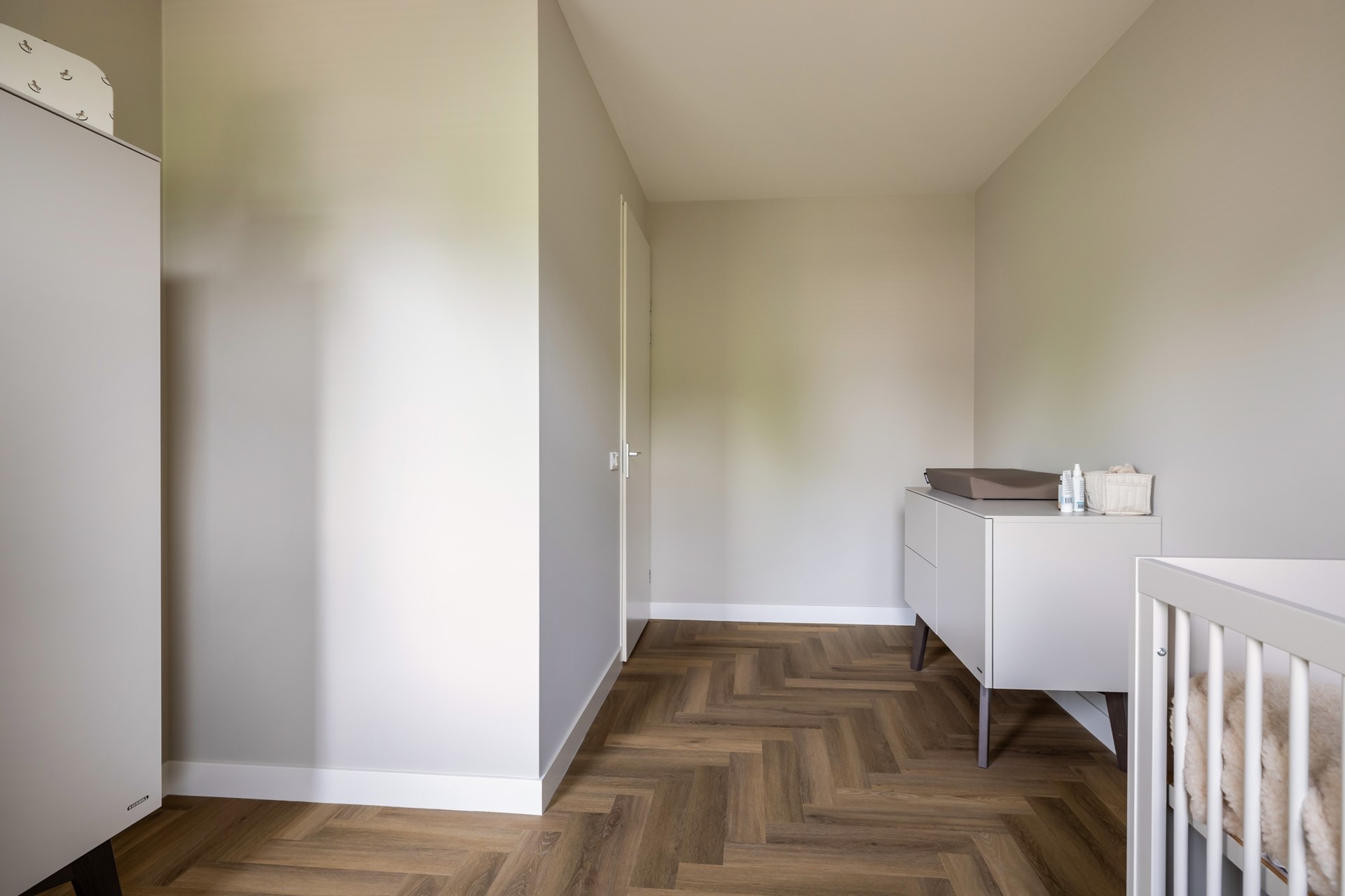 Via de trapopgang bereik je de overloop op de eerste verdieping. Vanaf hier heb je toegang tot drie ruime slaapkamers, een separate toiletruimte met wandcloset en de badkamer. De volledig betegelde badkamer met vloerverwarming is uitgerust met een inloopdouche, een wastafelmeubel, badkamerkast en een comfortabel ligbad. De aangrenzende slaapkamer fungeert als ouderslaapkamer en beschikt over een nette vaste inbouwkast. De twee overige slaapkamers, gelegen aan de achterzijde van de woning, zijn eveneens keurig afgewerkt. Ook op deze verdieping ligt een pvc-vloer en is er vloerverwarming aanwezig, wat bijdraagt aan het comfort.