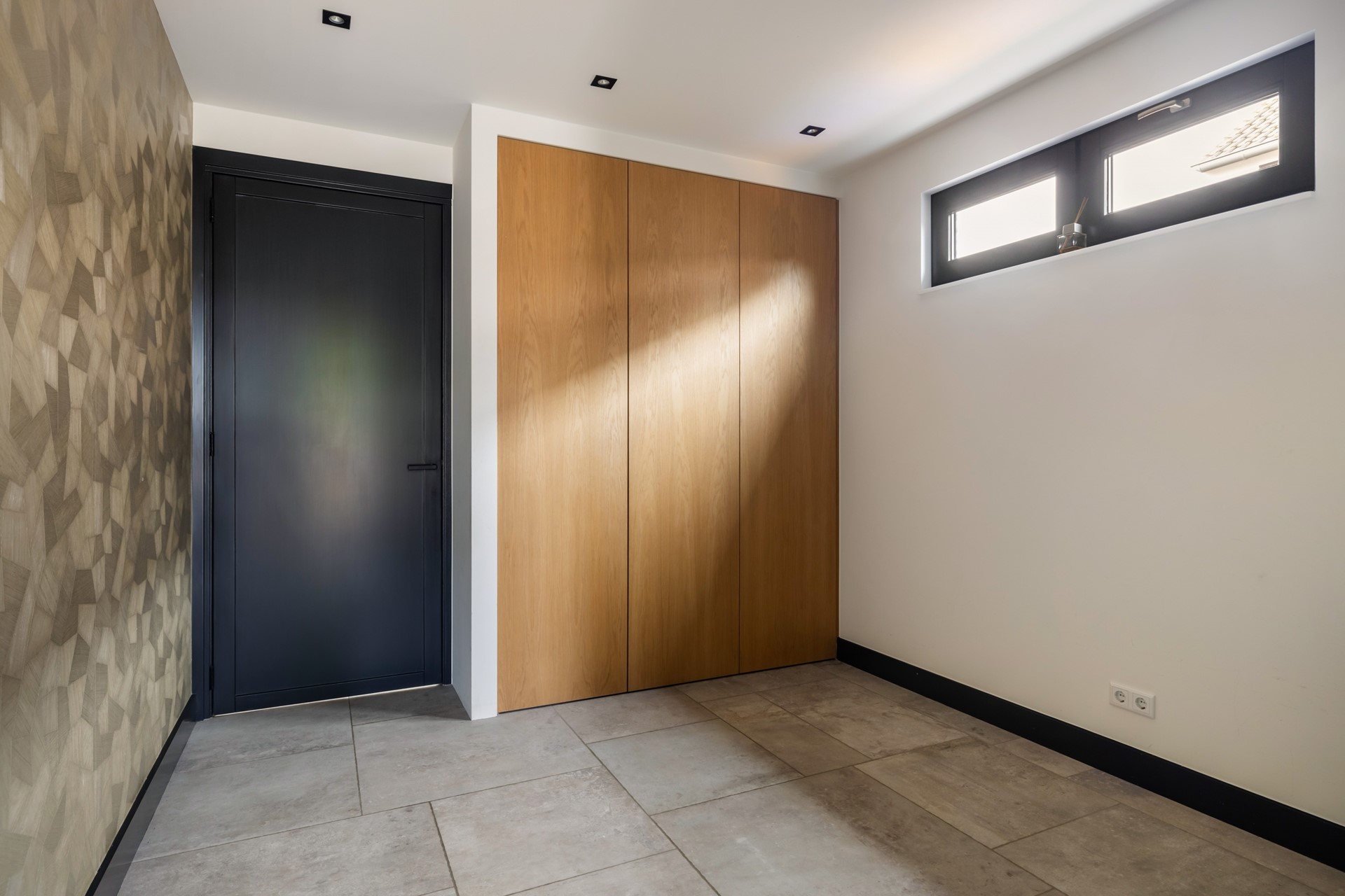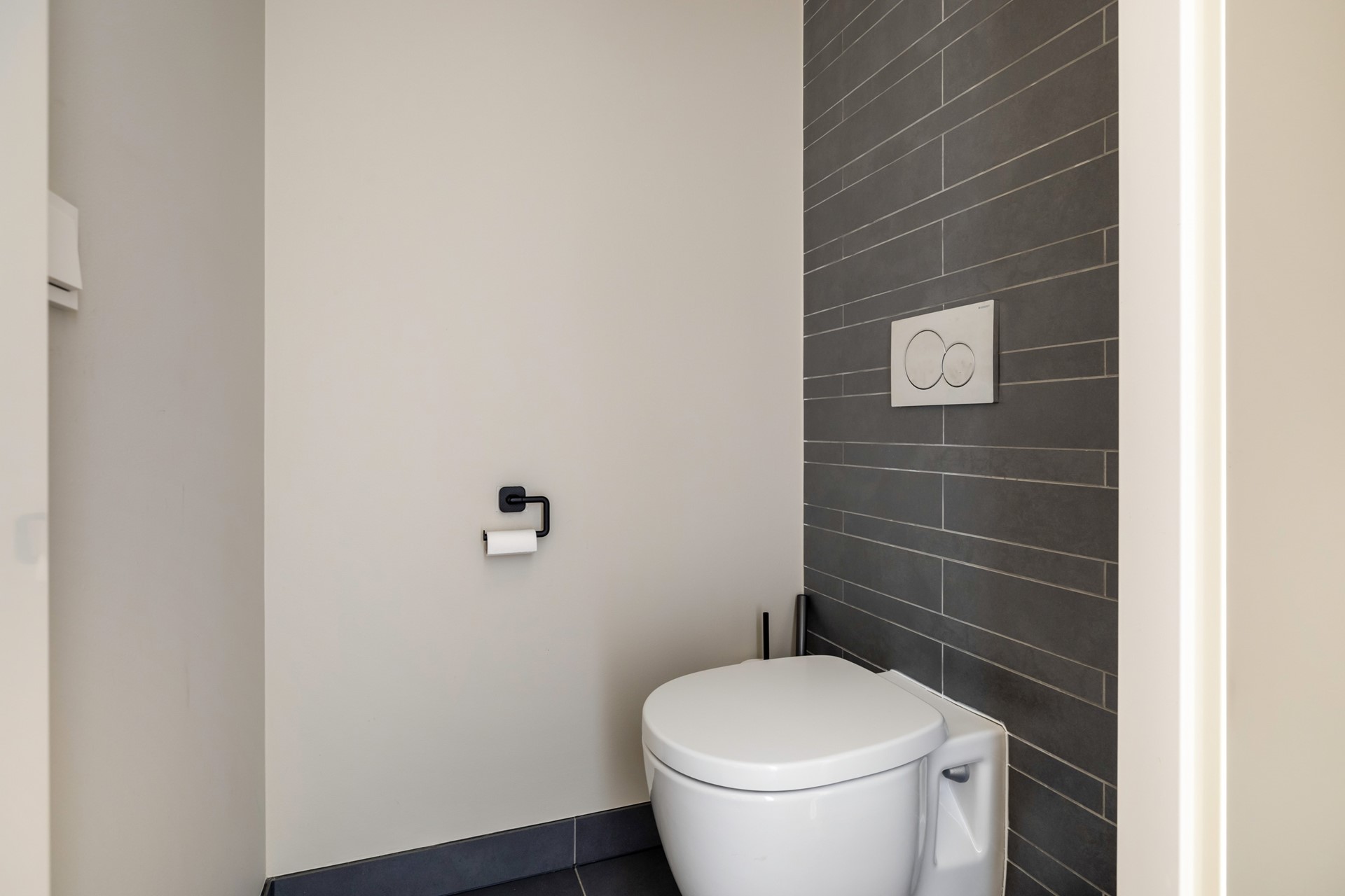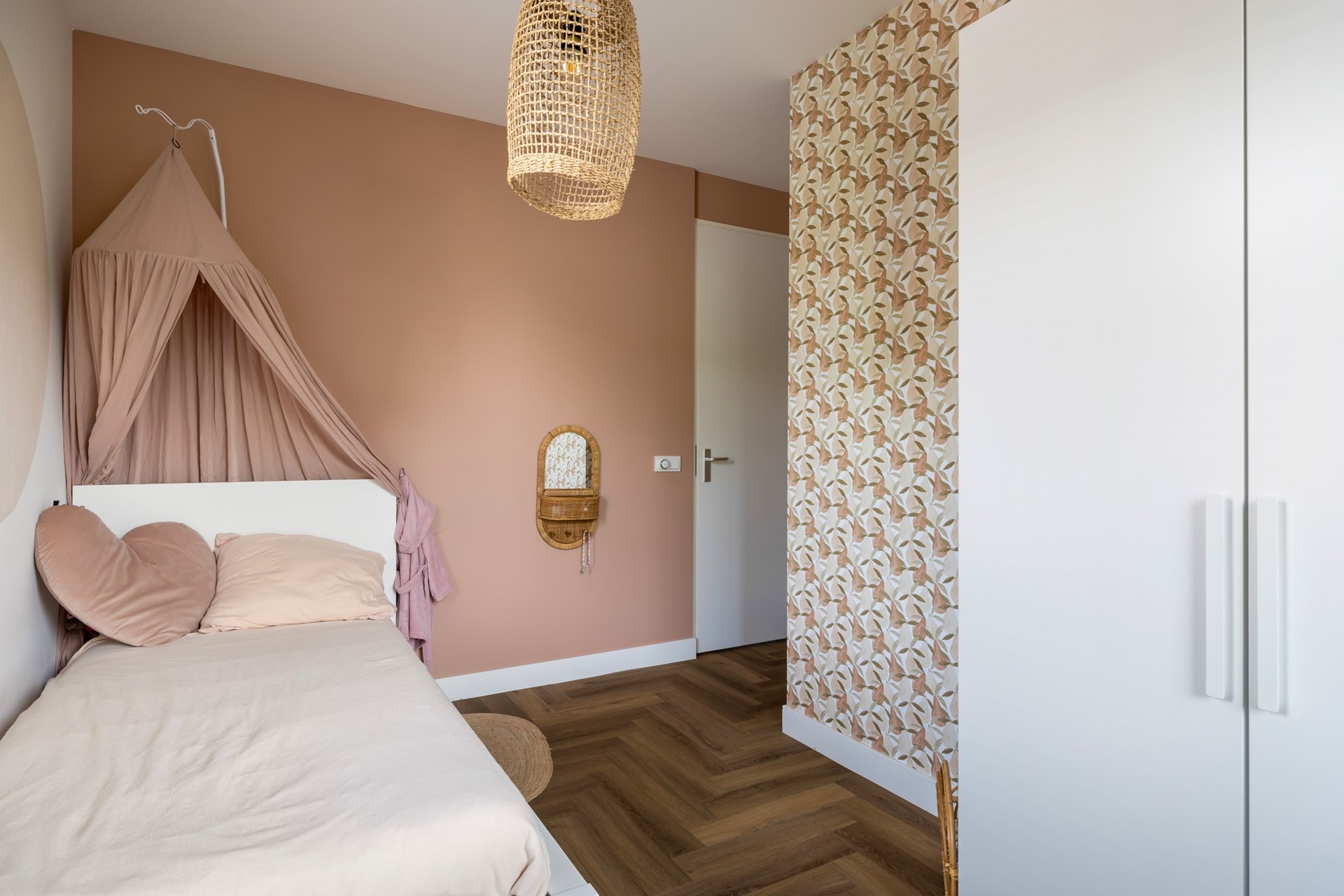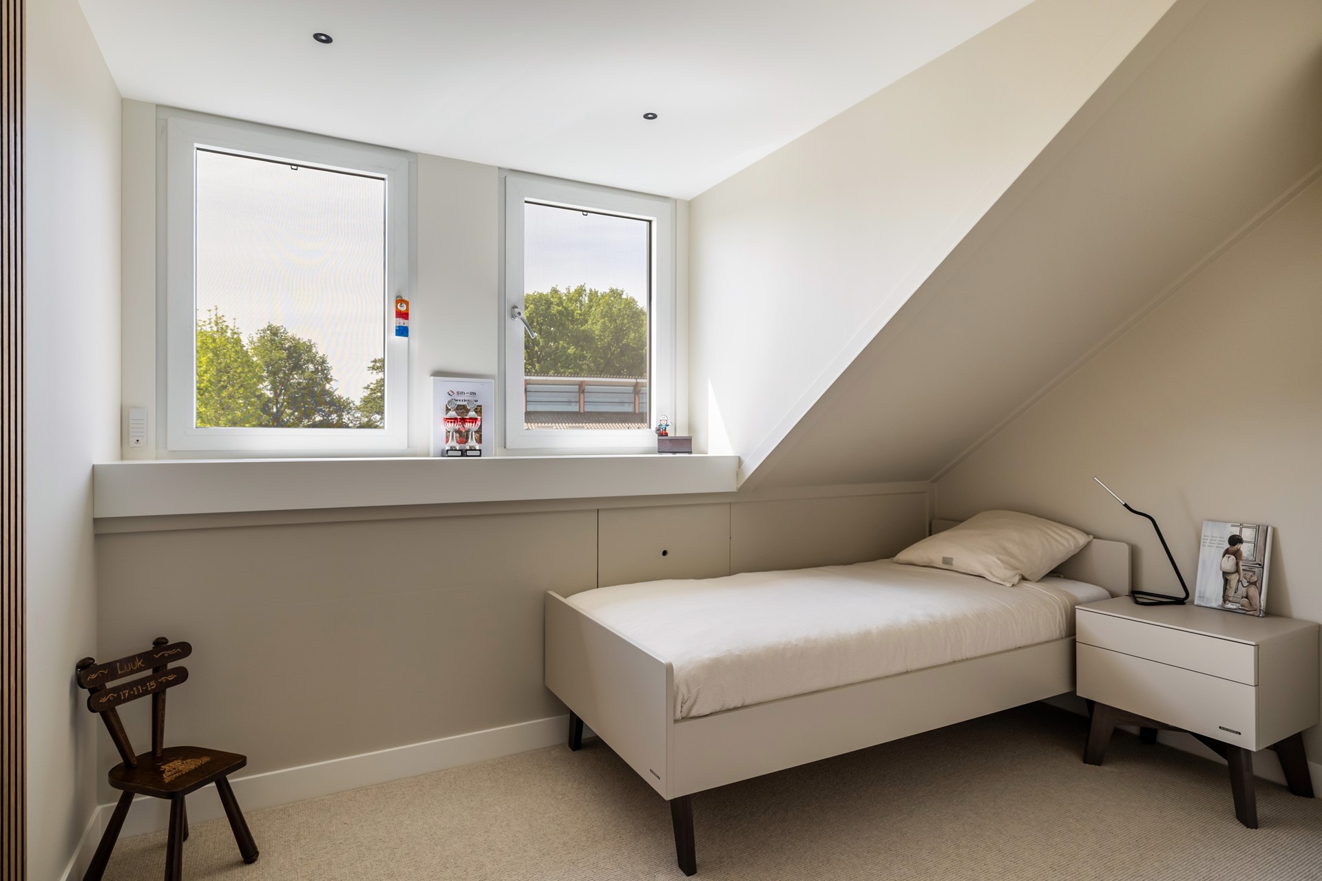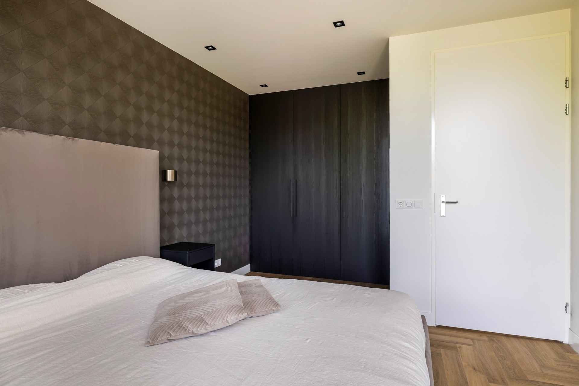 Via de trapopgang bereik je de overloop op de eerste verdieping. Vanaf hier heb je toegang tot drie ruime slaapkamers, een separate toiletruimte met wandcloset en de badkamer. De volledig betegelde badkamer met vloerverwarming is uitgerust met een inloopdouche, een wastafelmeubel, badkamerkast en een comfortabel ligbad. De aangrenzende slaapkamer fungeert als ouderslaapkamer en beschikt over een nette vaste inbouwkast. De twee overige slaapkamers, gelegen aan de achterzijde van de woning, zijn eveneens keurig afgewerkt. Ook op deze verdieping ligt een pvc-vloer en is er vloerverwarming aanwezig, wat bijdraagt aan het comfort.