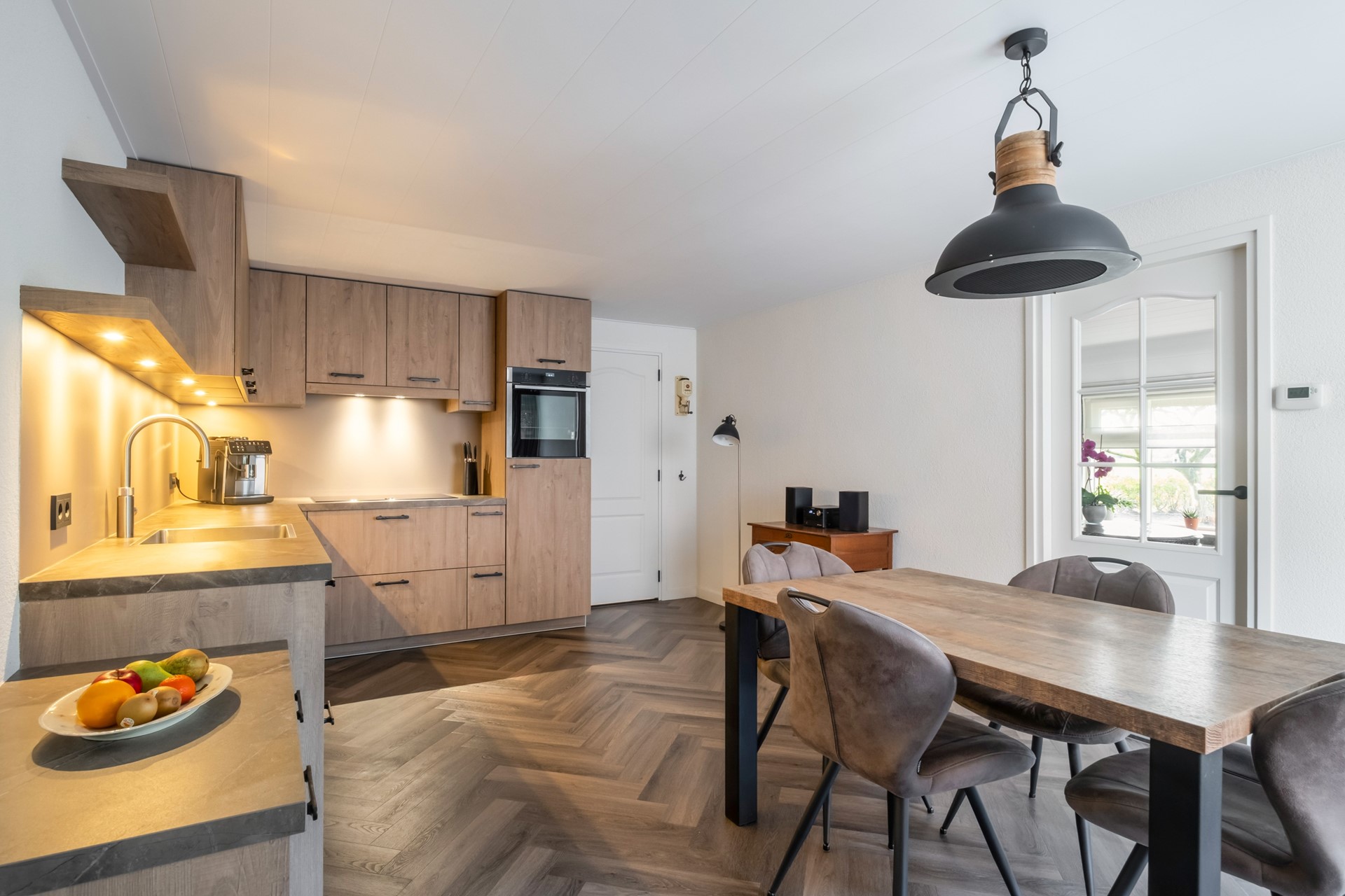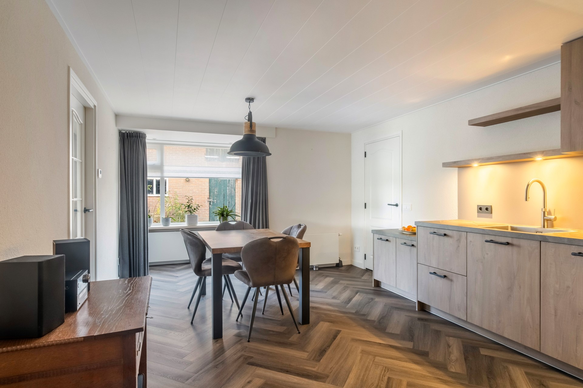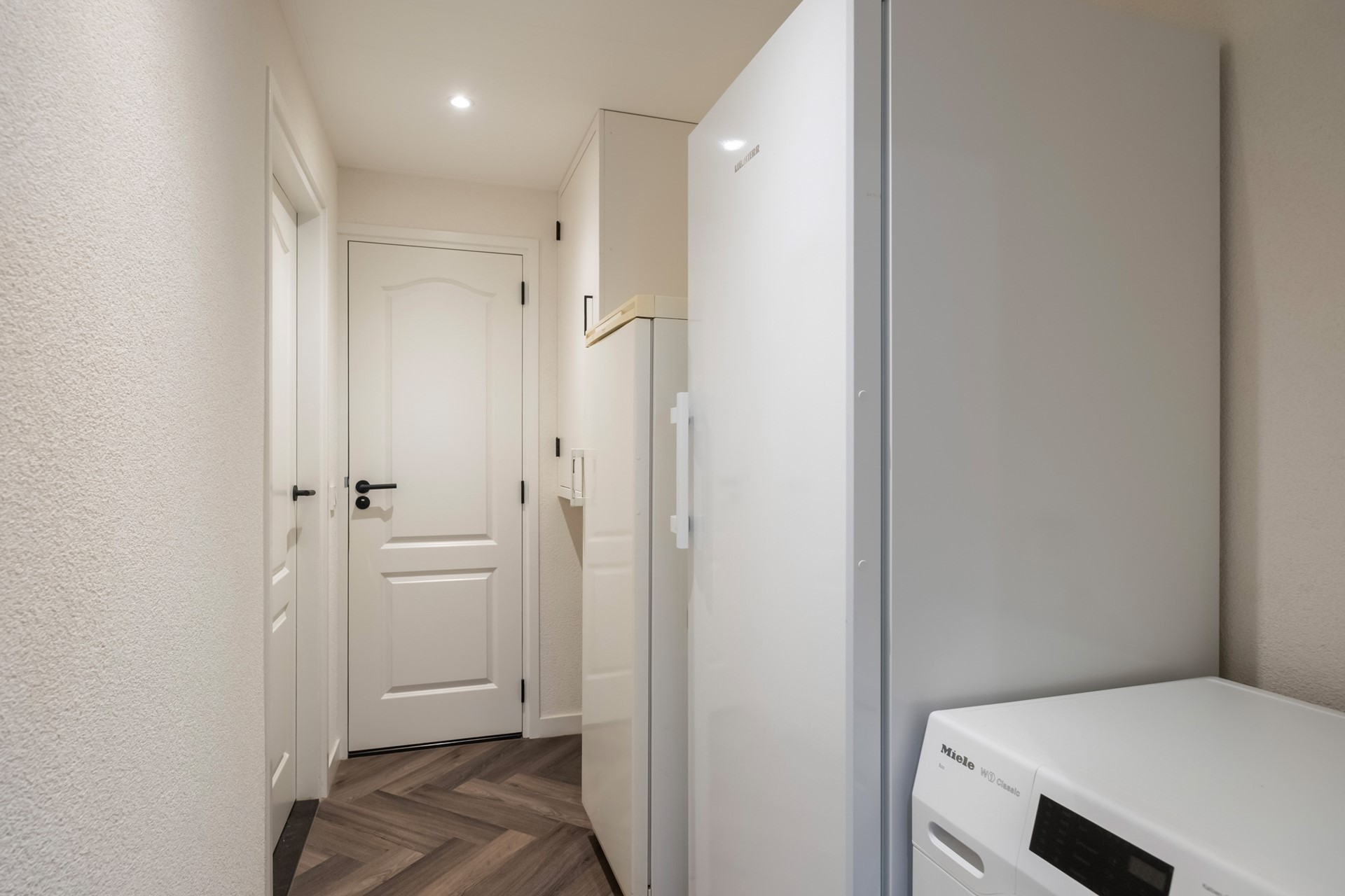 Via de entree kom je in de hal met meerdere inbouwkasten, trapopgang naar de verdieping en toegang tot de woonkeuken. Deze ruime woonkeuken met erker biedt voldoende ruimte voor een gezellige eettafel. De hoekopstelling beschikt over diverse inbouwapparatuur, te weten: een kookplaat, afzuigkap, oven, koelkast, vaatwasser en een Quooker heetwaterkraan. Vervolgens is de woonkamer en de bijkeuken te bereiken. In de bijkeuken vind je de aansluitingen voor een wasmachine en droger. Vanuit hier is zowel de toiletruimte als de badkamer met wastafelmeubel en inloopdouche bereikbaar. In 2020 is de begane grond volledig gemoderniseerd en dat is terug te zien aan de gladde wandafwerking, moderne keuken en badkamer en een visgraat pvc-vloer.